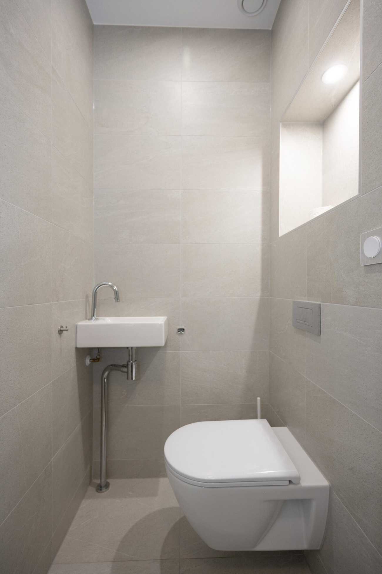 The staircase leads to the first-floor landing, which provides access to three full-sized bedrooms and the centrally located bathroom. The bedrooms are spacious and feature large windows, allowing for pleasant natural light. The bathroom is well-maintained and modern. This fully tiled bathroom is equipped with various high-quality fixtures and fittings. You’ll find a spacious walk-in shower with a glass wall, a comfortable bathtub, a second wall-hung toilet, and a double vanity with a matching vanity unit. The entire floor is fitted with laminate flooring in a warm wood tone, creating a calm and uniform look.