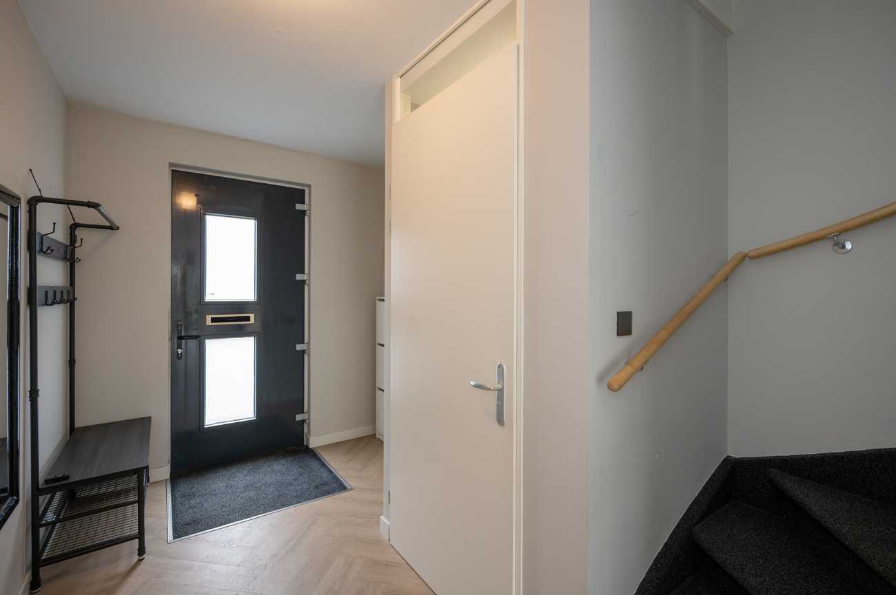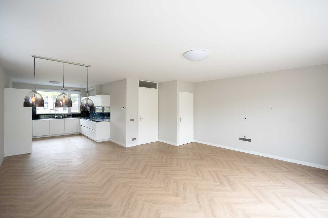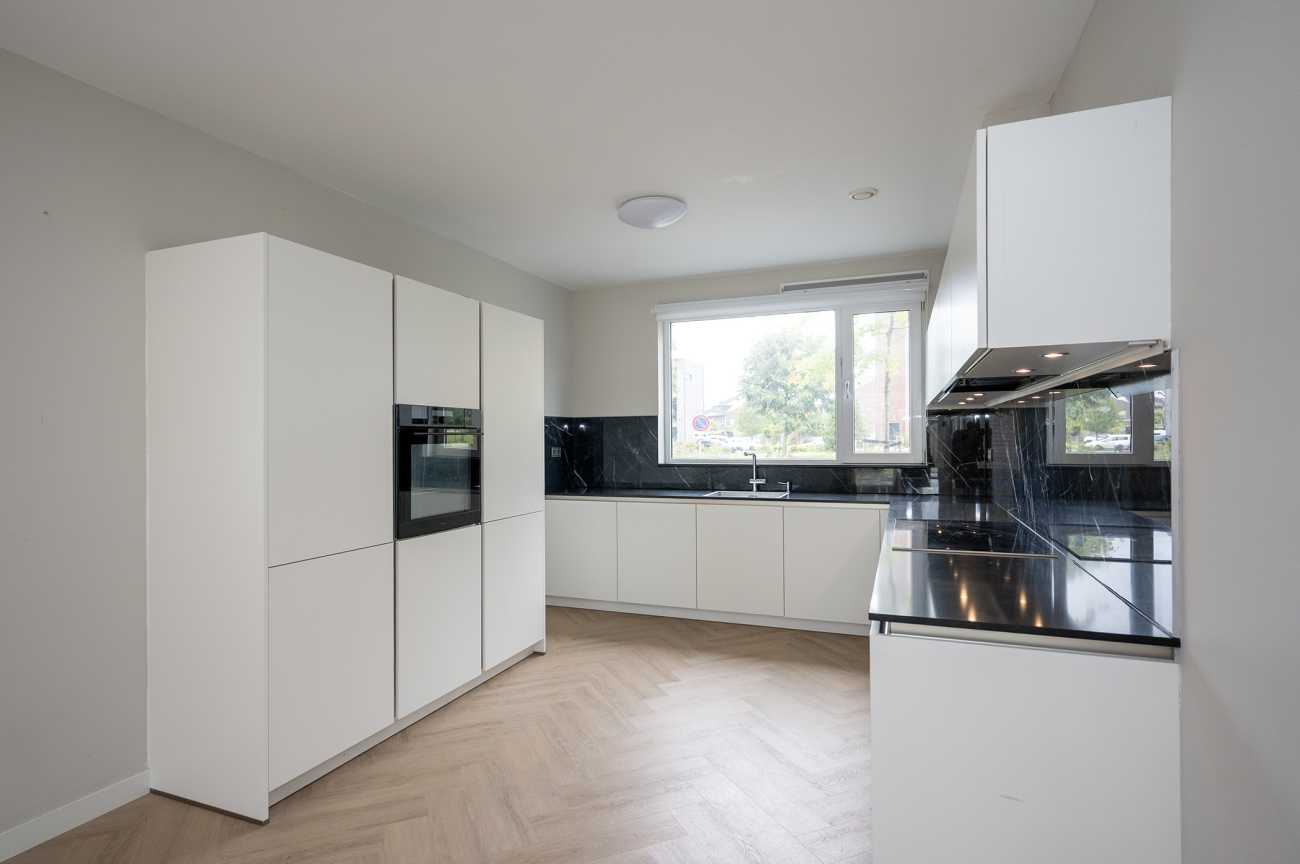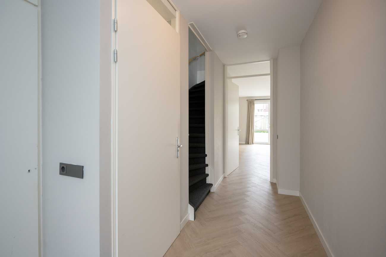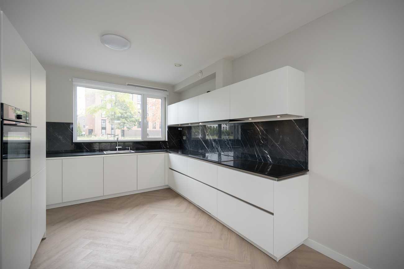 Bij binnenkomst in de woning betreedt u de ruime entreehal. Vanuit deze hal heeft u toegang tot het moderne betegelde toilet met fontein, de meterkast en de trapopgang naar de eerste verdieping. De hal vormt tevens de doorgang naar het leefgedeelte van de woning. Aan de voorzijde bevindt zich de open keuken, die dankzij de raampartijen niet alleen veel daglicht ontvangt, maar tevens een vrij uitzicht biedt over de stadsgracht en het naastgelegen Cascadepark. De keuken is opgesteld in een praktische indeling en is voorzien van diverse inbouwapparatuur, waaronder een keramische kookplaat, een oven, een koelkast, een vaatwasser en een afzuigkap. Deze compleet uitgeruste keuken biedt volop werk- en opbergruimte. Aansluitend bereikt u de royale en sfeervolle woonkamer, welke dankzij de grote raampartij aan de achterzijde en de openslaande deuren naar de tuin een lichte en aangename leefruimte vormt. De achtertuin is gunstig gelegen op het zuiden, waardoor u optimaal profiteert van zonlicht gedurende de dag. Zowel de woonkamer als de hal zijn hoogwaardig afgewerkt met een stijlvolle PVC-vloer in visgraatmotief. Deze vloer is voorzien van comfortabele vloerverwarming, wat bijdraagt aan een aangenaam binnenklimaat gedurende alle seizoenen.