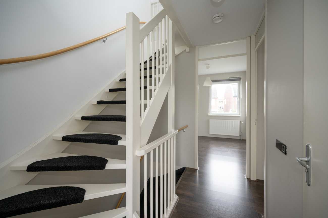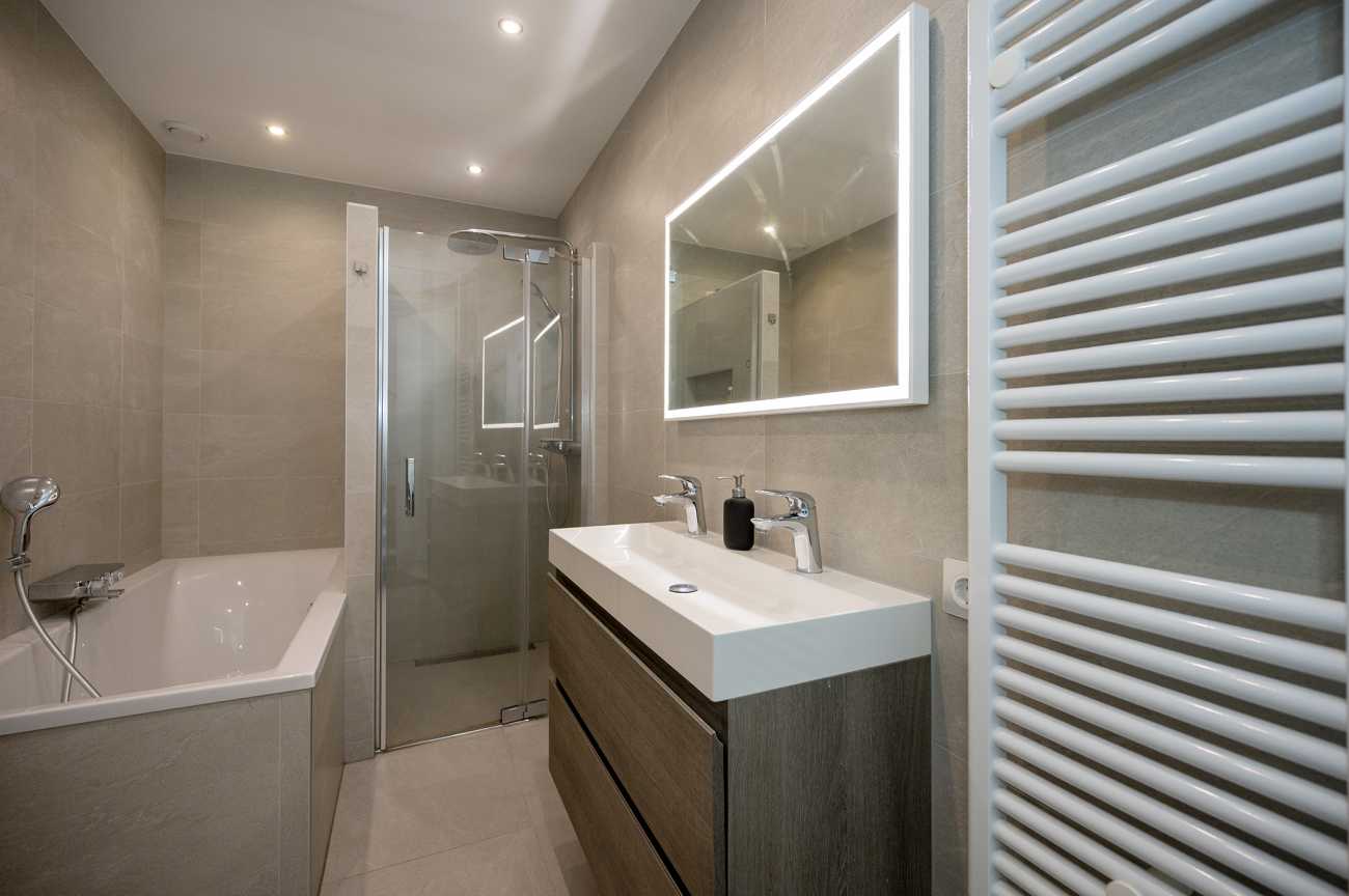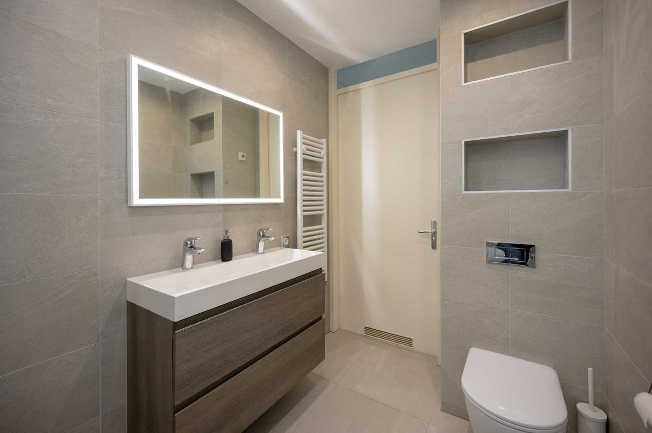 Via de vaste trap bereikt u de overloop op de eerste verdieping, die toegang biedt tot drie volwaardige slaapkamers en de centraal gelegen badkamer. De slaapkamers zijn ruim van opzet en beschikken over grote raampartijen, wat zorgt voor een prettige lichtinval. De badkamer is keurig onderhouden en modern uitgevoerd. Deze volledig betegelde badkamer is voorzien van diverse hoogwaardige sanitaire voorzieningen. U treft hier een ruime inloopdouche met glazen wand, een comfortabel ligbad, een tweede, hangend toilet en een dubbele wastafel met bijpassend wastafelmeubel. De gehele verdieping is voorzien van een doorgelegde laminaatvloer in een warme houttint, wat zorgt voor een rustige en uniforme uitstraling.