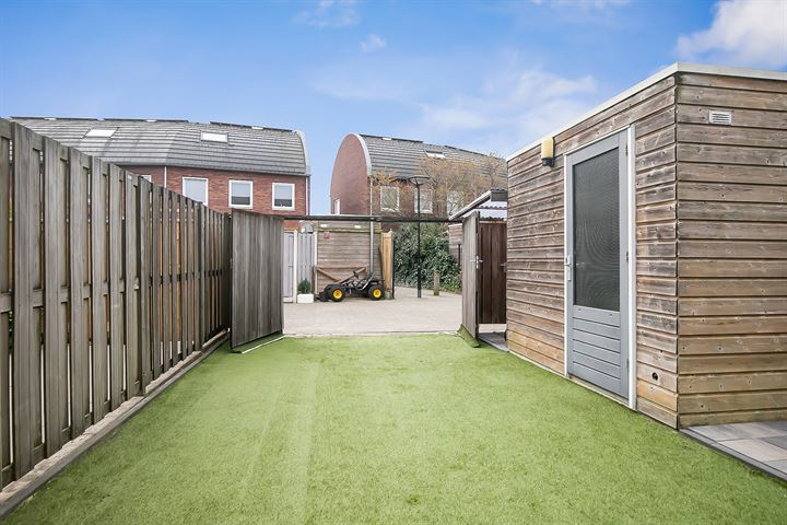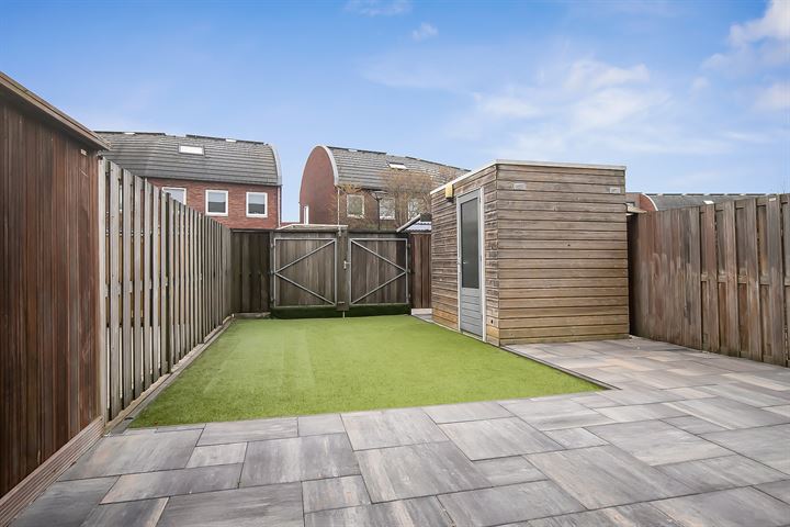 De achtertuin is gunstig gelegen op het zuiden, wat betekent dat u gedurende de gehele dag kunt profiteren van optimale zoninval. Deze zonrijke ligging maakt de tuin uitermate geschikt voor het creëren van een comfortabele buitenruimte, waar u in alle rust kunt ontspannen of gasten kunt ontvangen tijdens de warmere maanden. De tuin is onderhoudsvriendelijk aangelegd en voorzien van kunstgras en strakke, grote sierbestrating. Aan de achterzijde van de tuin bevindt zich een praktische, vrijstaande houten berging. Deze biedt voldoende ruimte voor het opbergen van tuinmeubilair, (tuin)gereedschap, fietsen of andere opslagbehoeften. Via de afsluitbare achterom is er directe toegang tot het achtergelegen, gezamenlijke binnenterrein. Hier beschikt u over een eigen, toegewezen parkeerplaats.