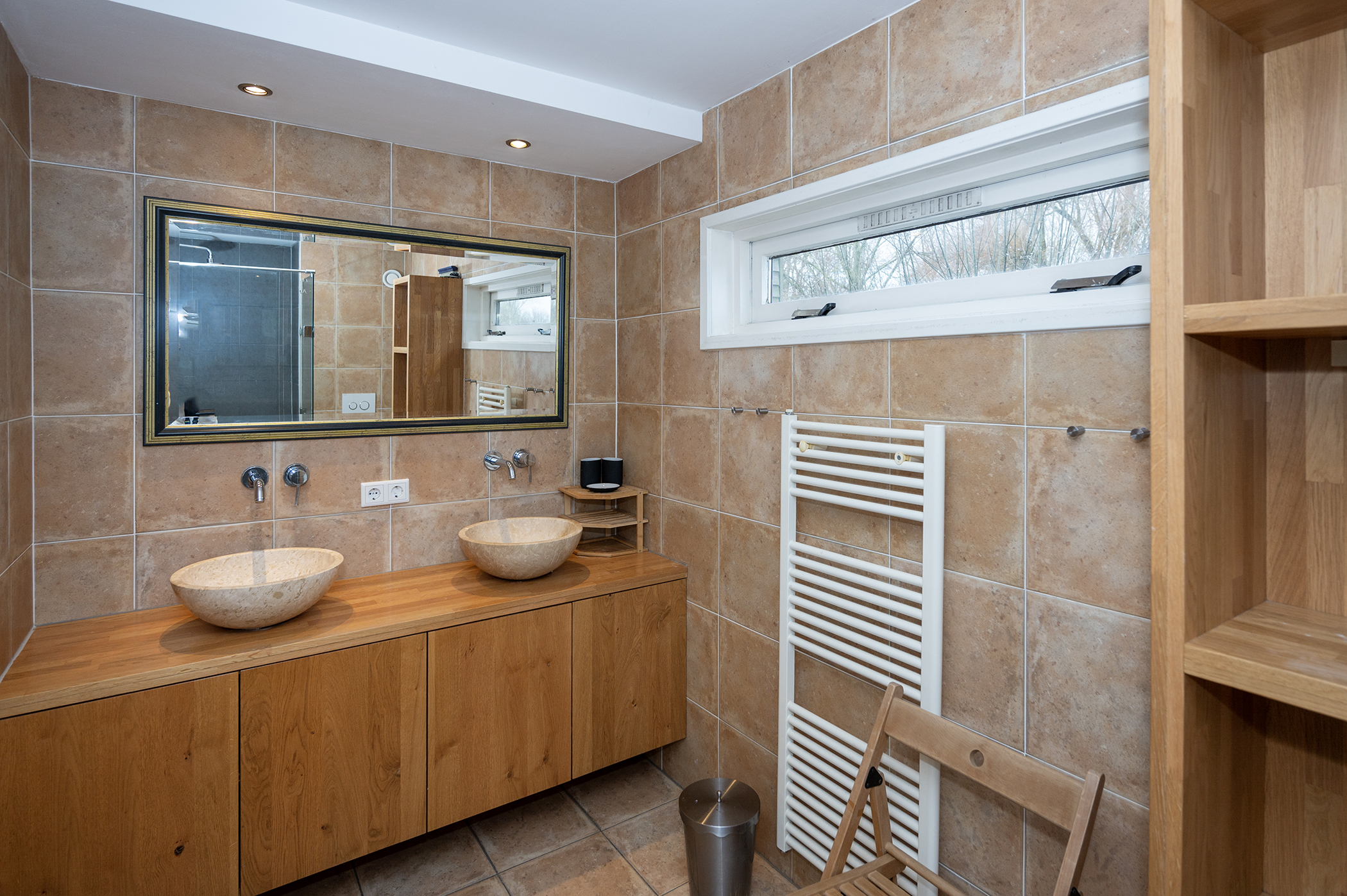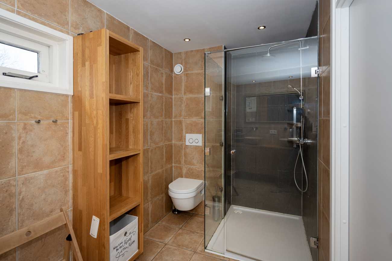 Op de eerste verdieping bevindt zich de overloop, die toegang biedt tot drie ruime slaapkamers, de badkamer en de vaste trap naar de tweede verdieping. Een van de slaapkamers beschikt over een praktische inbouwkast. De moderne badkamer is uitgerust met twee wastafels, een toilet, een douche en een designradiator.