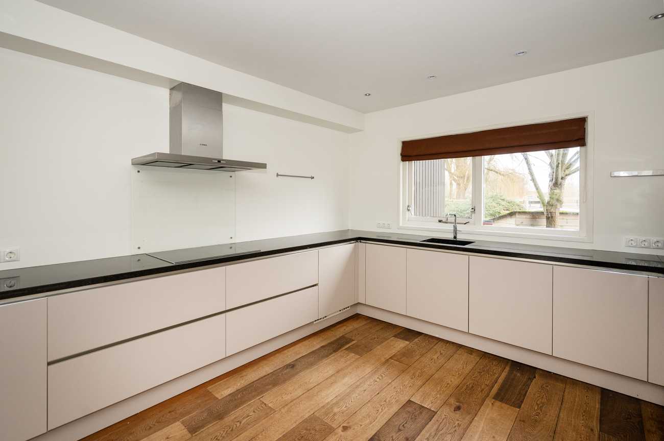 Bij binnenkomst betreedt u de entree met een hal die toegang biedt tot de meterkast, een garderobe, een separaat toilet met fonteintje, en de trap naar de eerste verdieping. Vanuit de hal komt u in de ruime, lichte woonkamer met open keuken. De luxe inbouwkeuken is volledig uitgerust en beschikt over een combi-oven, een ingebouwde koffiemachine, een vaatwasser, twee koelkasten, een inductiekookplaat en een afzuigkap. Via de openslaande deuren in de woonkamer heeft u toegang tot de royale achtertuin. De gehele begane grond is afgewerkt met een sfeervolle houten vloer.