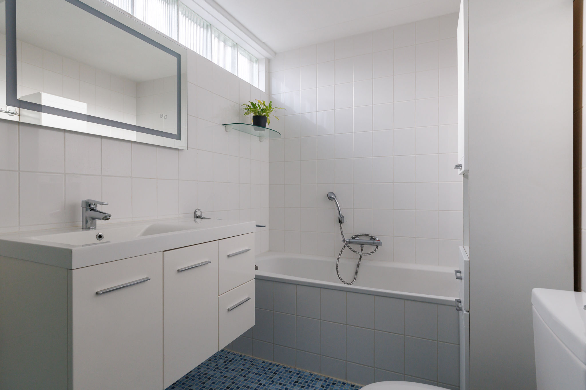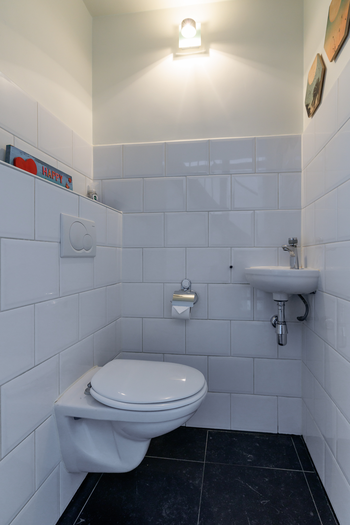 The stairs lead to the wonderfully bright landing with access to all rooms. On this floor, you’ll find three bedrooms, a bathroom, and a storage room with a washing machine connection. The largest bedroom is located at the front of the house, while the other two are at the rear. All rooms enjoy excellent natural light, and the walls and ceilings are neatly finished. The entire floor has laminate flooring. The fully tiled bathroom is equipped with a bathtub, shower, second toilet, sink, and designer radiator.