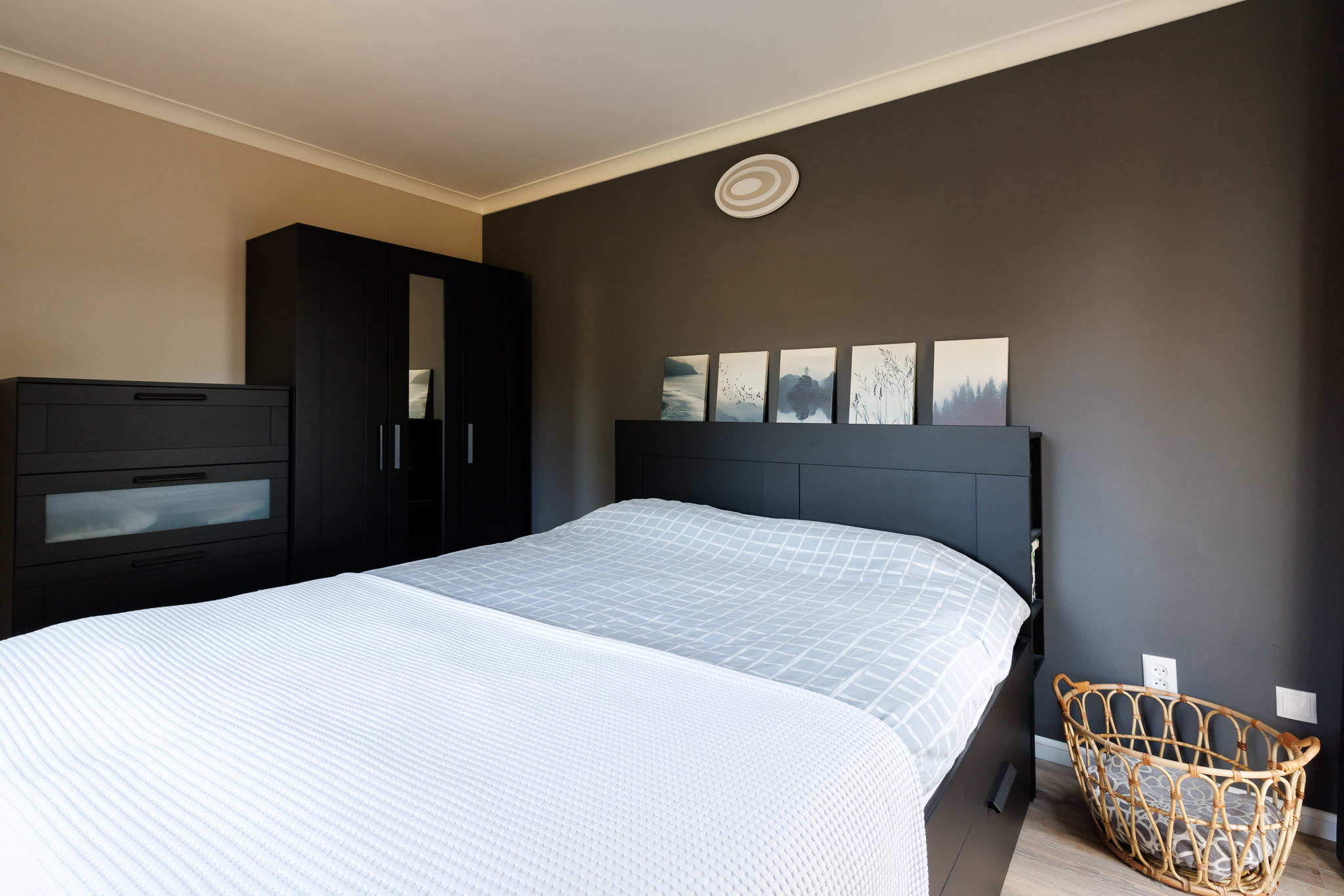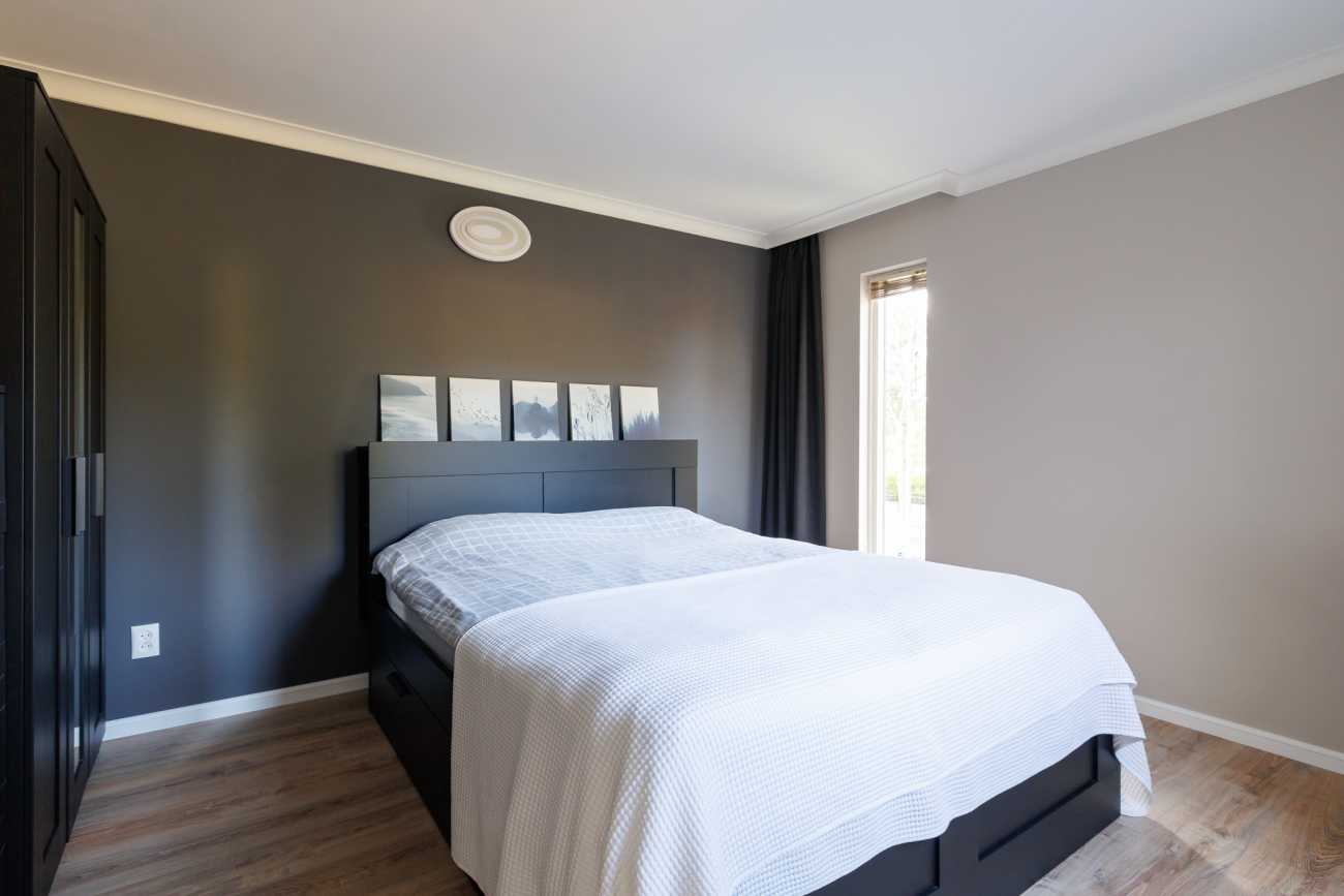 You enter the house through the entrance hall via the driveway, where you can park several cars. The hallway features many windows at the front of the house, providing beautiful natural light. In the hall, you will find the toilet, the meter cupboard, the access door to the integral garage, the staircase to the upper floor, and the access door to the living room. The garden-facing living room has French doors and a separate door to the back garden and features neat laminate flooring with underfloor heating. The living room overlooks the back garden and has a cozy and homely feel. Because there are also windows at the side of the house, plenty of natural light enters throughout the day. The semi-open kitchen is located at the front of the house. This kitchen features ample cupboard space, a double sink, and a granite countertop. You’ll want for nothing here, as you can use the built-in appliances, including a dishwasher, oven, and combination microwave. In the center of the kitchen is a cooking island with an induction cooktop and extractor hood. You can also sit at the bar here, perfect for a chat while cooking!