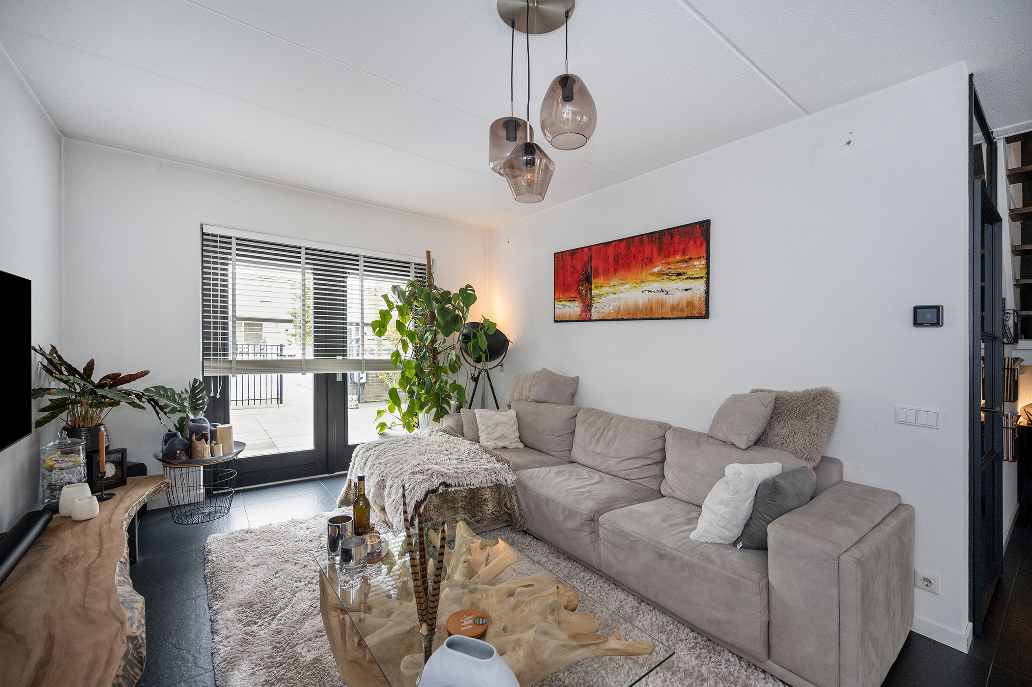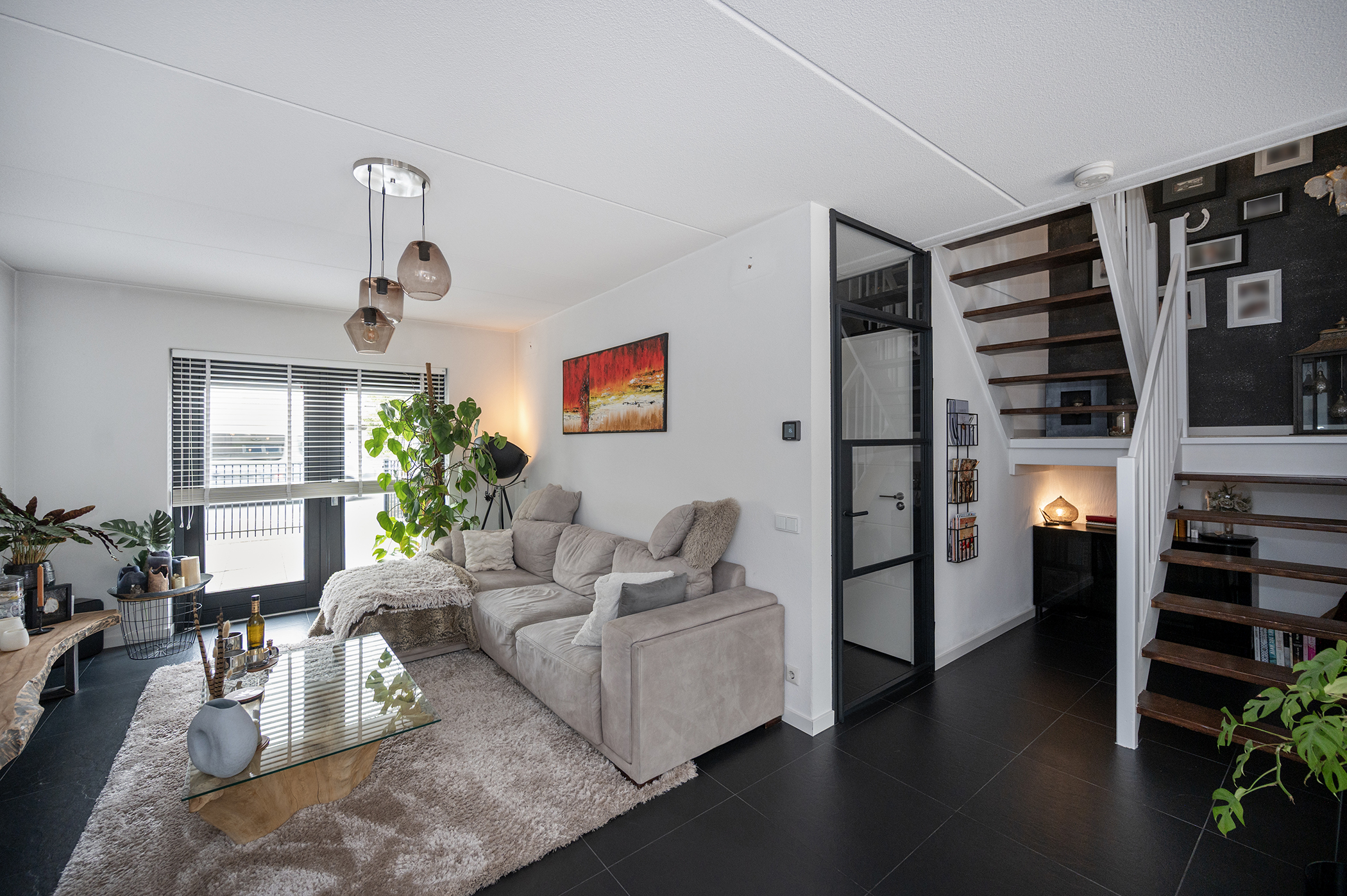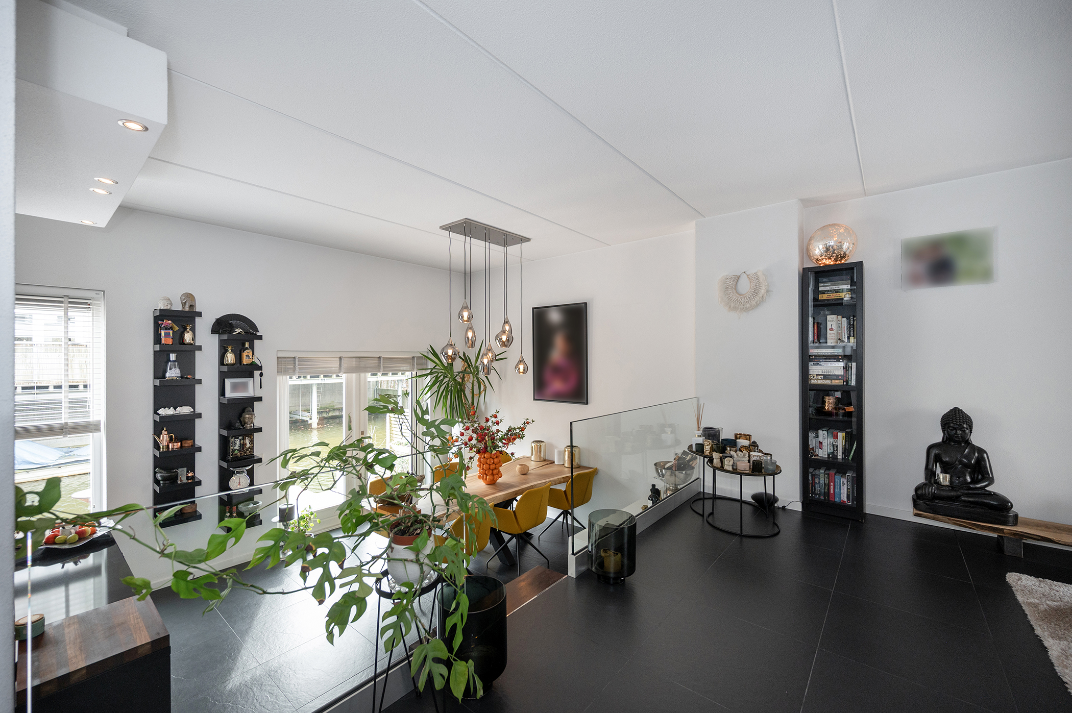 De woning heeft een speelse splitlevelindeling. De woonkamer bevindt zich op een hoger niveau en biedt toegang tot de voortuin middels de openslaande deuren. Dankzij de grote raampartijen is dit een bijzonder lichte en prettige leefruimte. De vloer is afgewerkt met tegels en voorzien van comfortabele vloerverwarming.
