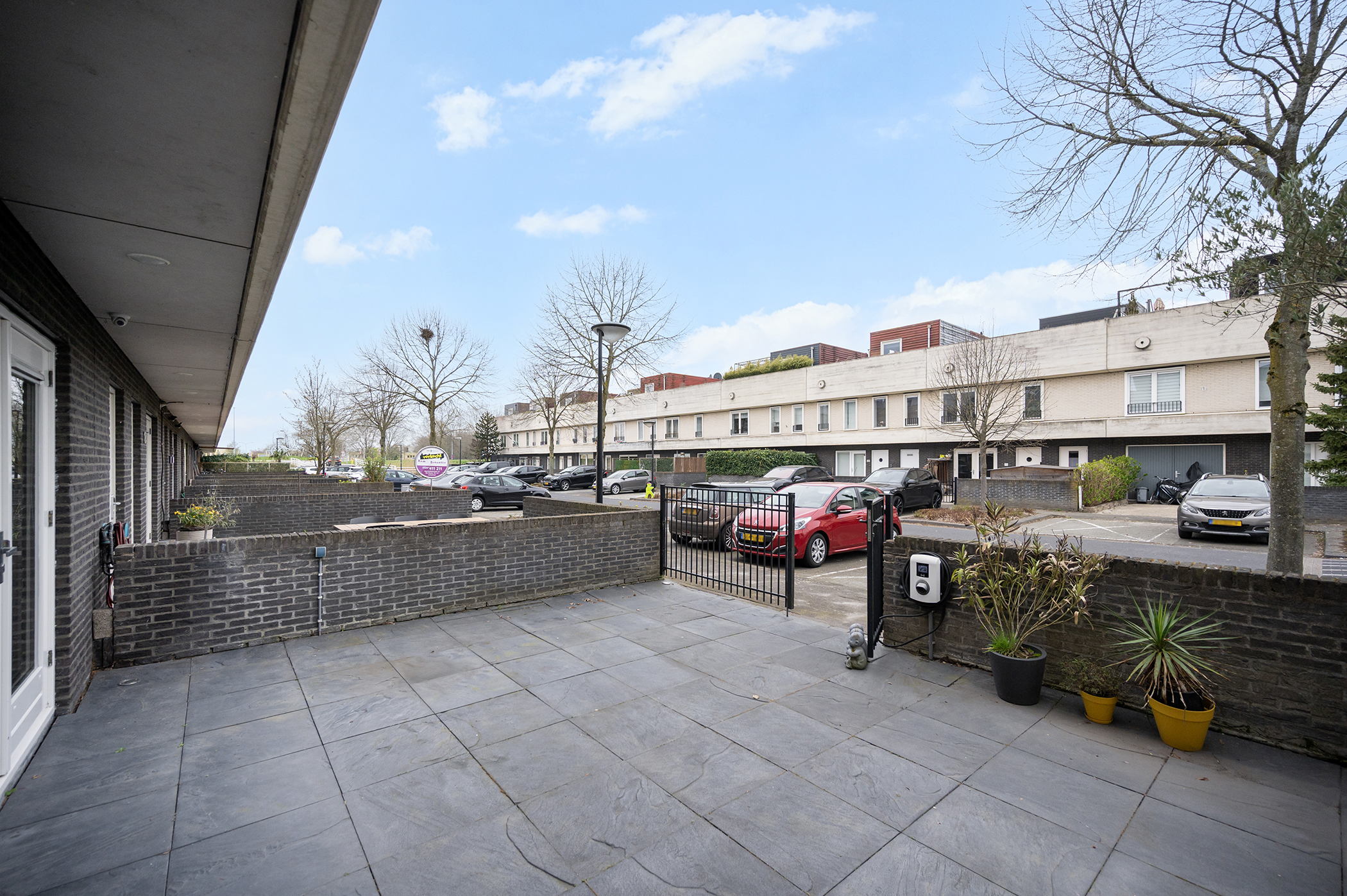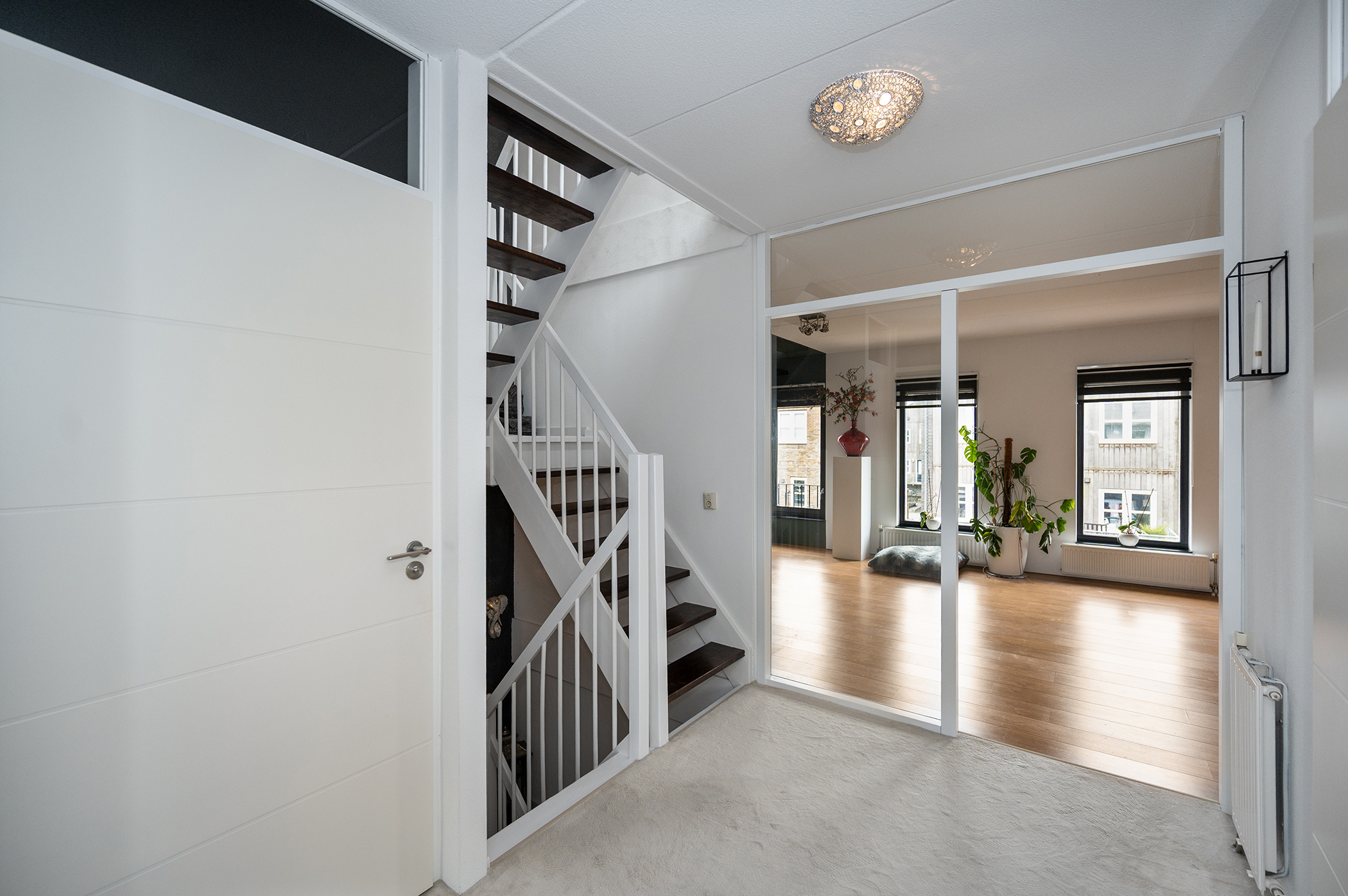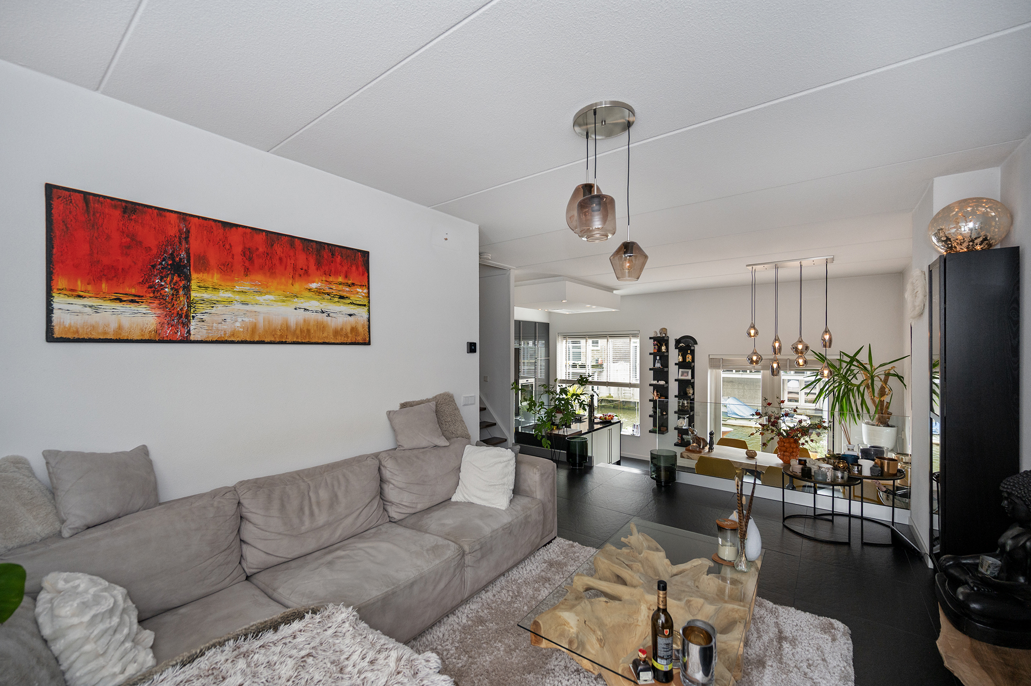 De woning heeft een speelse splitlevelindeling. De woonkamer bevindt zich op een hoger niveau en biedt toegang tot de voortuin middels de openslaande deuren. Dankzij de grote raampartijen is dit een bijzonder lichte en prettige leefruimte. De vloer is afgewerkt met tegels en voorzien van comfortabele vloerverwarming.