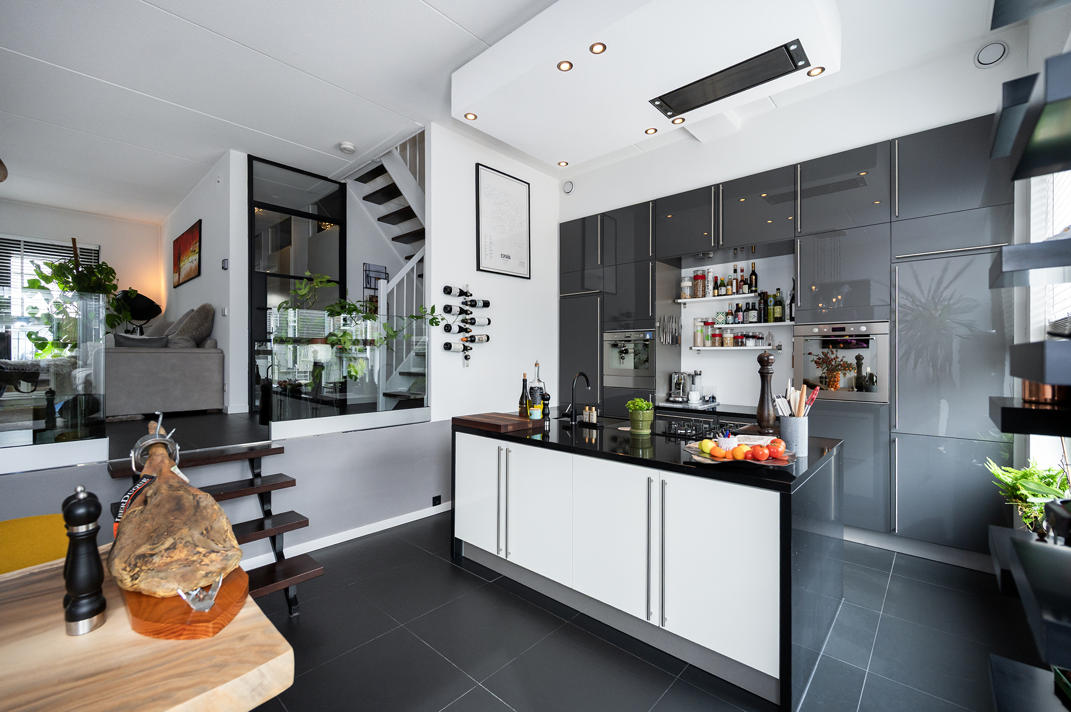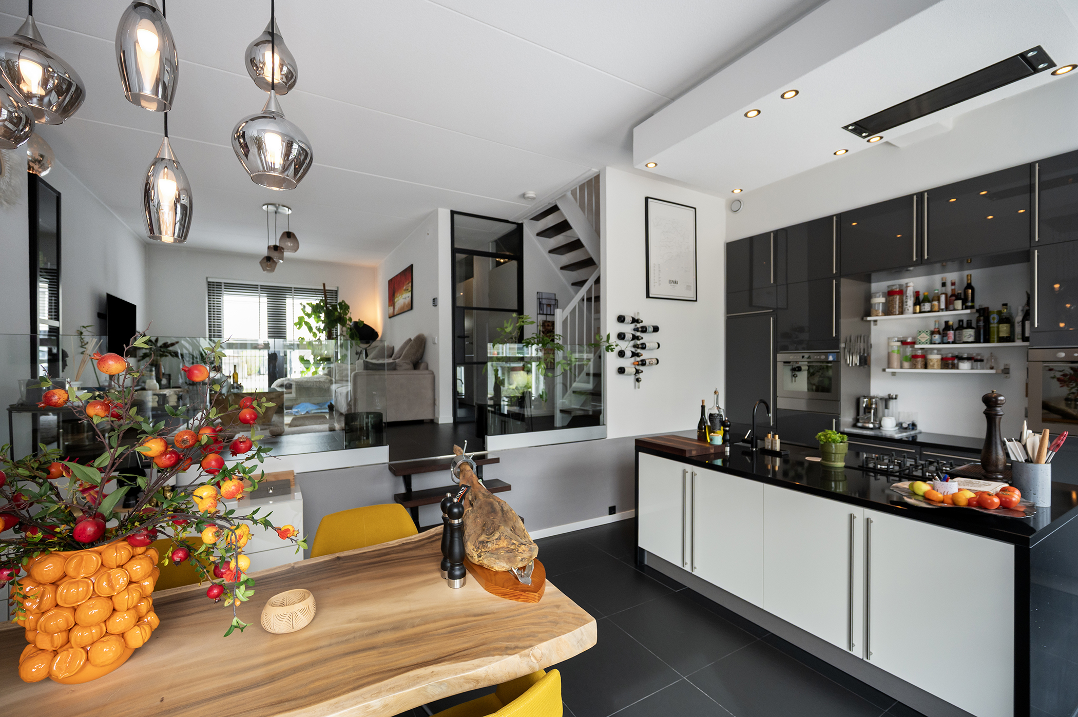 – Luxe woonkeuken met hoog plafond en plafondhoge kasten