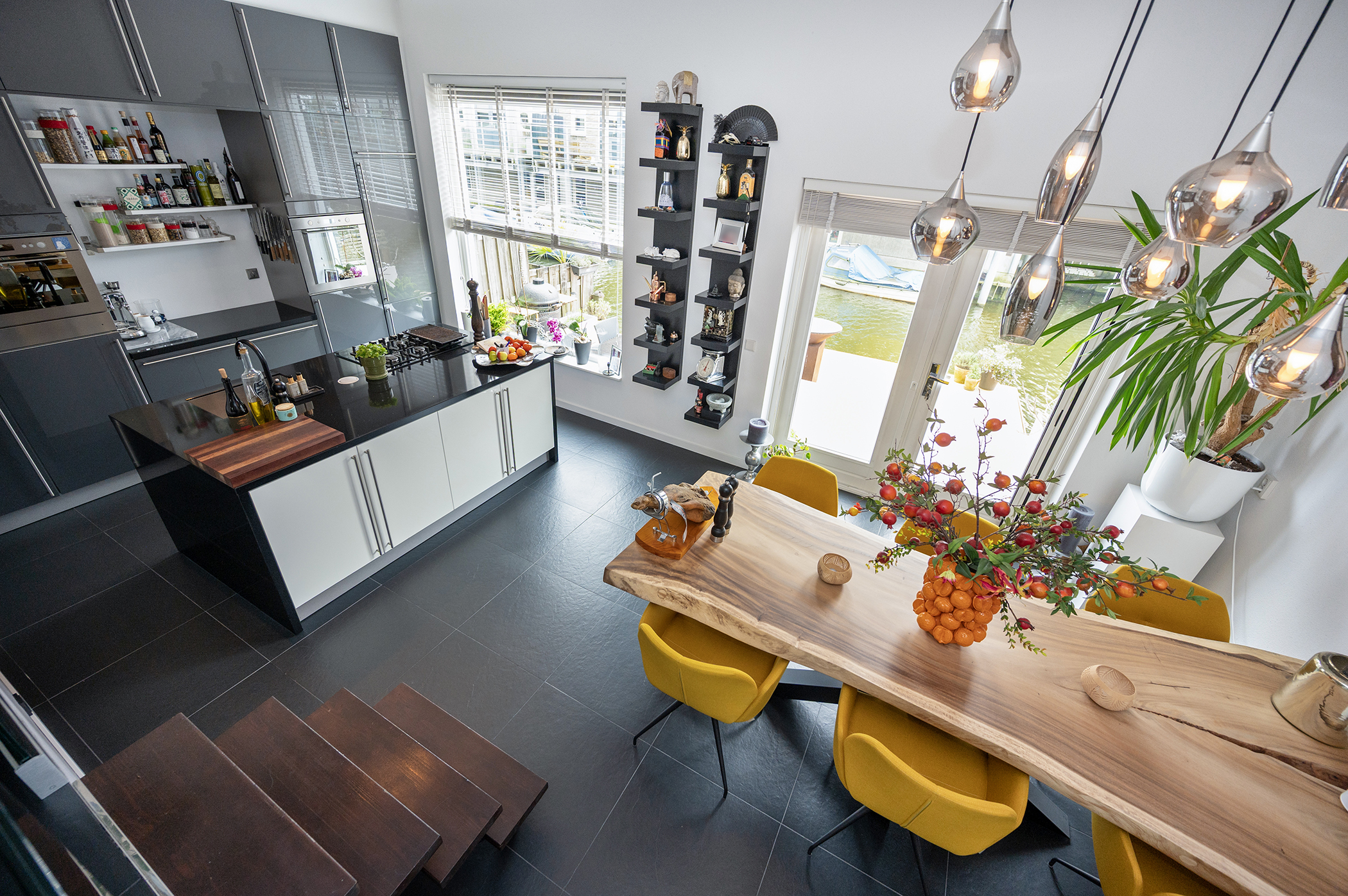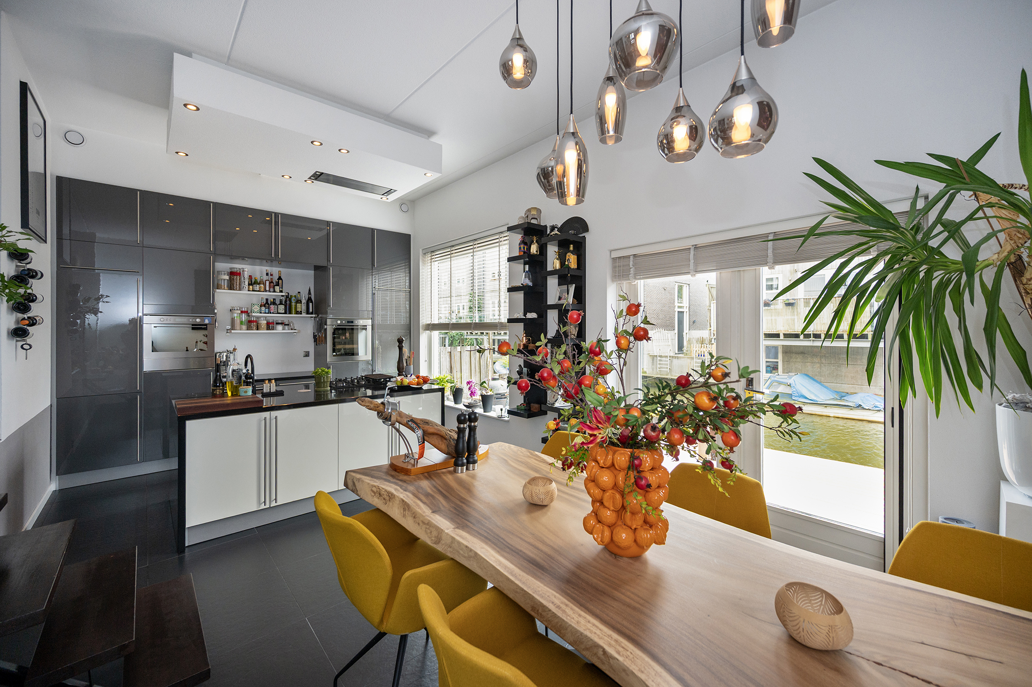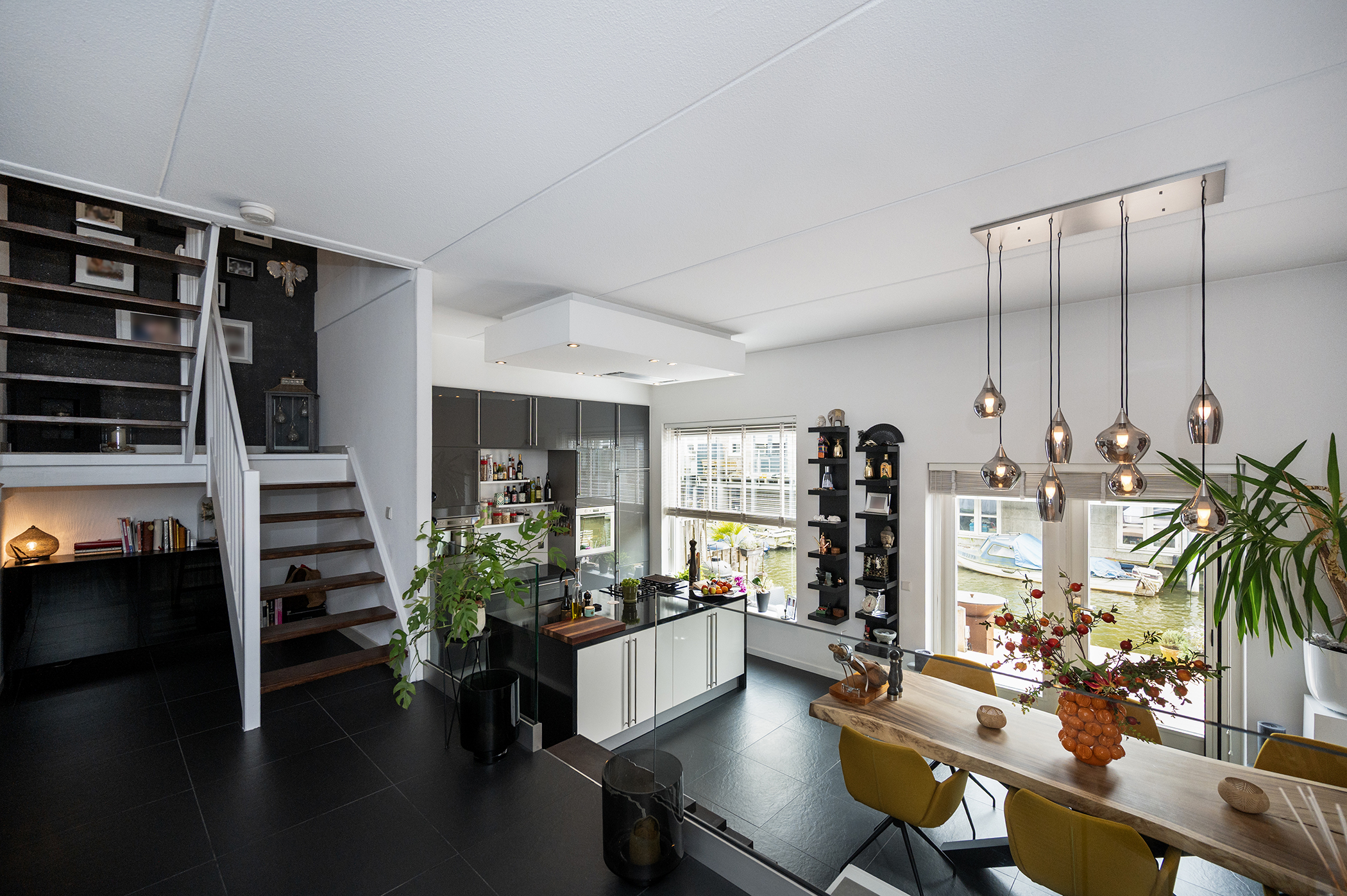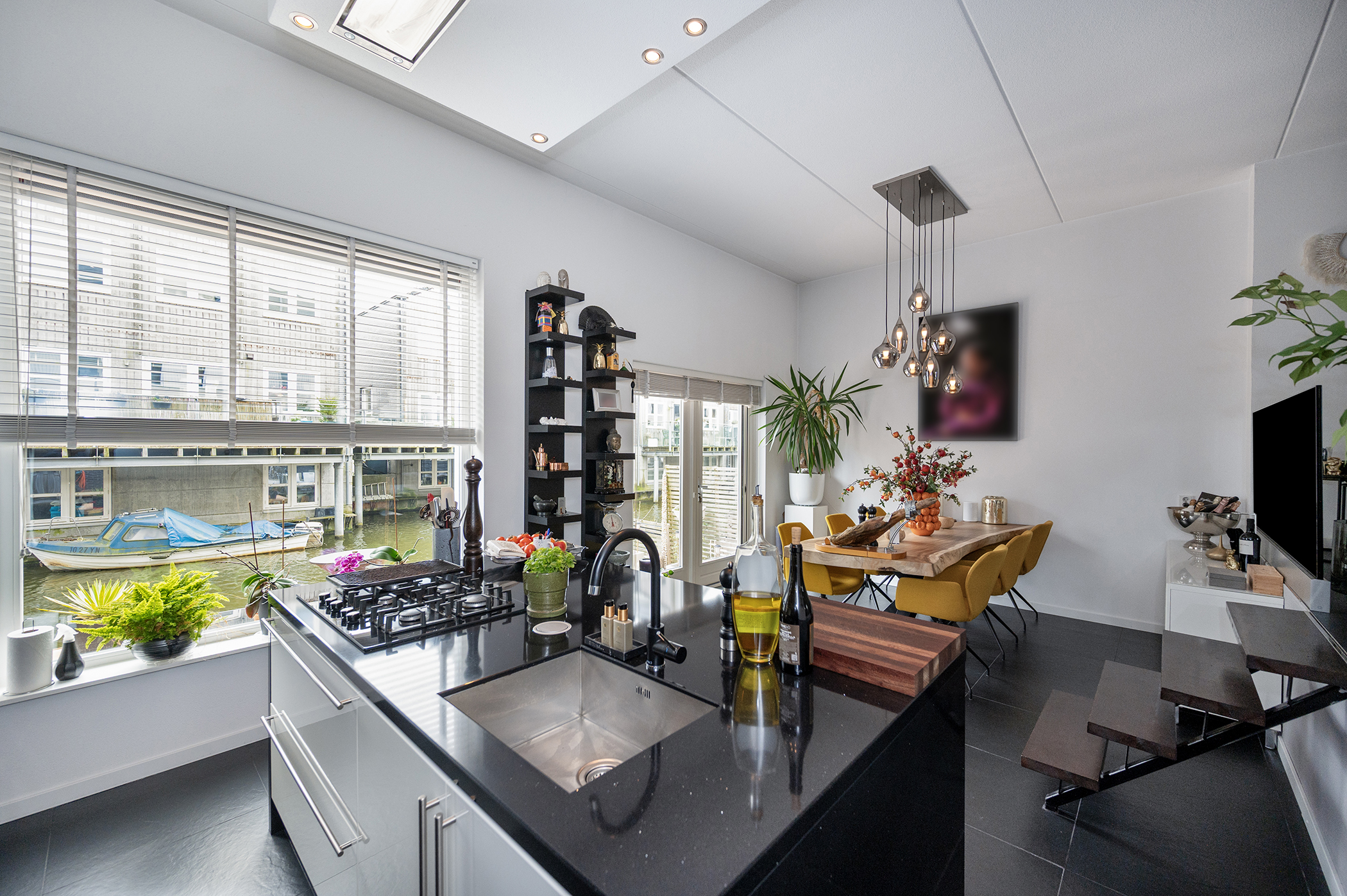 Via een trap naar beneden bereikt u de indrukwekkende woonkeuken, een echte eyecatcher van de woning. Hier ervaart u direct het hoge plafond in combinatie met de plafondhoge kasten van maar liefst 3,42 meter, wat zorgt voor een luxe en ruimtelijk gevoel. De woonkeuken met groot eiland is voorzien van divers inbouwapparatuur zoals, een combi magnetron met warmhoud lade en aparte oven, vaatwasser, groot fornuis en een koel-vries combinatie. De woonkeuken ligt direct aan het water en biedt toegang tot het ruime terras welke vergroot is met een drijvend vlonder van ruim 12m2. Hier geniet u optimaal van de unieke ligging en het buitenleven. Middels de aanwezige vergunning kunt u de vlonder vervanger voor een vast object.