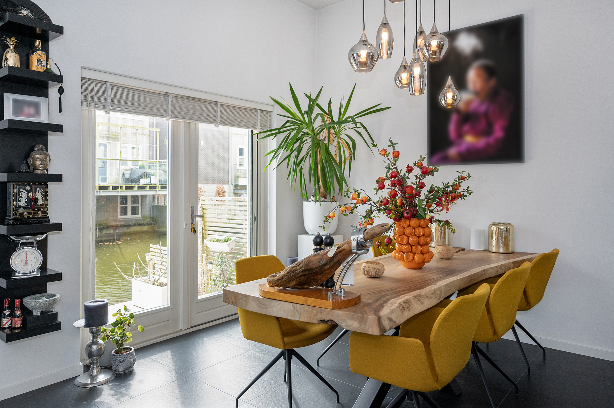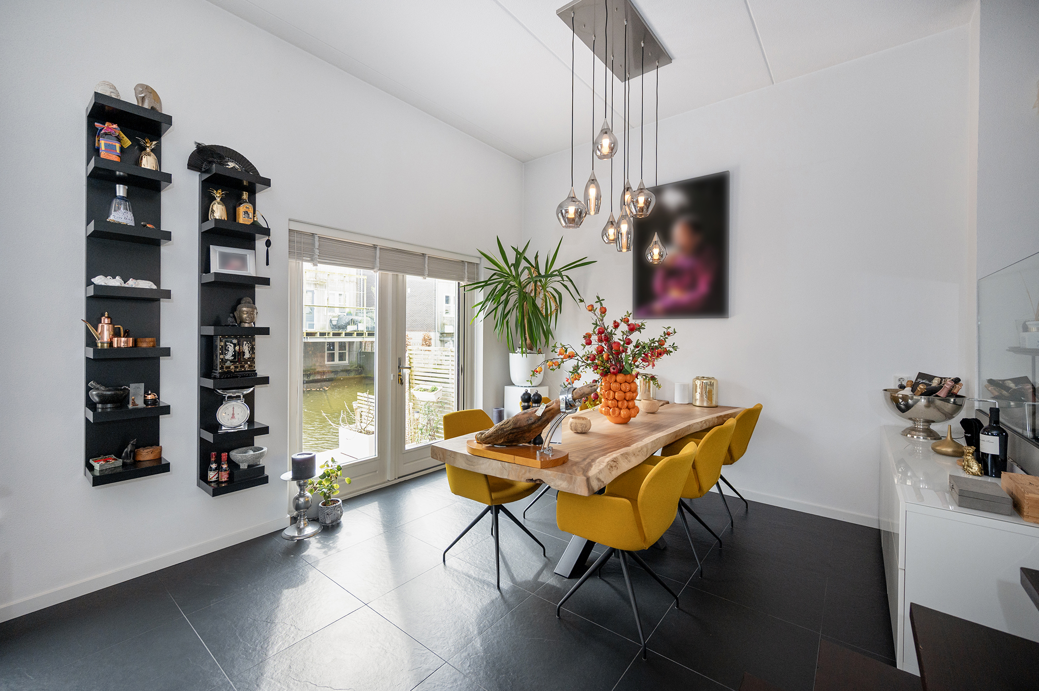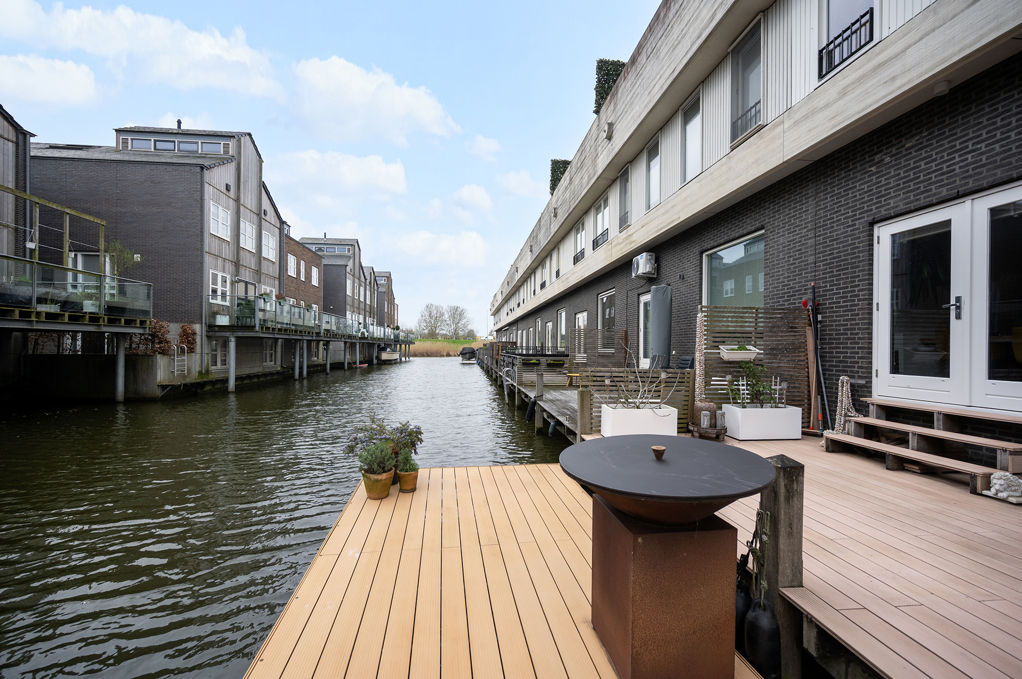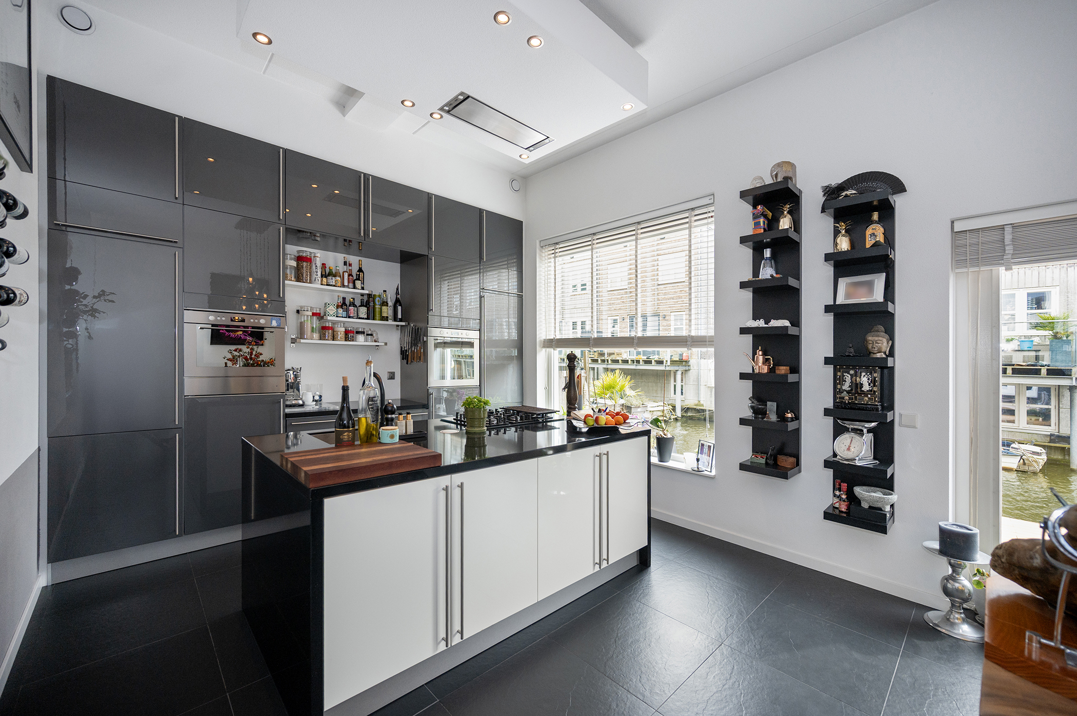 Via een trap naar beneden bereikt u de indrukwekkende woonkeuken, een echte eyecatcher van de woning. Hier ervaart u direct het hoge plafond in combinatie met de plafondhoge kasten van maar liefst 3,42 meter, wat zorgt voor een luxe en ruimtelijk gevoel. De woonkeuken met groot eiland is voorzien van divers inbouwapparatuur zoals, een combi magnetron met warmhoud lade en aparte oven, vaatwasser, groot fornuis en een koel-vries combinatie. De woonkeuken ligt direct aan het water en biedt toegang tot het ruime terras welke vergroot is met een drijvend vlonder van ruim 12m2. Hier geniet u optimaal van de unieke ligging en het buitenleven. Middels de aanwezige vergunning kunt u de vlonder vervanger voor een vast object.