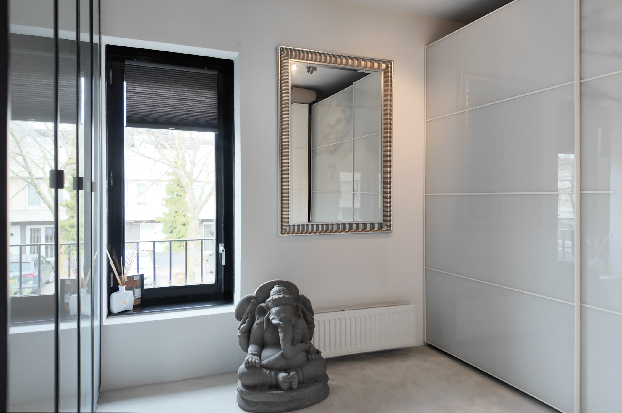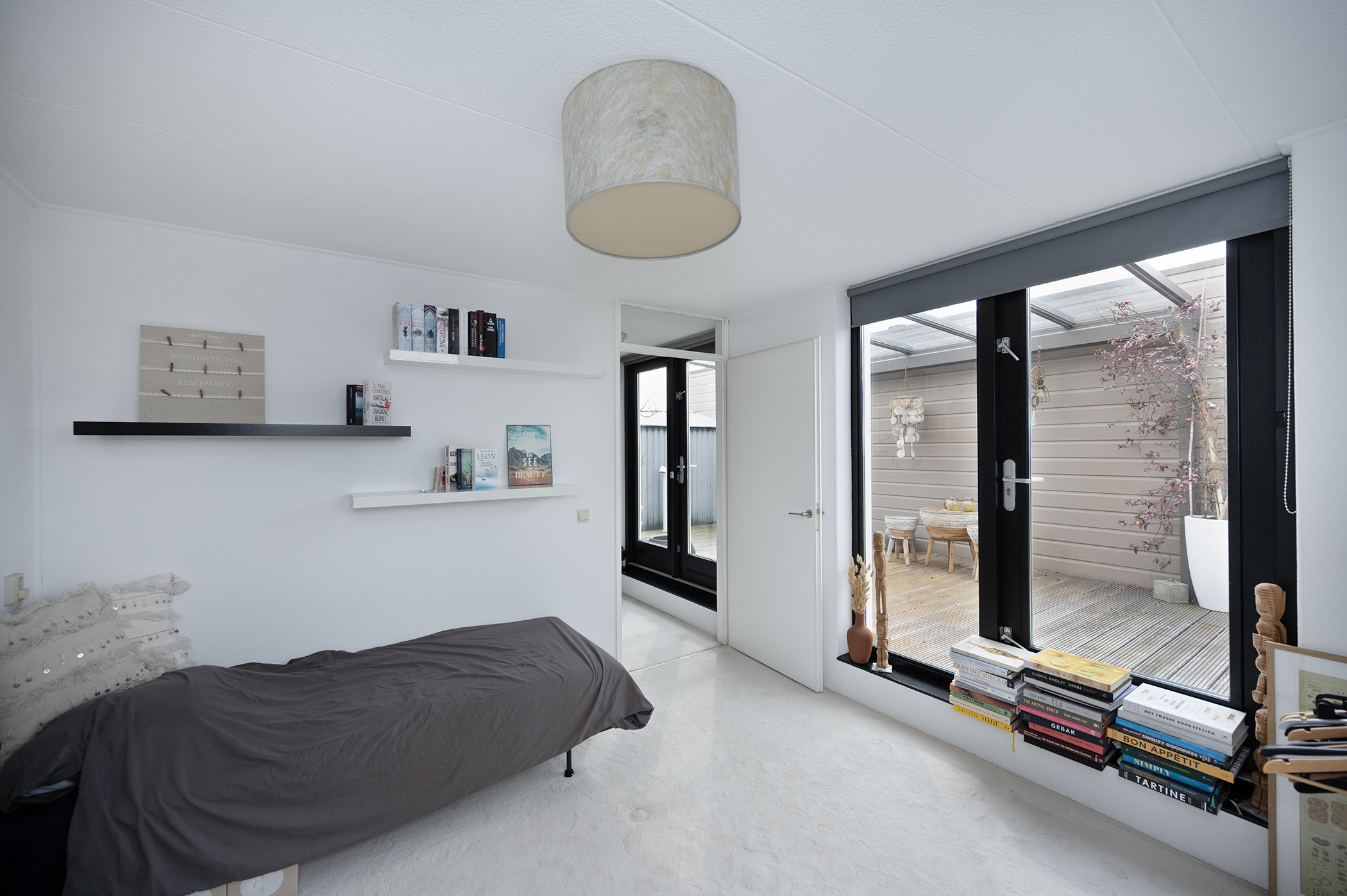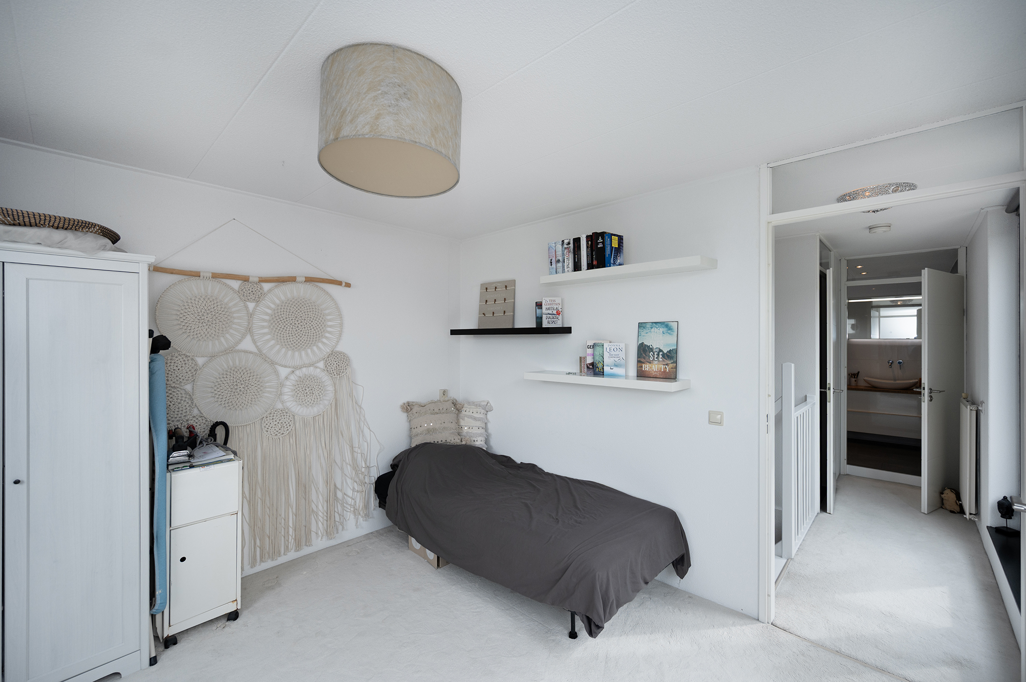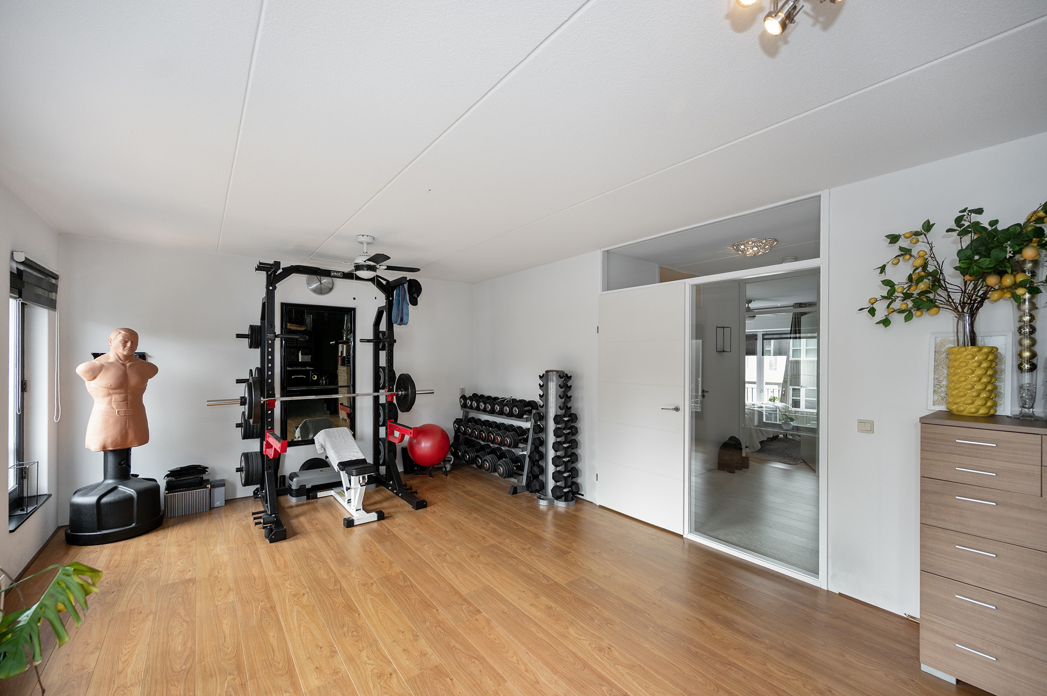 Op de eerste verdieping bevindt zich een woning brede slaapkamer aan de waterzijde. Deze ruimte is momenteel in gebruik als multifunctionele werk-/sportruimte, maar kan eenvoudig worden opgesplitst in twee slaapkamers. De verdieping is voorzien van een combinatie van een laminaatvloer en lichte vloerbedekking.