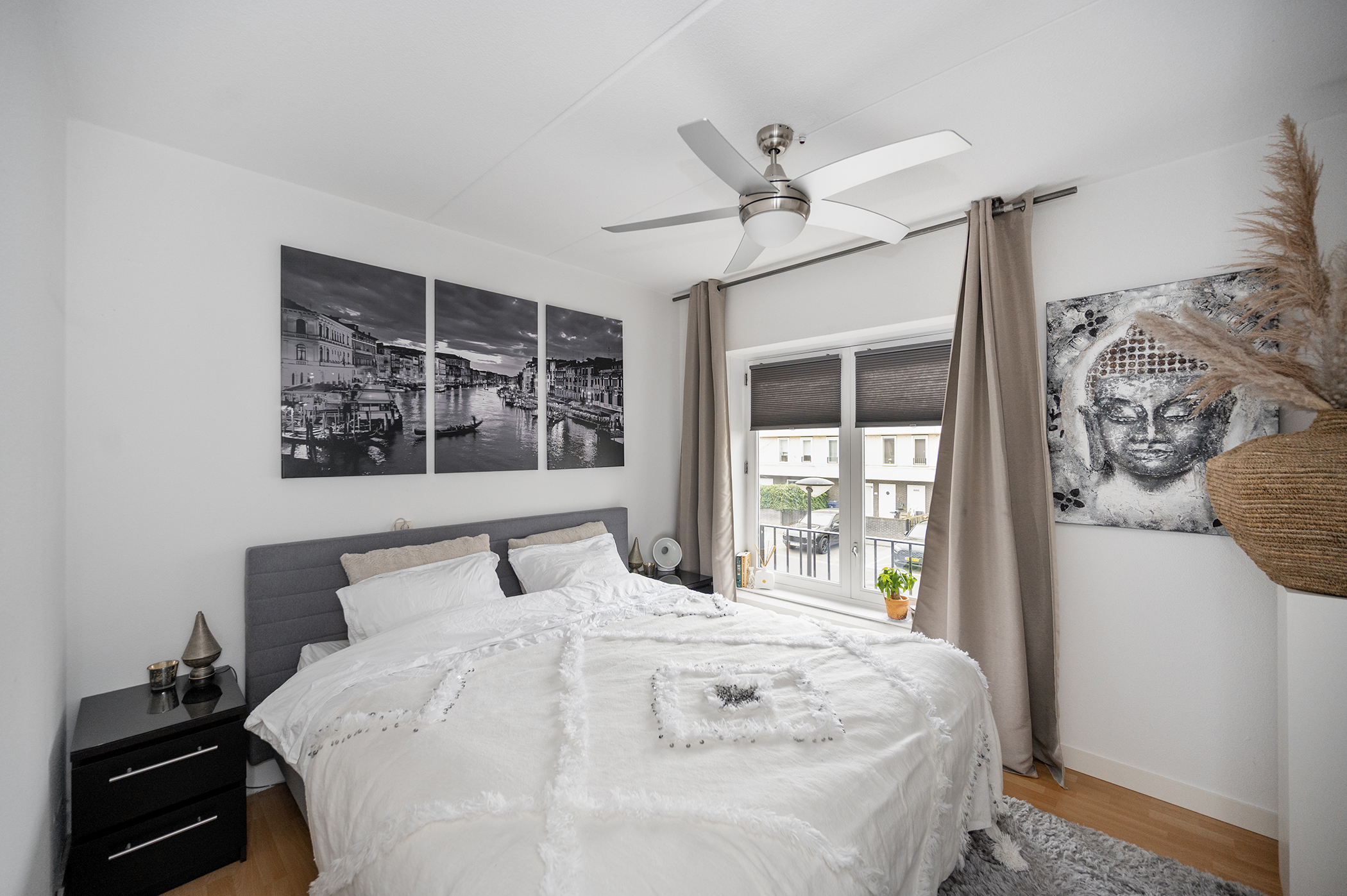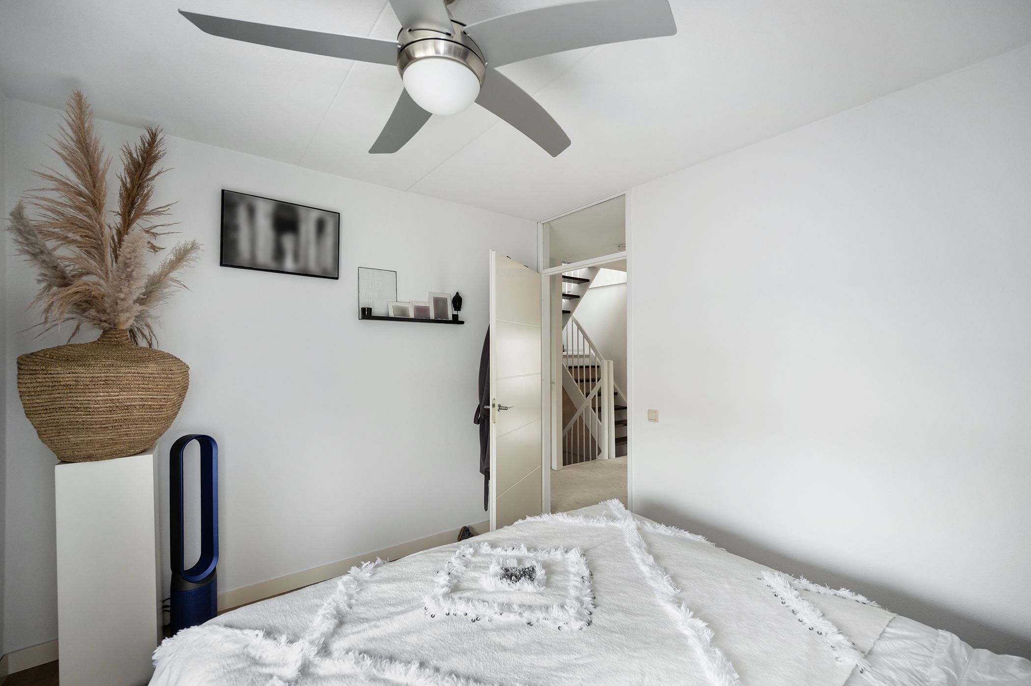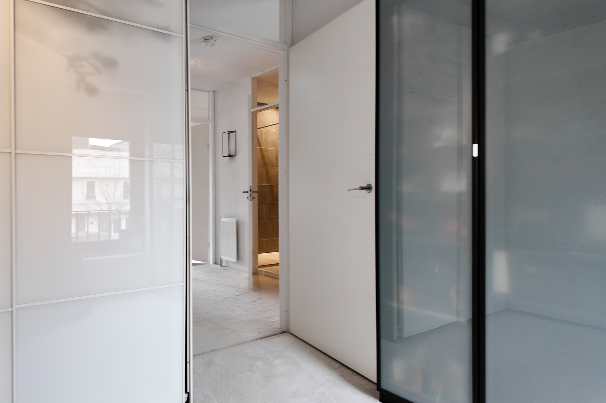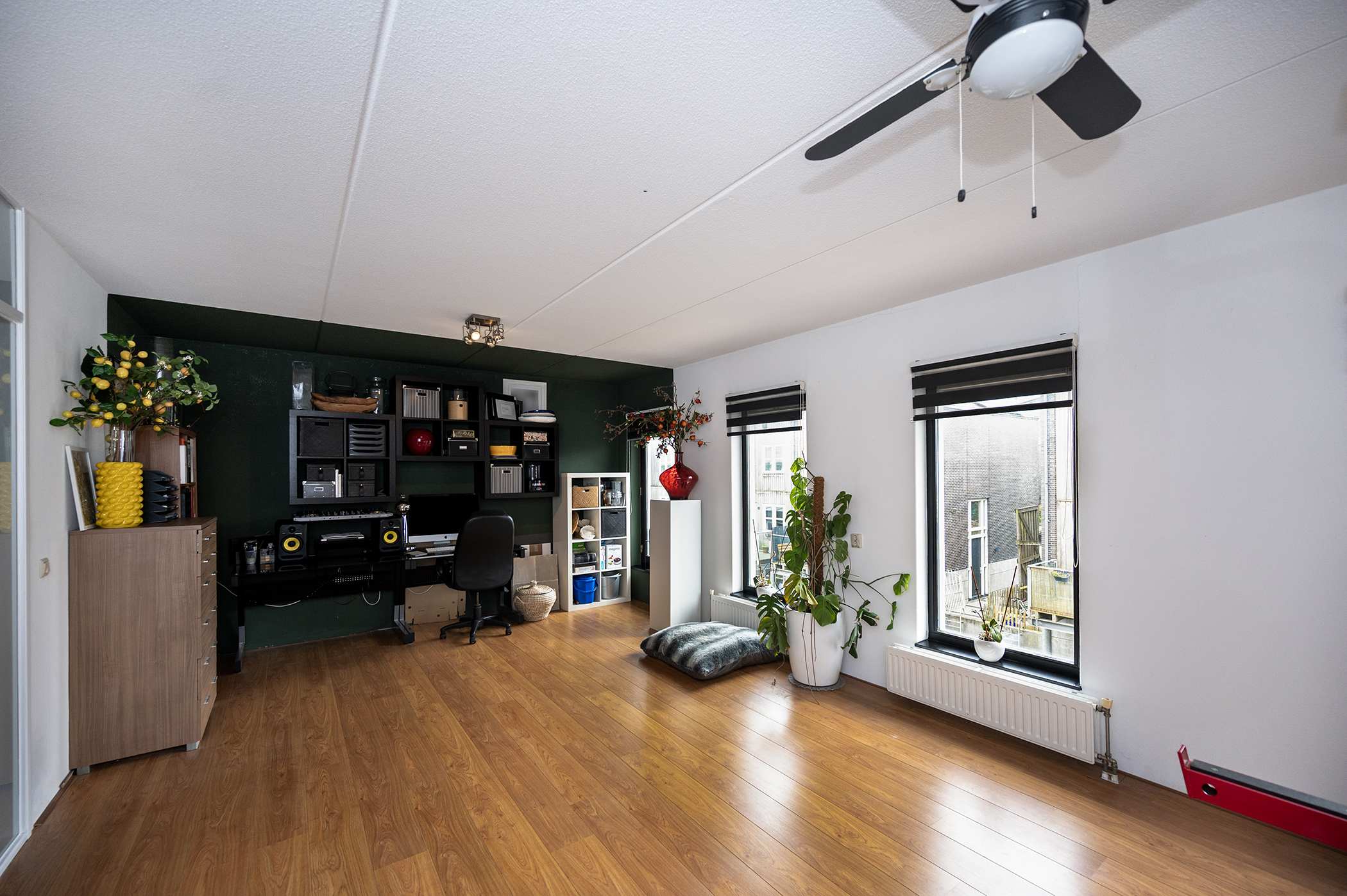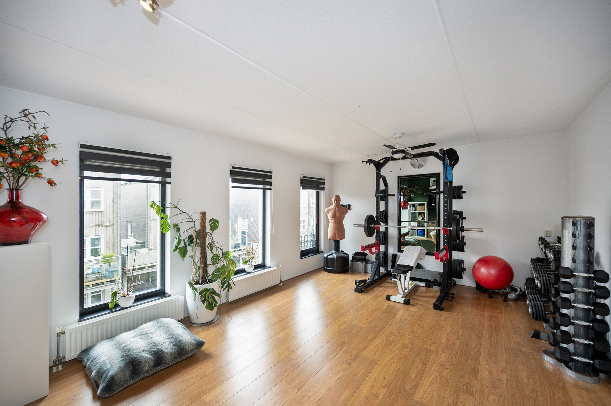 Op de eerste verdieping bevindt zich een woning brede slaapkamer aan de waterzijde. Deze ruimte is momenteel in gebruik als multifunctionele werk-/sportruimte, maar kan eenvoudig worden opgesplitst in twee slaapkamers. De verdieping is voorzien van een combinatie van een laminaatvloer en lichte vloerbedekking.