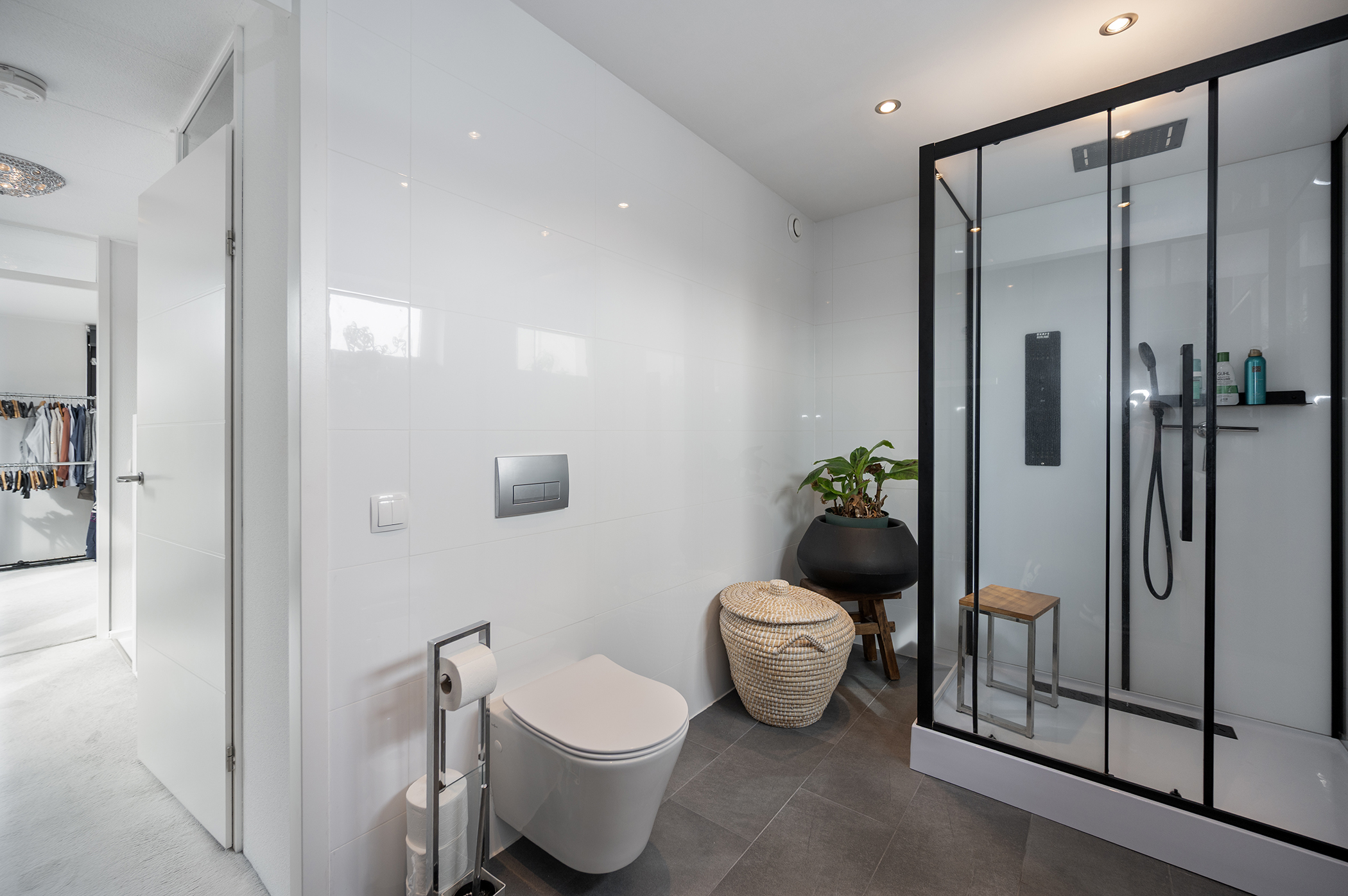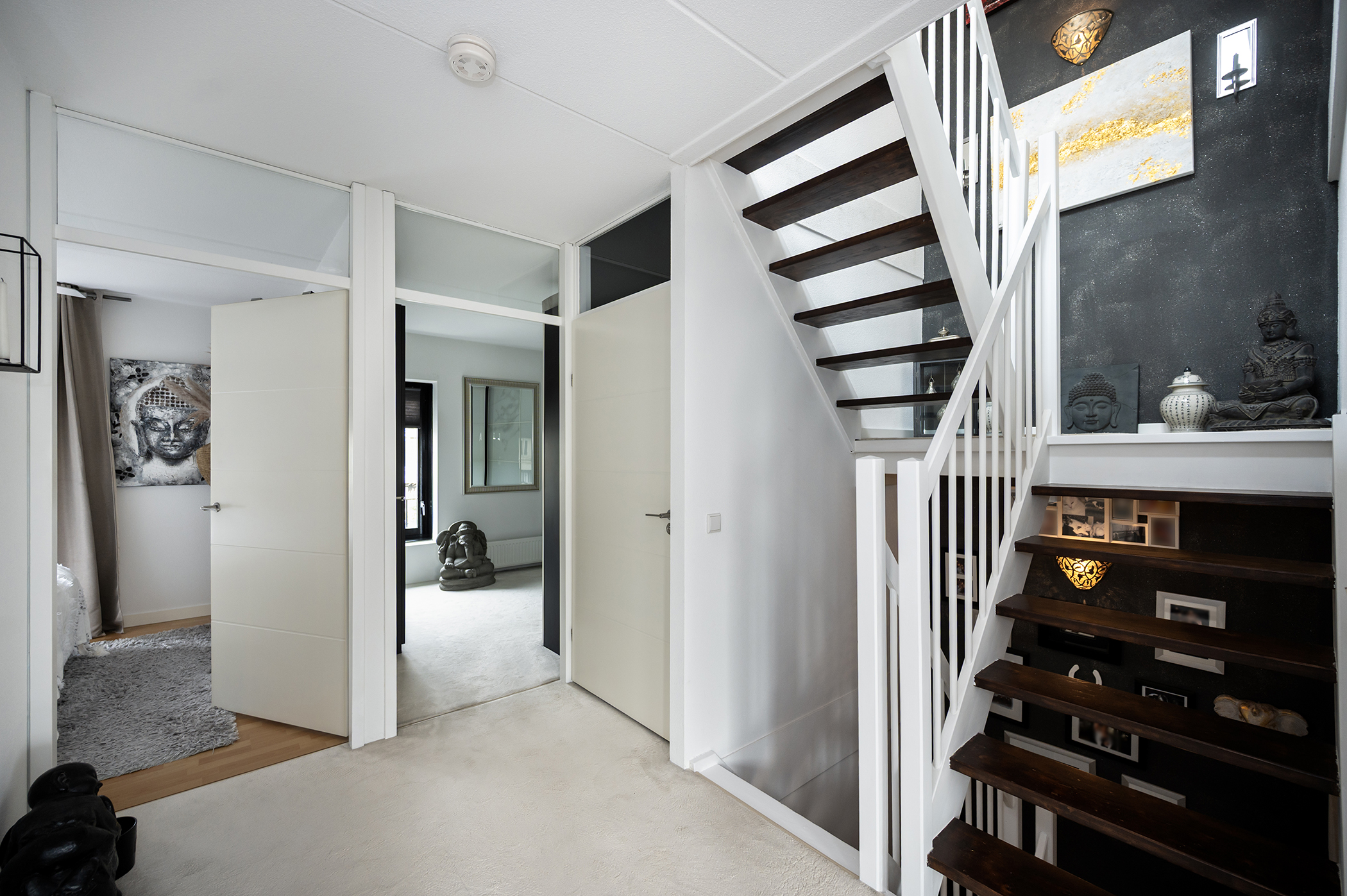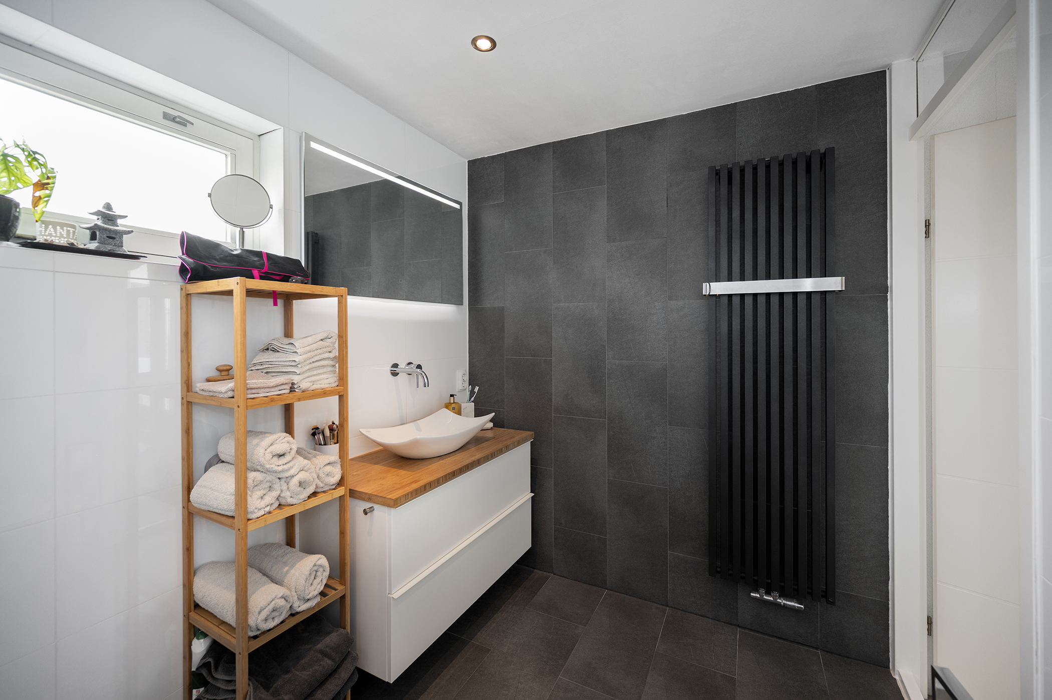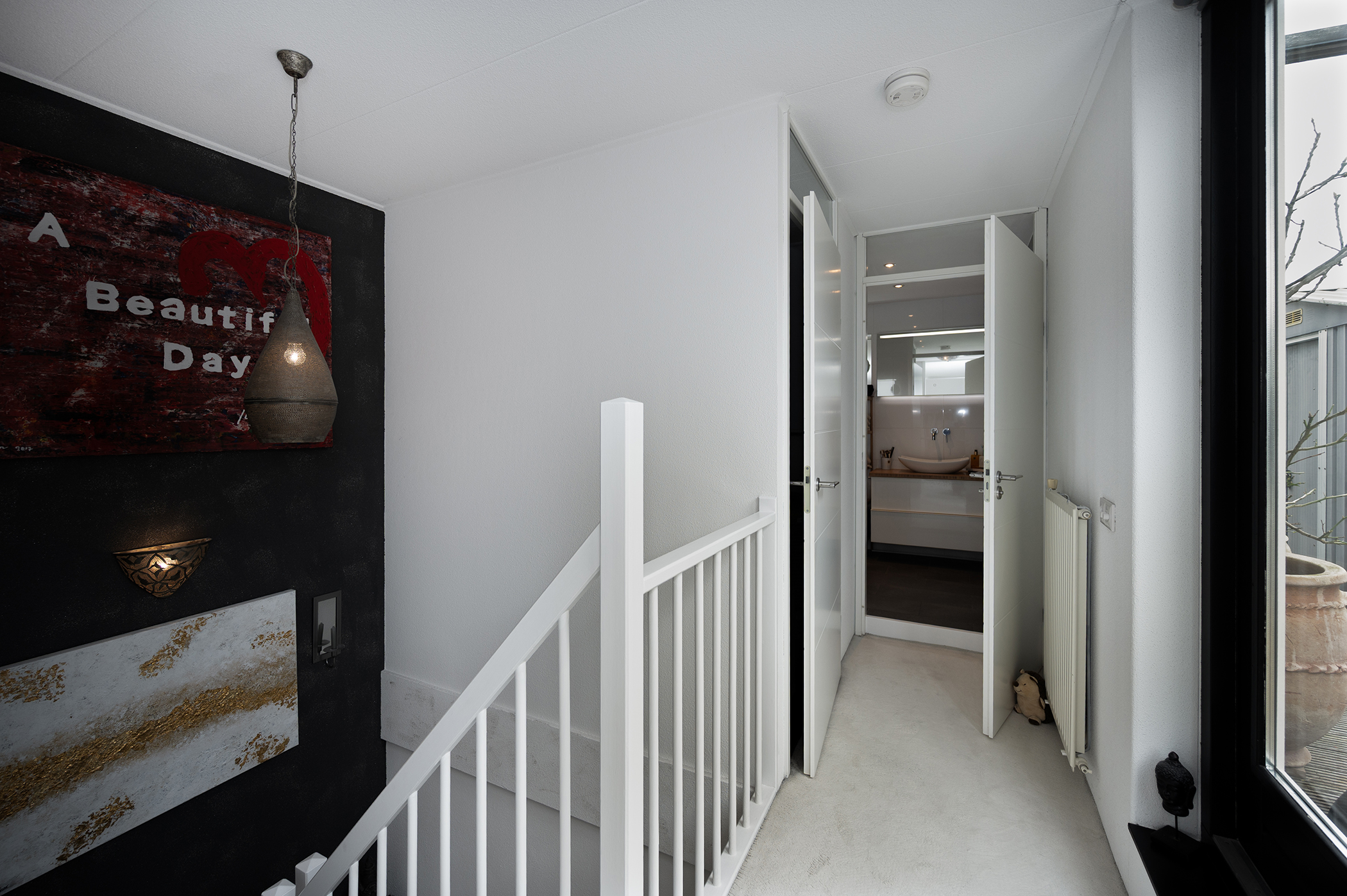 De ruime overloop beschikt over een separaat toilet, wat een groot pluspunt is. De recent vernieuwde badkamer is modern en strak afgewerkt, voorzien van een inloopdouche, vrijstaand bad en een stijlvol wastafelmeubel.