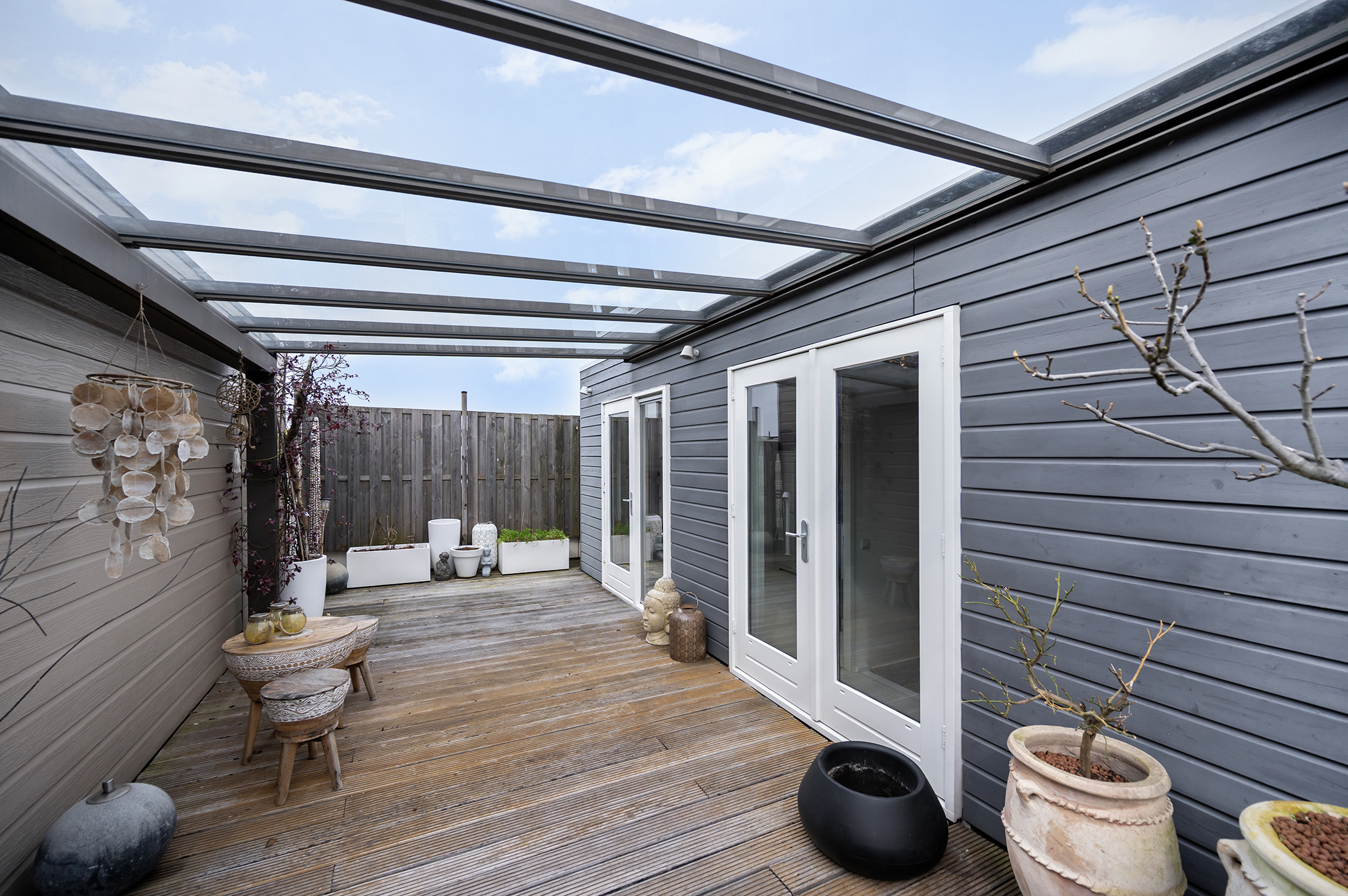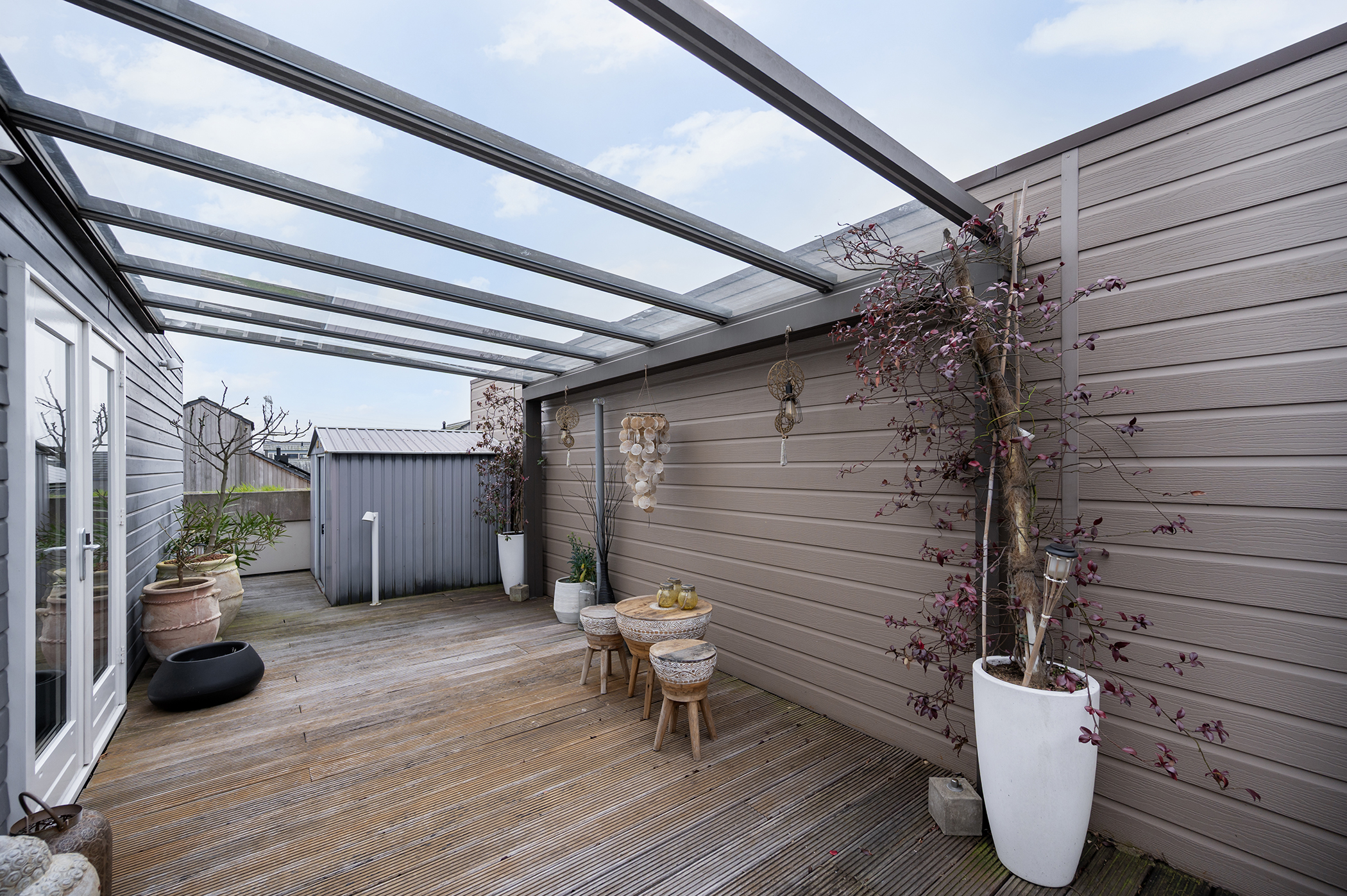 Daarnaast is er toegang tot het dakterras, dat volledige privacy biedt en een sfeervolle Ibiza-vibe heeft dankzij de overkapping. Hierdoor is het terras gedurende een groot deel van het jaar te gebruiken.