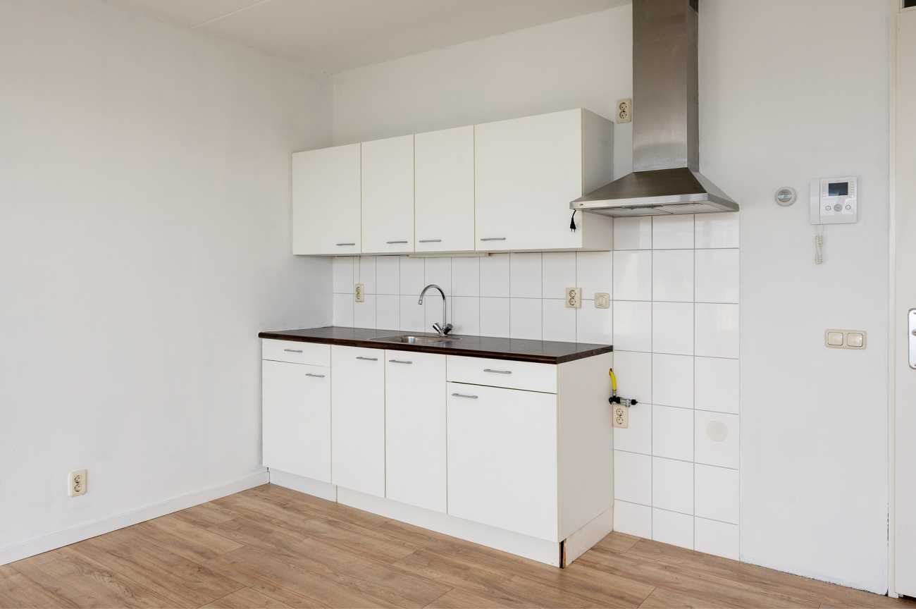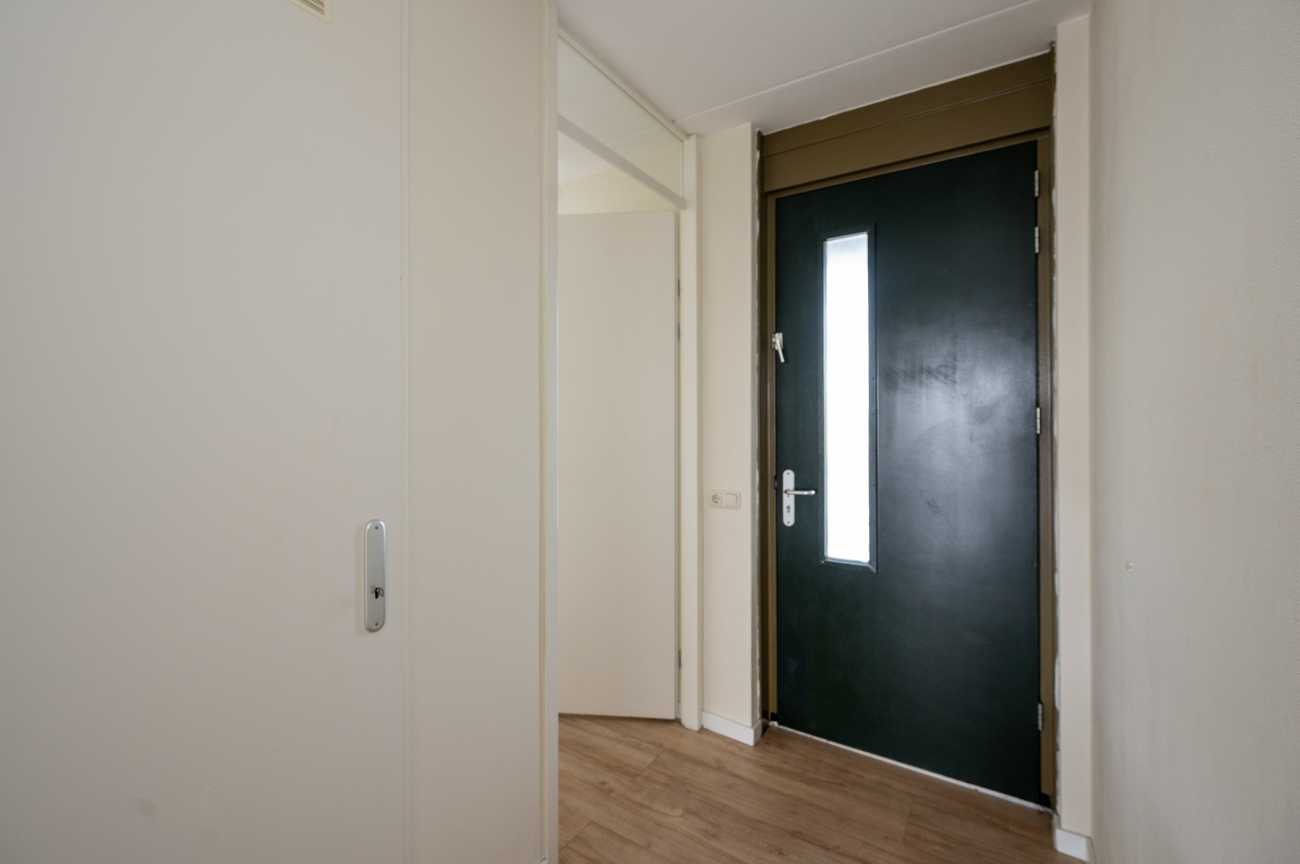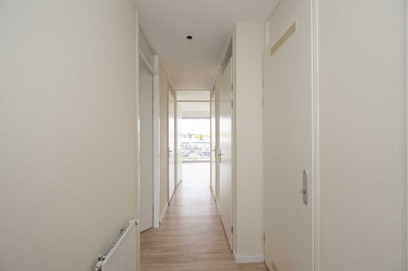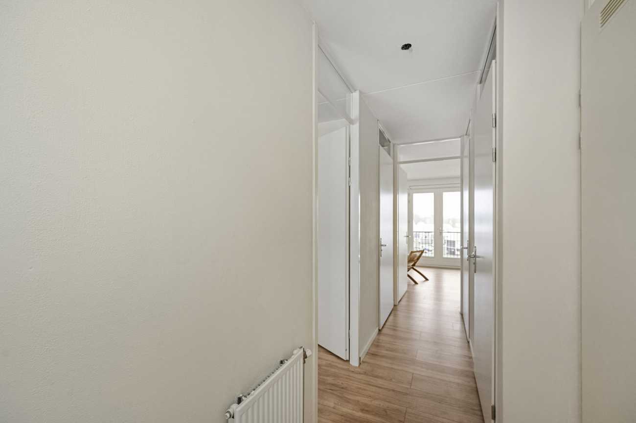 Entree van de woning met in de hal de meterkast en toegangsdeuren naar alle ruimtes. Via de lange hal loopt u rechtdoor de woonkamer in. De sfeervolle woonkamer heeft woning breed grote plafond hoge ramen, wat voor veel lichtinval zorgt. De openslaande deuren richting het balkon zorgen voor een heerlijke bries door de woning bij een zonnige dag. Het balkon strekt zich over de gehele breedte van de woning en is gelegen op het zuidwesten. U heeft hier een vrij uitzicht over het winkelcentrum “Doemere” en zit qua zonuren perfect. Een heerlijke plek om te genieten van het buitenleven! De woonkamer is uitgerust met een basic keukenblok en het appartement is voorzien van een nette laminaat.
