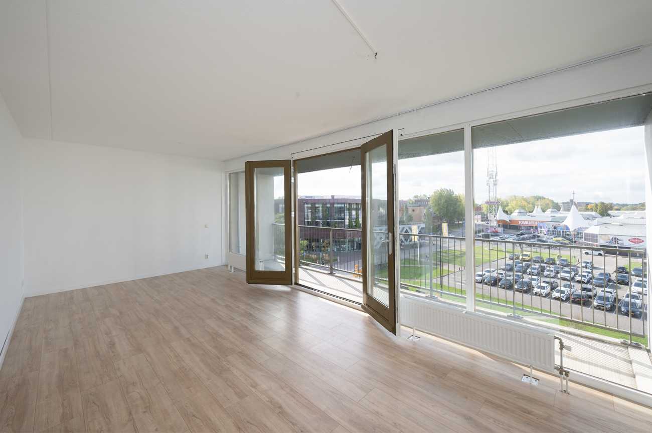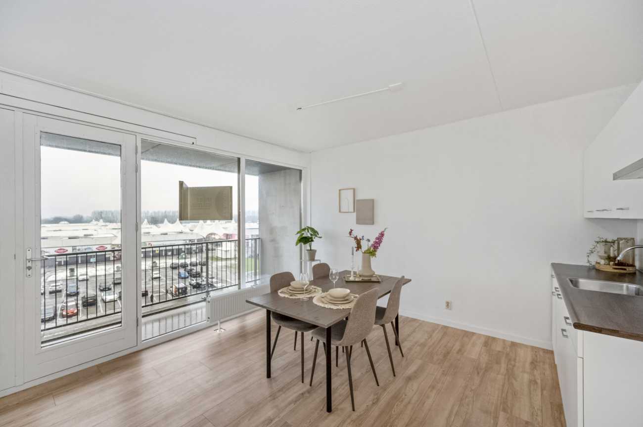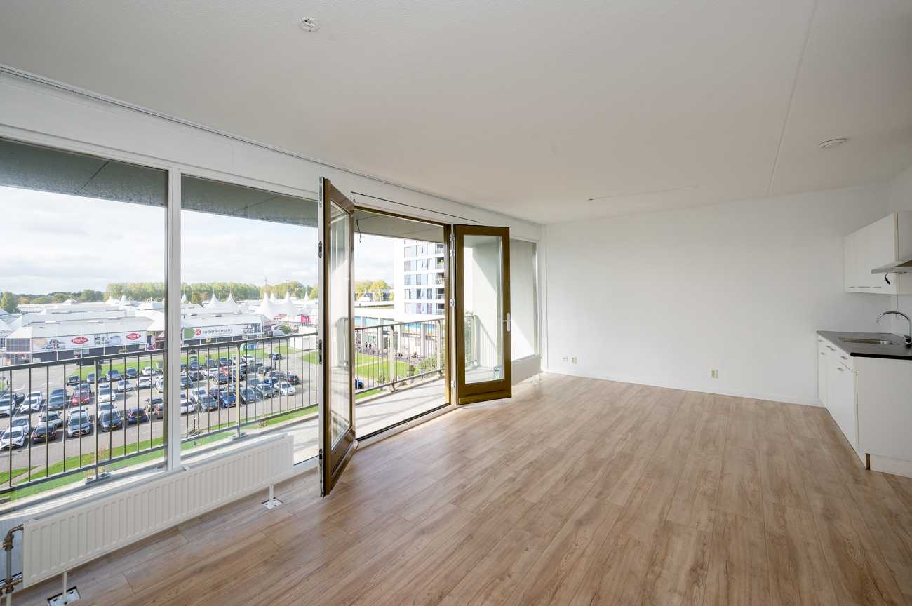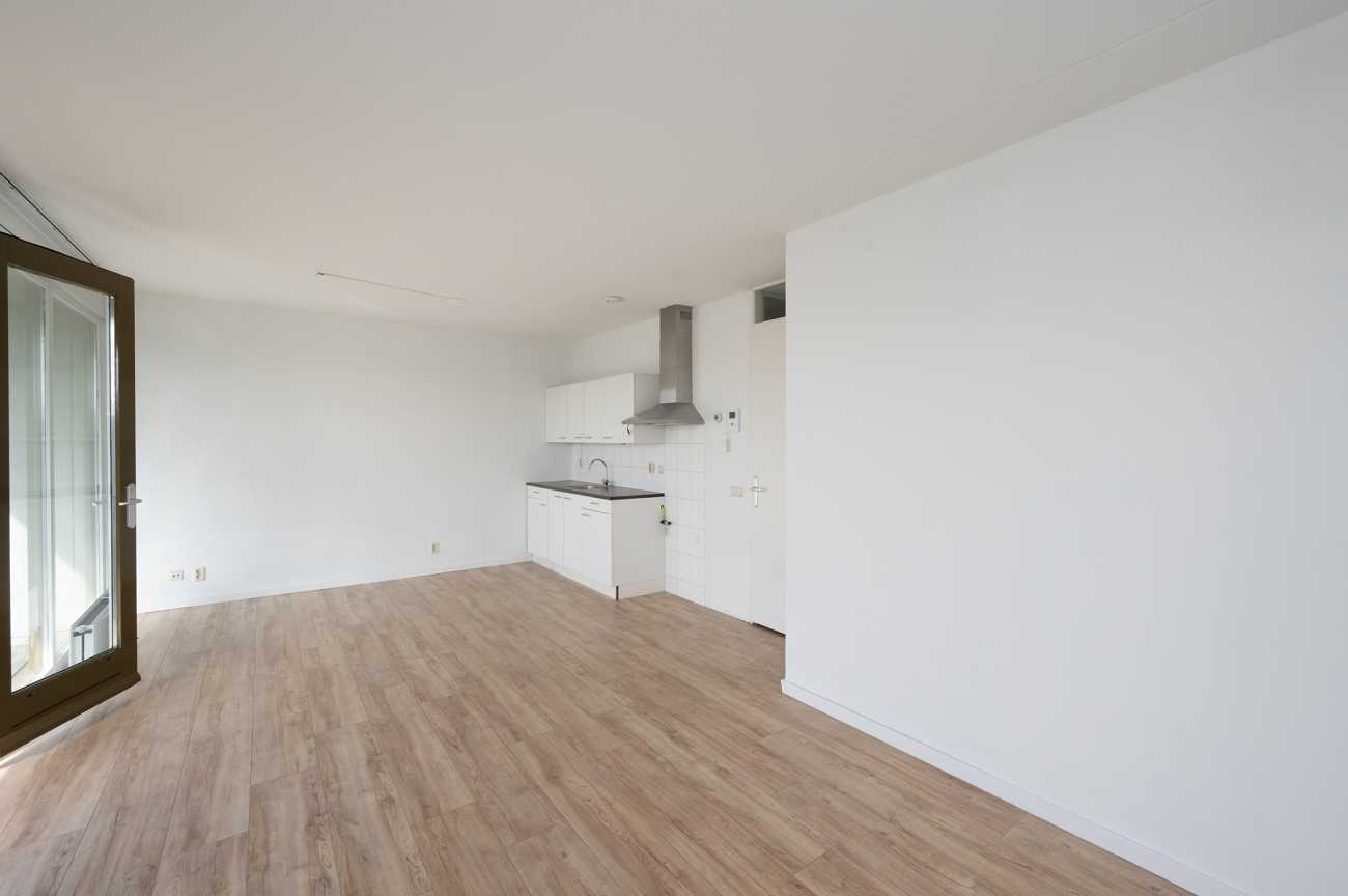 Entree van de woning met in de hal de meterkast en toegangsdeuren naar alle ruimtes. Via de lange hal loopt u rechtdoor de woonkamer in. De sfeervolle woonkamer heeft woning breed grote plafond hoge ramen, wat voor veel lichtinval zorgt. De openslaande deuren richting het balkon zorgen voor een heerlijke bries door de woning bij een zonnige dag. Het balkon strekt zich over de gehele breedte van de woning en is gelegen op het zuidwesten. U heeft hier een vrij uitzicht over het winkelcentrum “Doemere” en zit qua zonuren perfect. Een heerlijke plek om te genieten van het buitenleven! De woonkamer is uitgerust met een basic keukenblok en het appartement is voorzien van een nette laminaat.