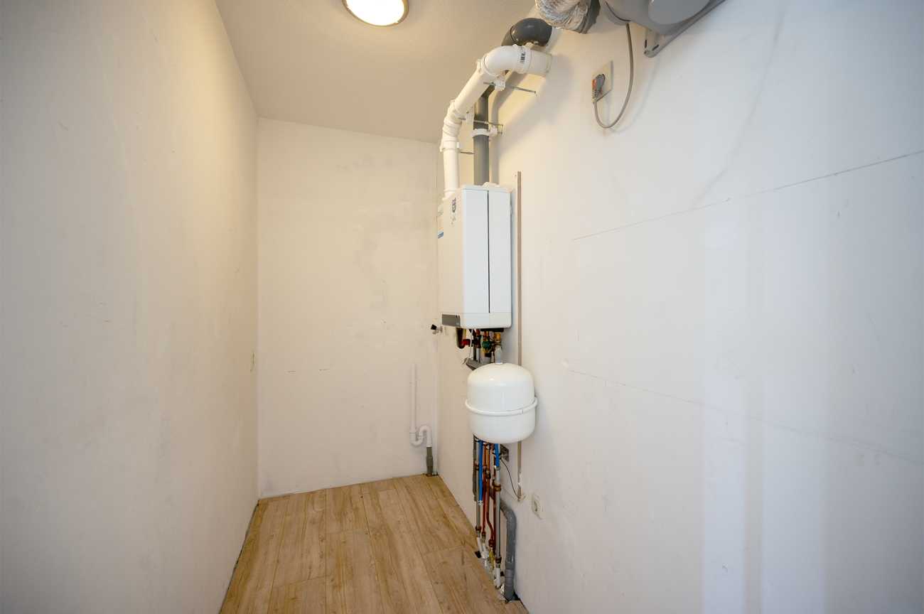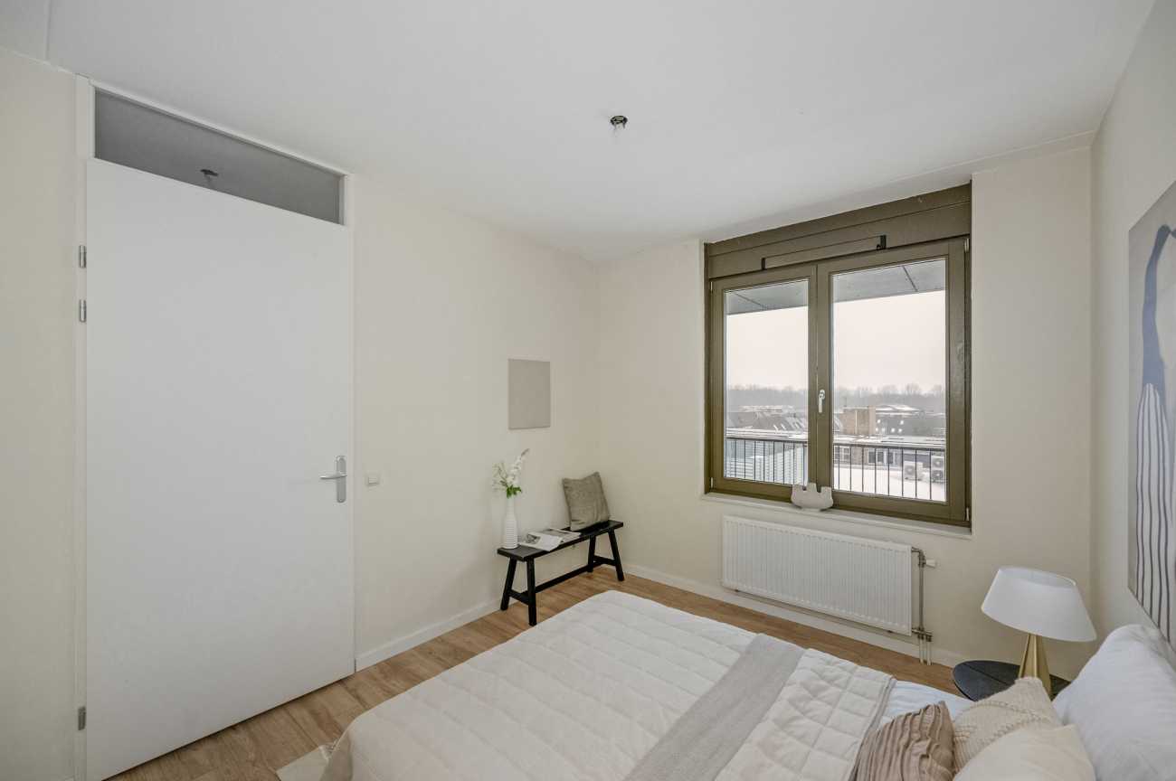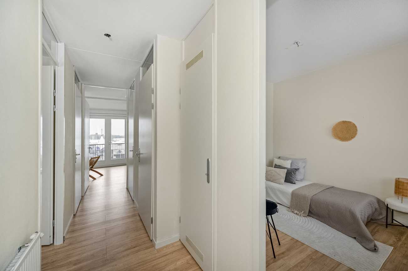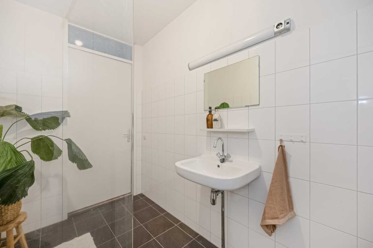 Het appartement heeft twee slaapkamers aan de galerij zijde gelegen, beiden met draai-/ en kiepramen. De badkamer is geheel betegeld, ruim opgezet en voorzien van een wastafel en douche. Het toilet met fontein is separaat. Er is een aparte ruimte waar zich de cv ketel (Intergas, eigendom) en de wasmachine aansluiting bevinden. Er is hier voldoende ruimte om extra spullen op te bergen.