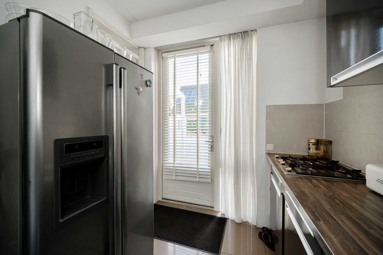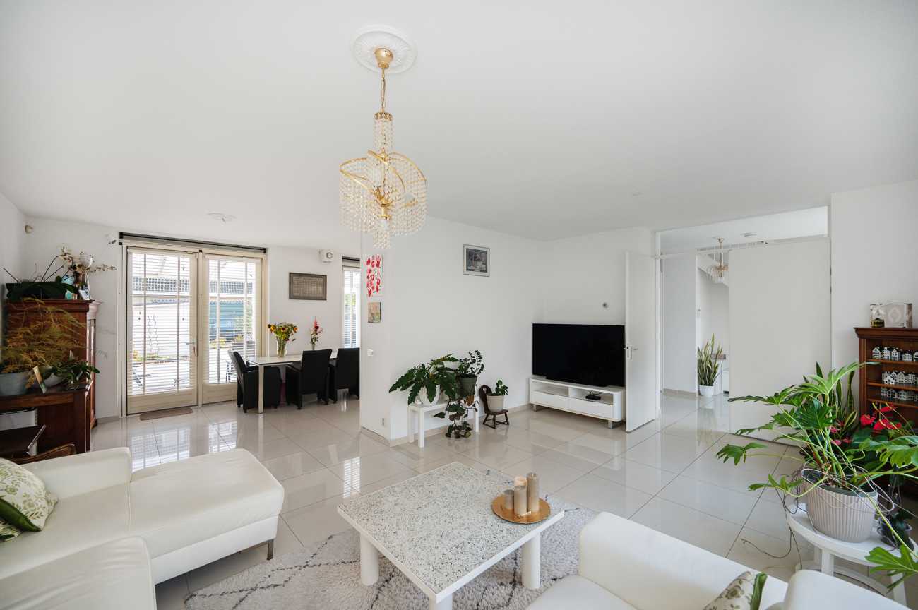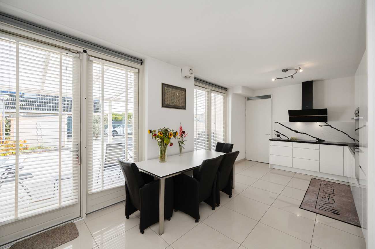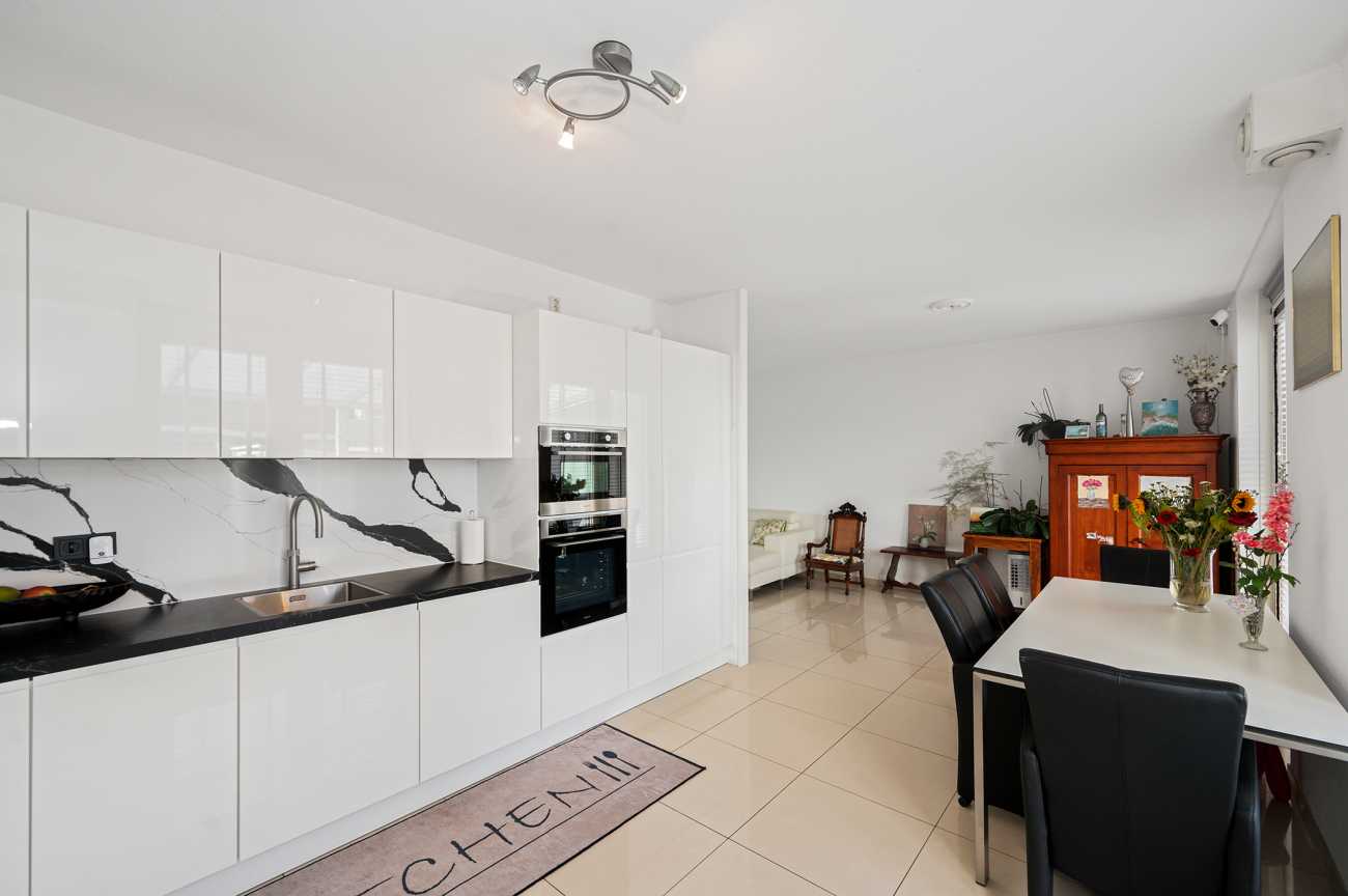 Via de entree met hal en apart toilet bereikt u de woonkamer. De woonkamer is ruim opgezet en voorzien van een lichte tegelvloer met vloerverwarming. Dankzij de grote ramen aan de voorzijde komt er veel natuurlijk licht binnen, wat de ruimte extra aangenaam maakt. Aan de achterzijde van de woning bevindt zich de eetkamer met de half open keuken. De moderne witte keuken is voorzien van een donker werkblad en is uitgerust met diverse inbouwapparatuur, waaronder een oven, magnetron, koel-vriescombinatie, kokend waterkraan en een inductiekookplaat met afzuiging. Direct naast de keuken vindt u de praktische bijkeuken met extra opbergruimte en aansluiting voor witgoed.