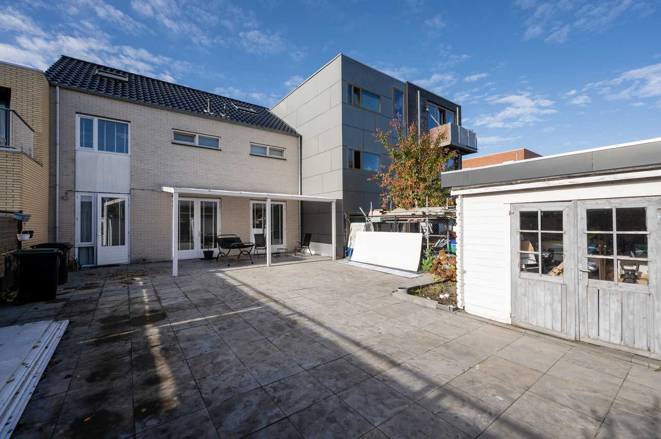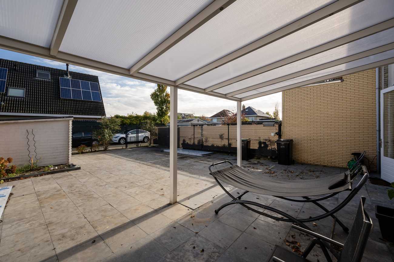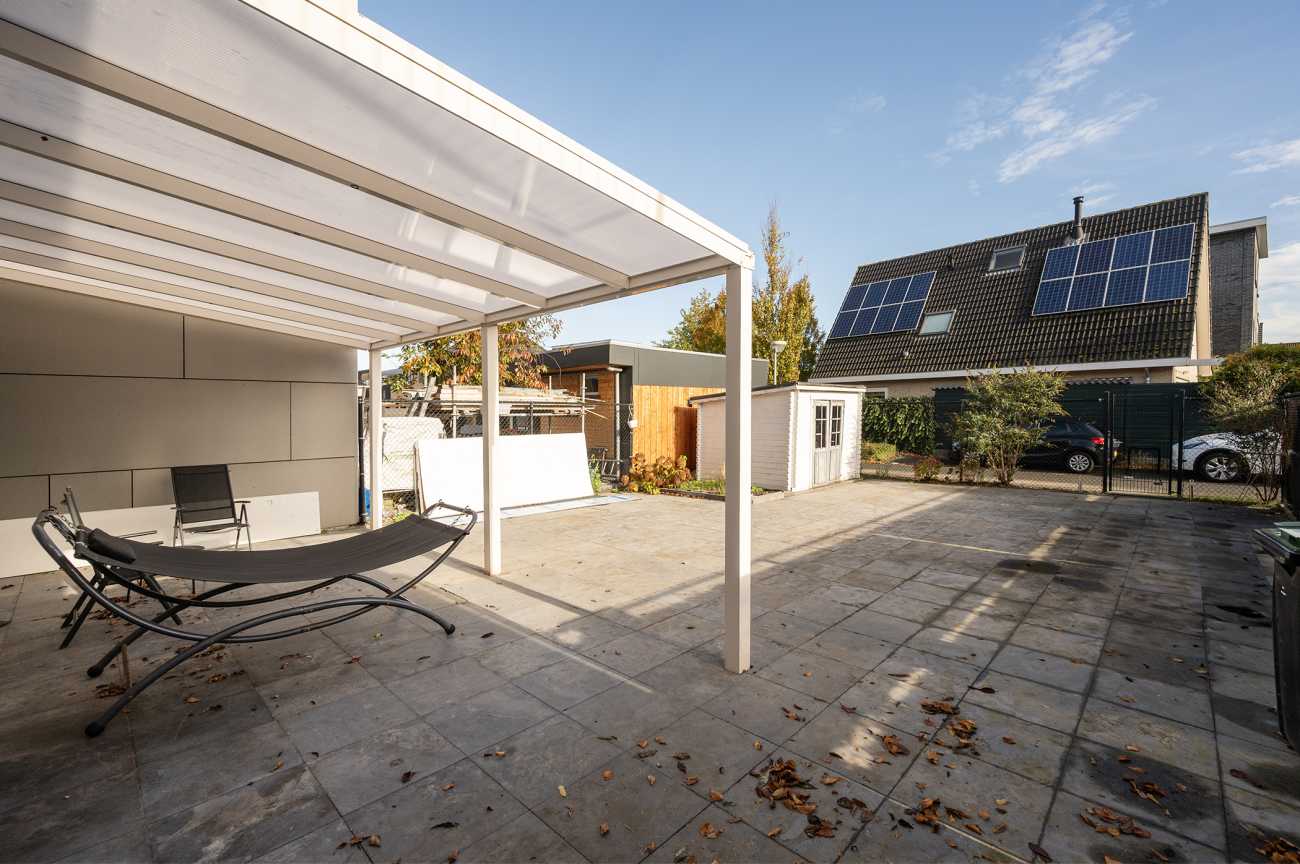 De ruime achtertuin is gelegen op het noordoosten en is onderhoudsvriendelijk aangelegd met bestrating. Achterin de tuin staat een handig tuinhuisje, ideaal voor het opbergen van fietsen en gereedschap. Bovendien is er een overkapping direct aan de woning, waar u heerlijk beschut kunt zitten.