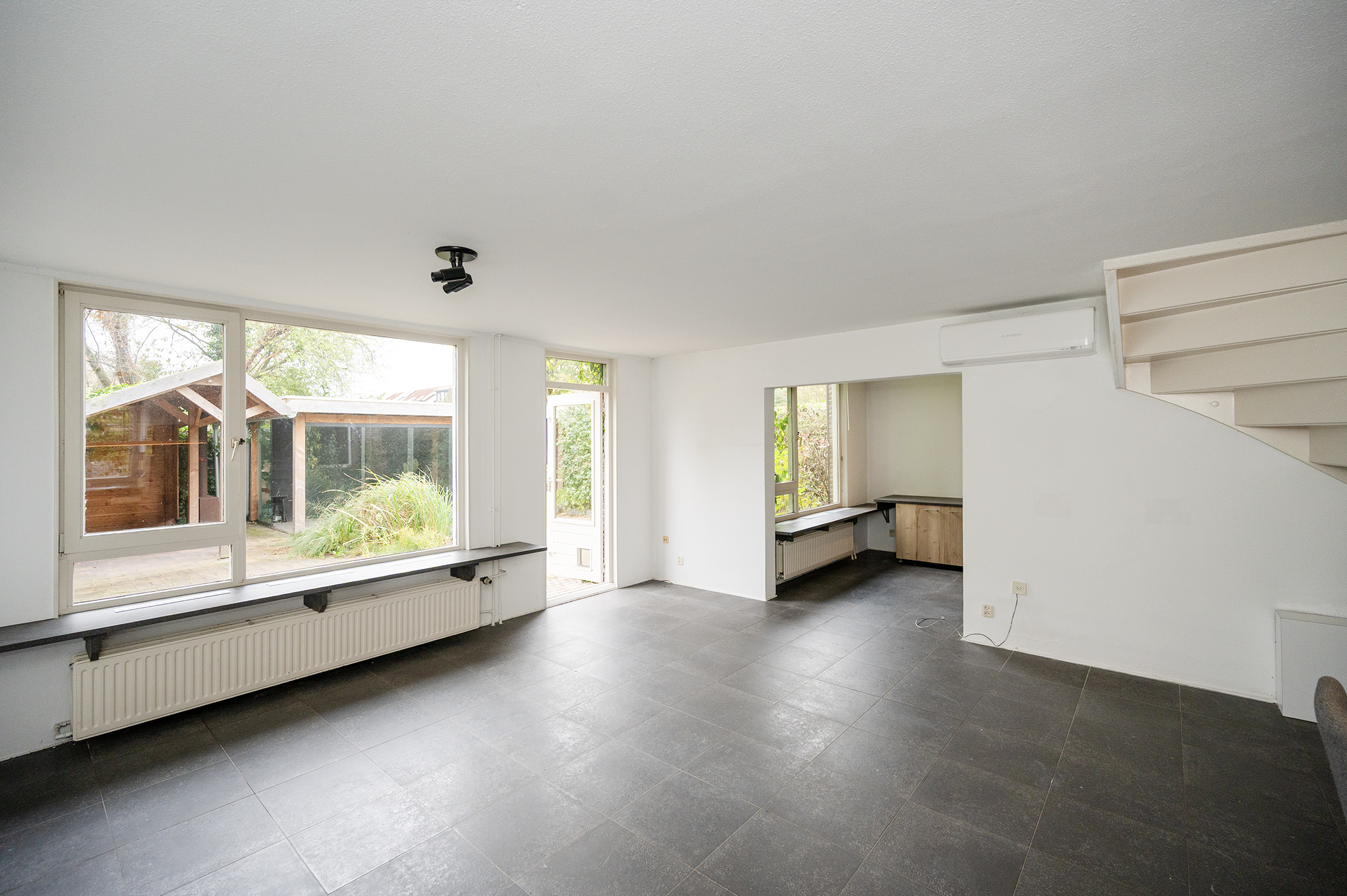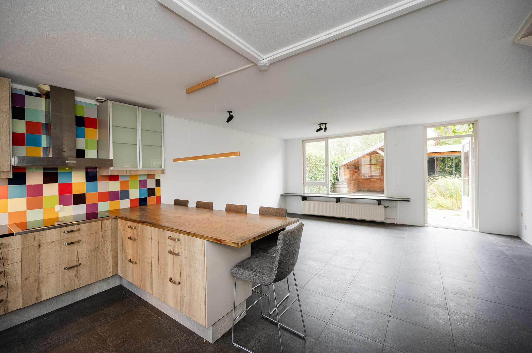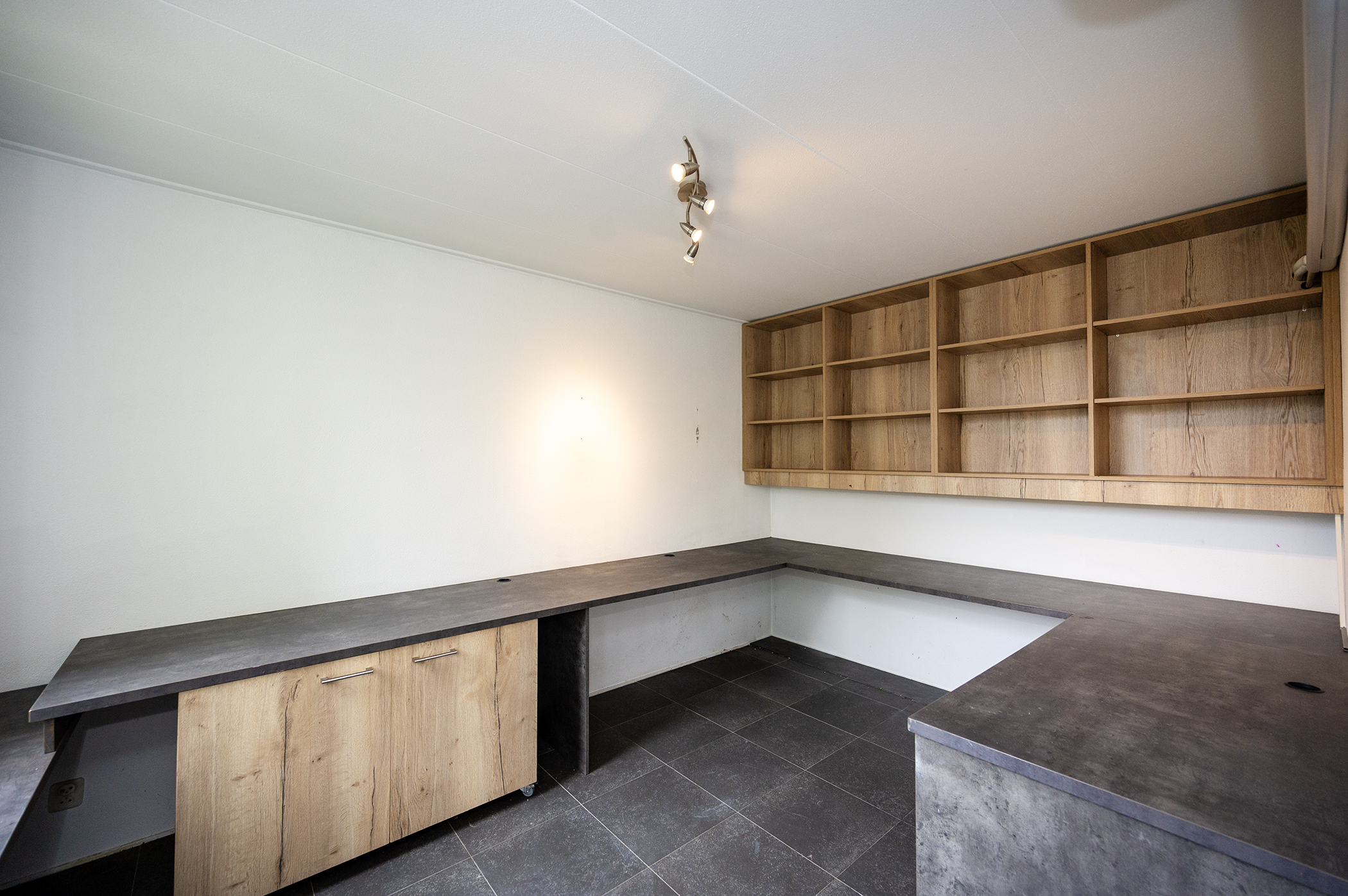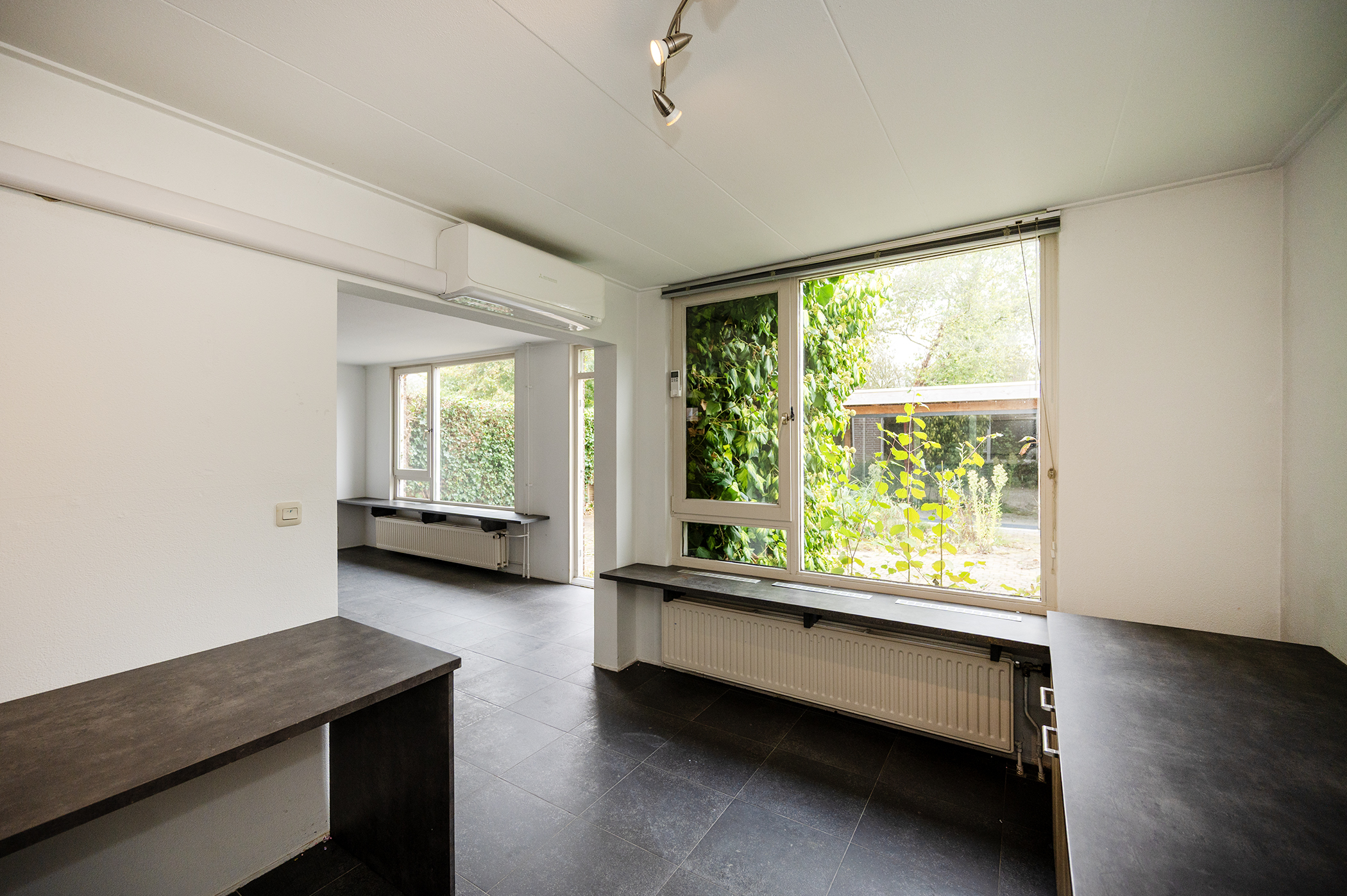 Aan de voorzijde van de woning bevindt zich de open keuken, uitgerust met een oven, vaatwasser, inductiekookplaat en een afzuigkap die naar buiten afzuigt. De woonkamer is zowel in het zitgedeelte als het kantoorgedeelte voorzien van een airco unit.