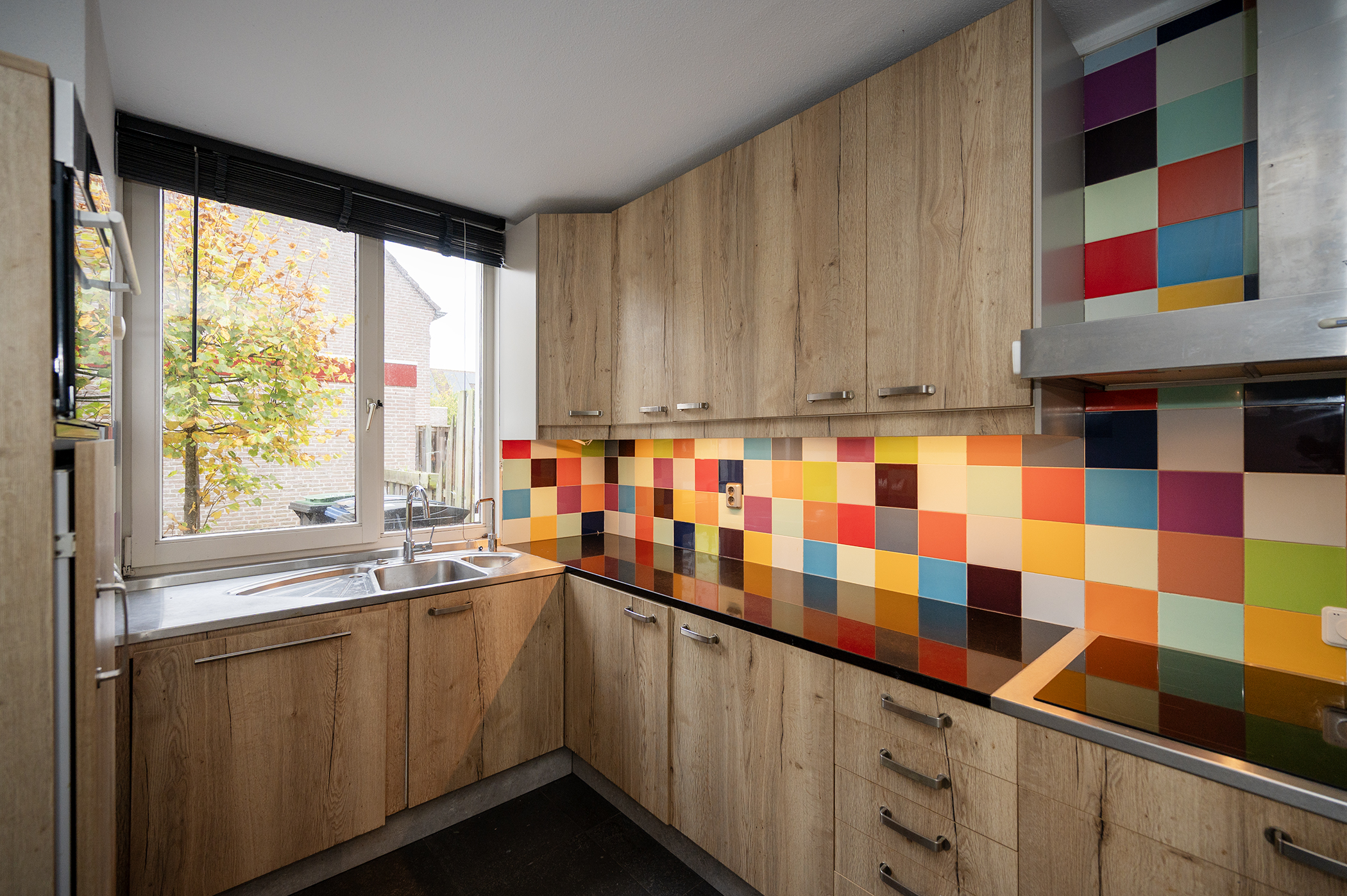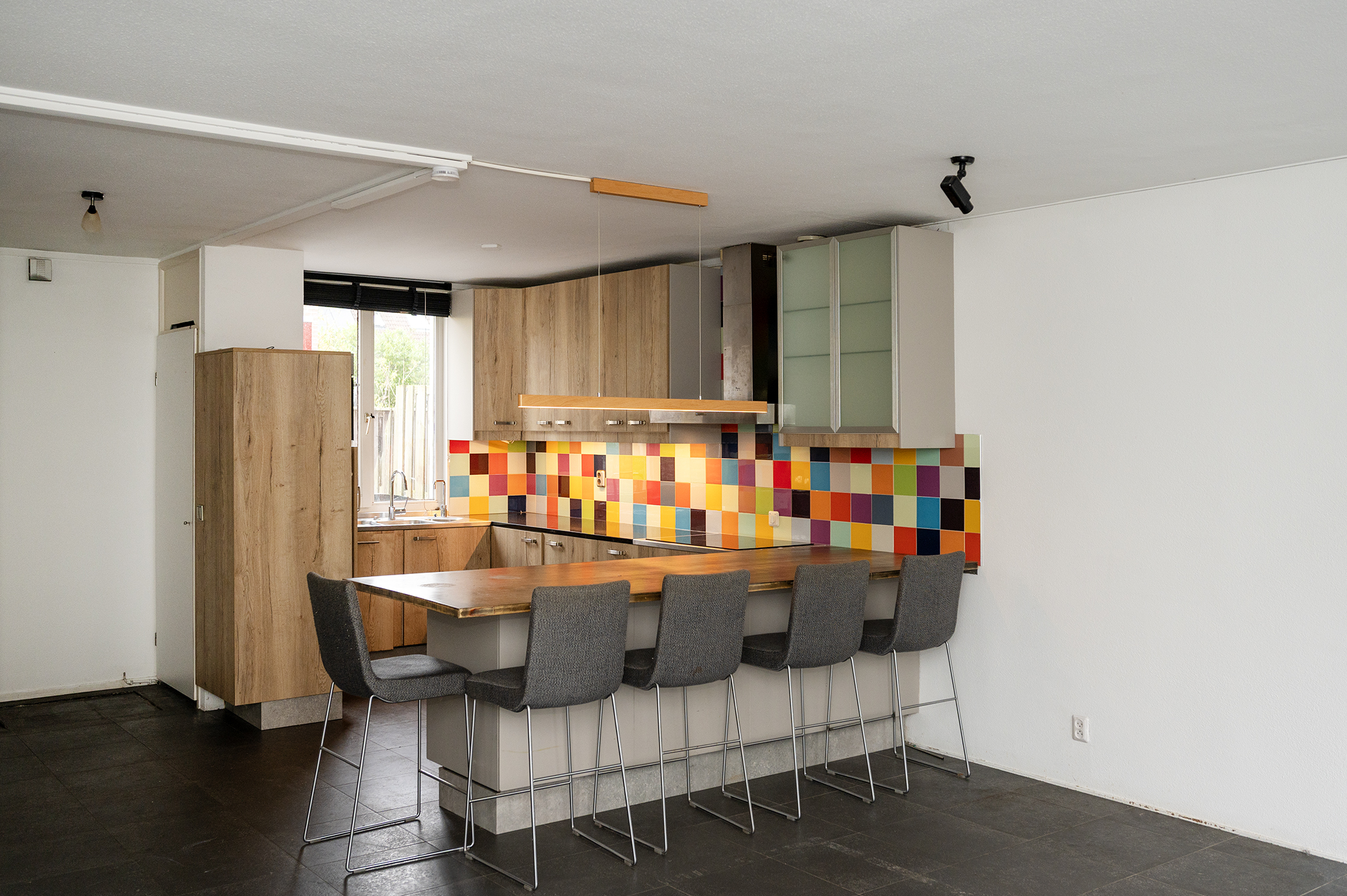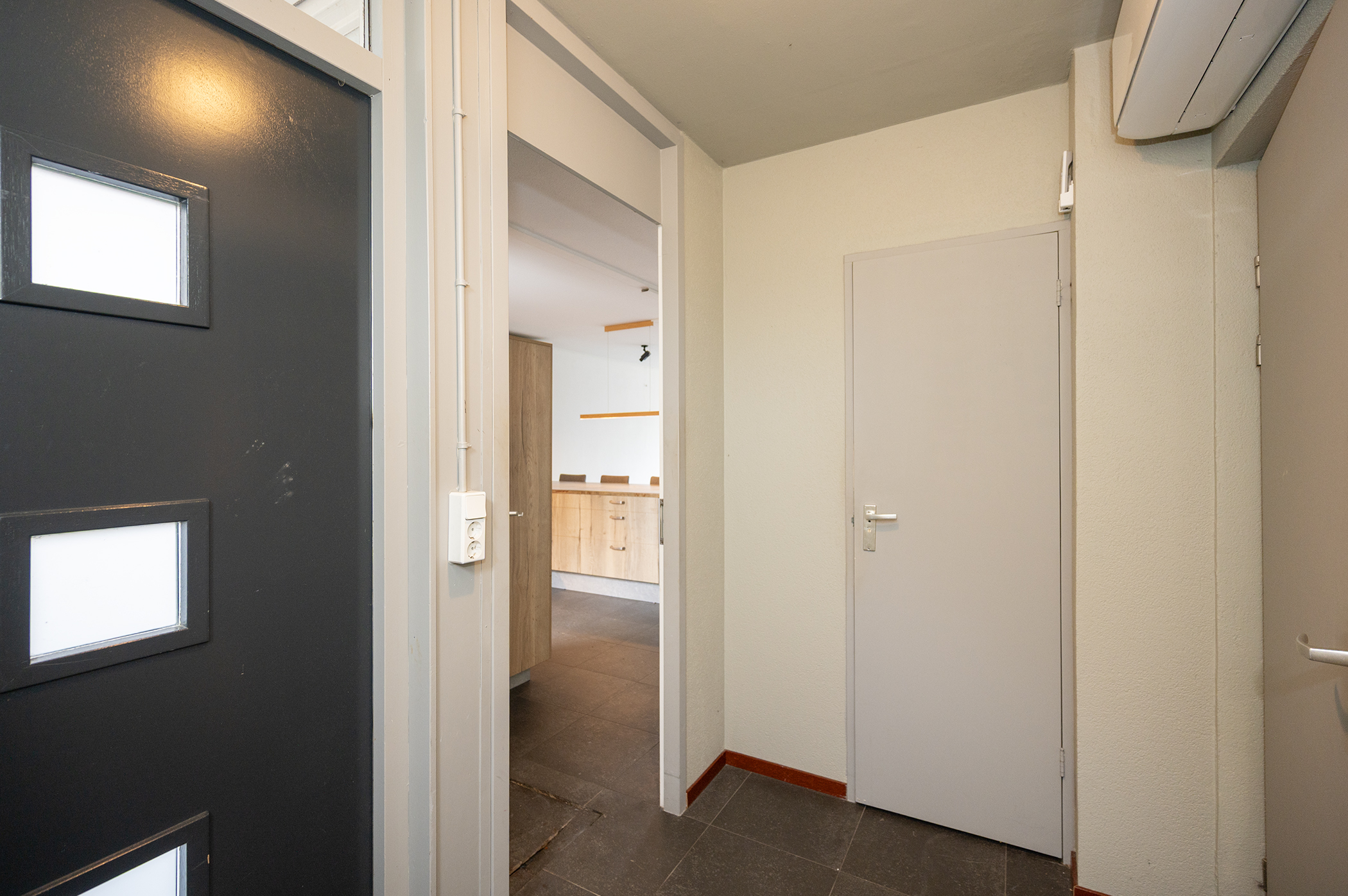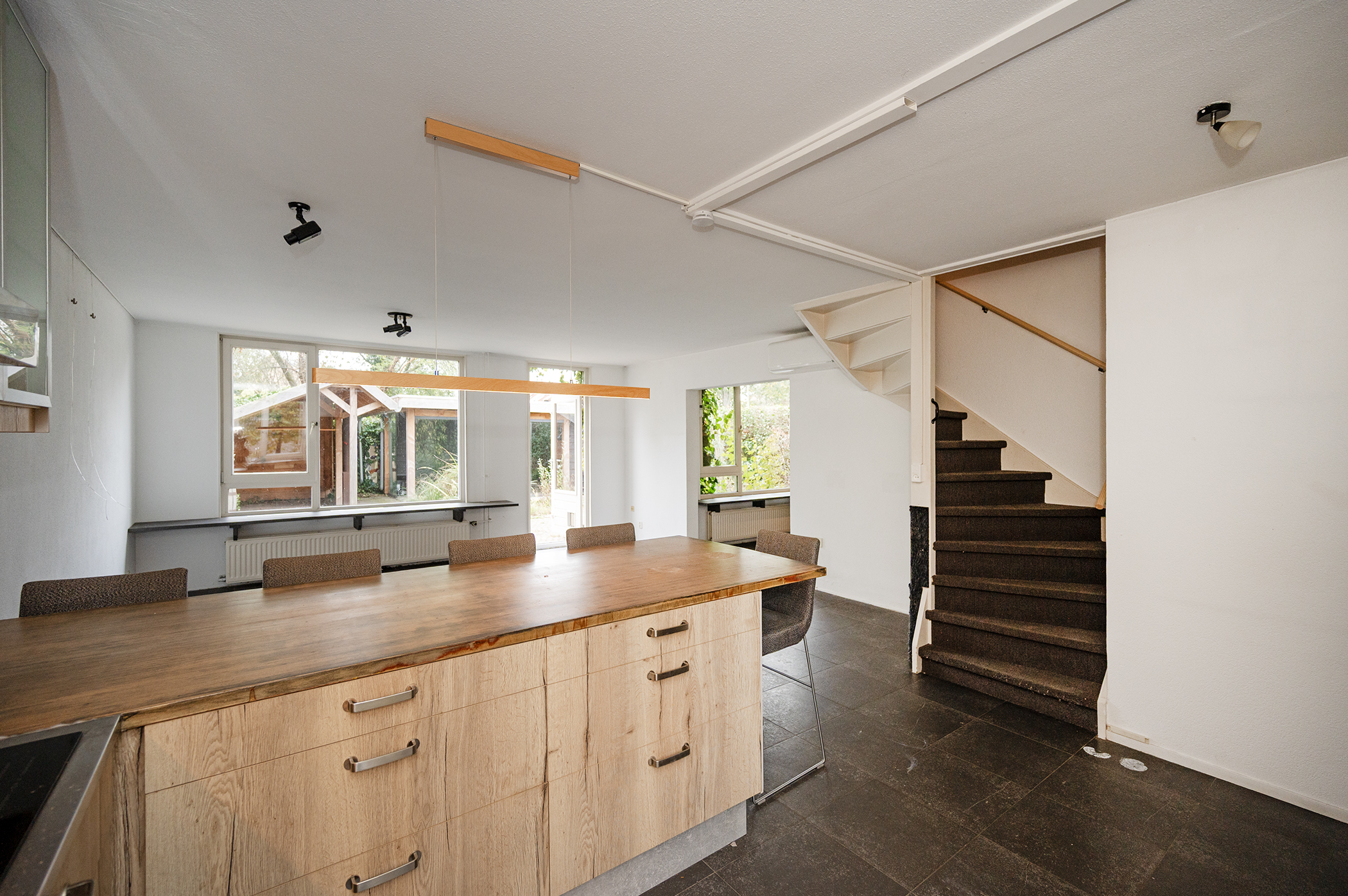 Aan de voorzijde van de woning bevindt zich de open keuken, uitgerust met een oven, vaatwasser, inductiekookplaat en een afzuigkap die naar buiten afzuigt. De woonkamer is zowel in het zitgedeelte als het kantoorgedeelte voorzien van een airco unit.