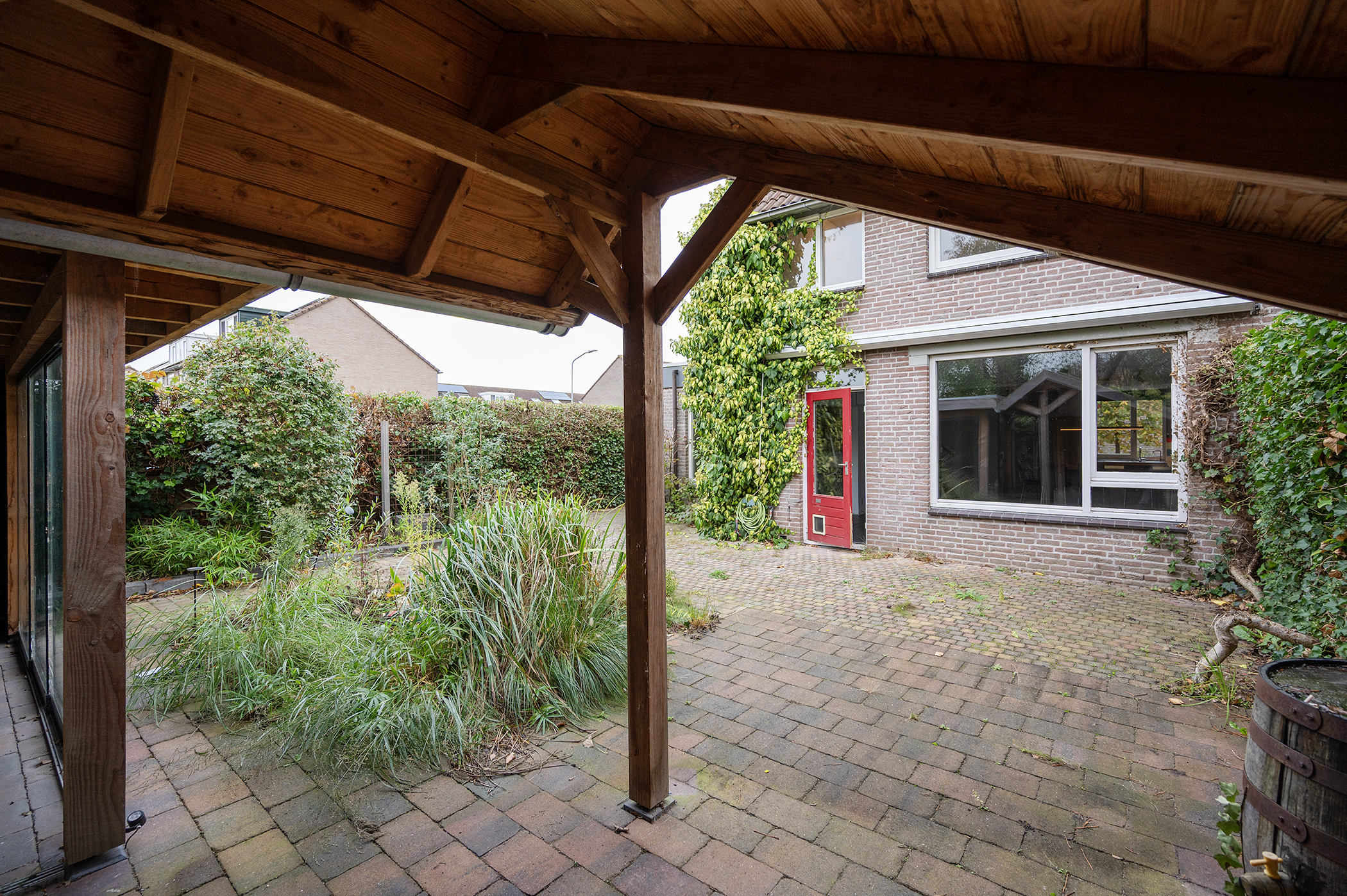 De ruime achtertuin is netjes aangelegd en is voorzien van een overkapping, vijver, achterom en vrijstaande garage met verlichting en elektra. Naast het huis is een poort aanwezig voor directe toegang tot de tuin.