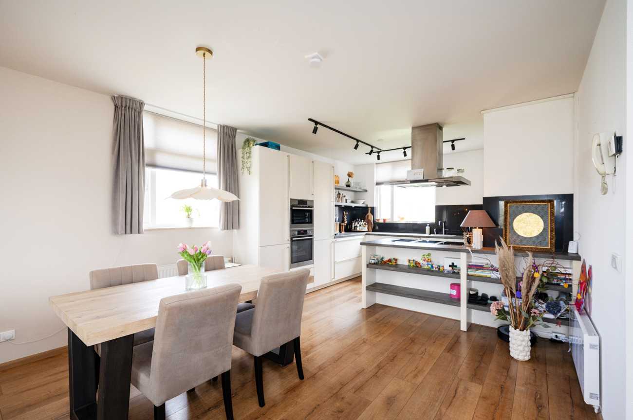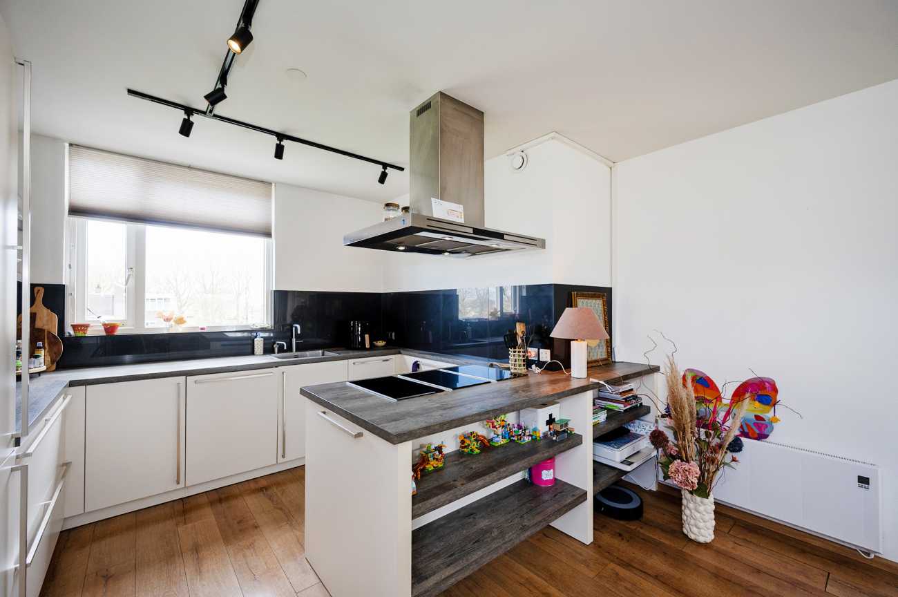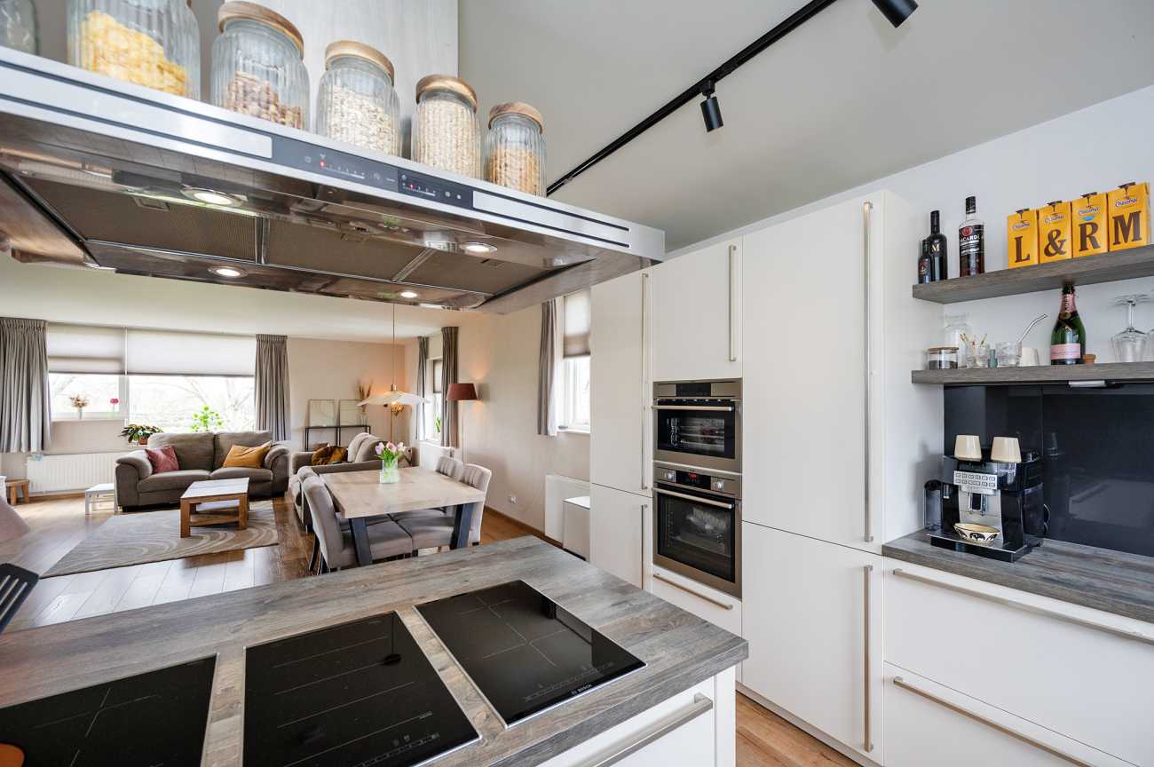De keuken is modern uitgevoerd en beschikt over een praktisch schiereiland, wat zorgt voor extra werkruimte en een gezellige verbinding met de woonkamer. Daarnaast is de keuken voorzien van diverse inbouwapparatuur, waaronder een koel-/vriescombinatie, oven, inductiekookplaat, stoomoven, Quooker en vaatwasser.