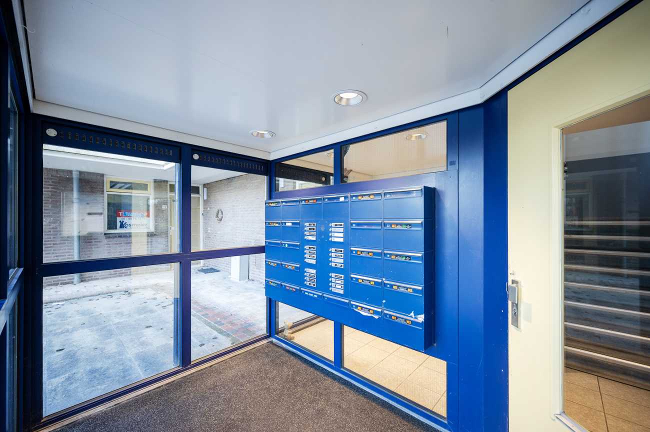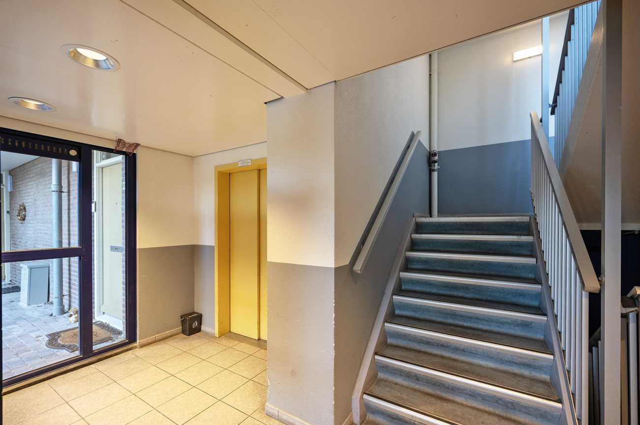 Centrale entree met bellenplateau, trapopgang en lift. Aan de zijkant van het complex bevindt zich de toegang tot de privébergingen en het parkeerterrein voor bewoners. Het appartement beschikt over een ruime berging op de begane grond, ideaal voor fietsen en extra opslag. Parkeren is hier eenvoudig en ruim beschikbaar.