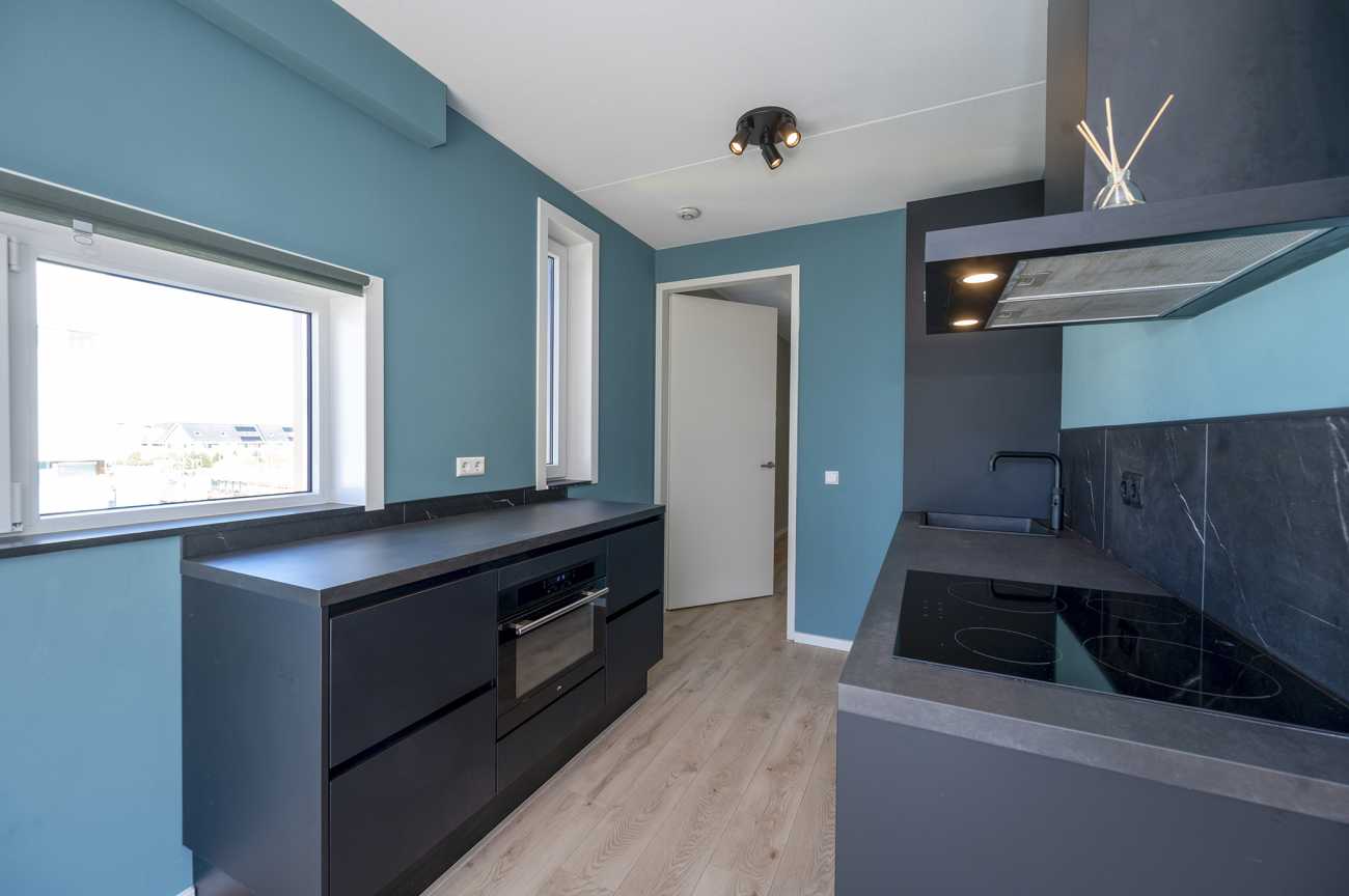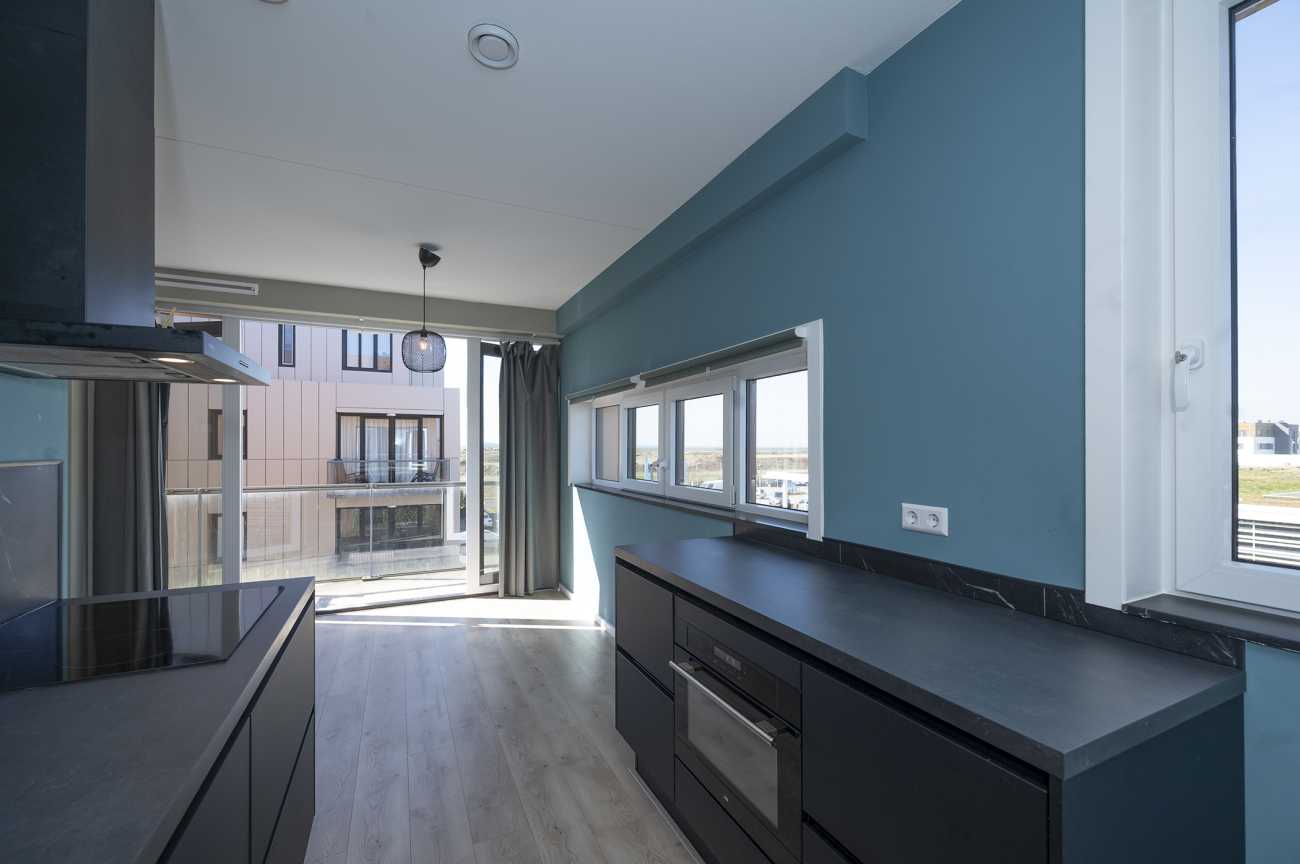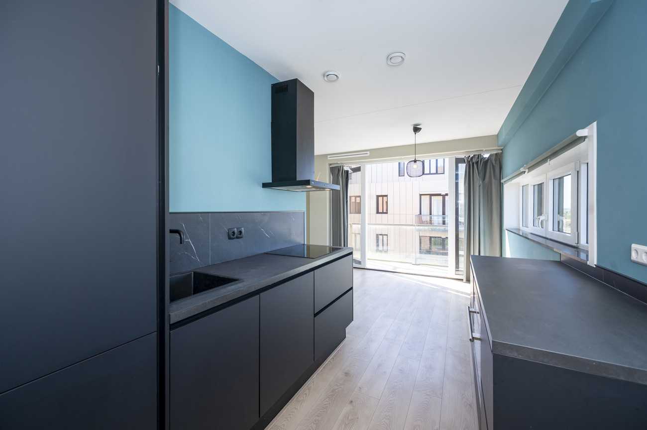 De woonkamer zit op de hoek van het gebouw en heeft openslaande deuren naar het balkon met glazen balustrade. De ligging hiervan is op het westen: heerlijk in de avondzon! Aan de zijde van de winkels loopt de woonkamer over in de open keuken. Hier zit een breed raam en er is een hoog raam in de keuken. Deze zeer complete keuken is voorzien van een combioven, koelkast, vriezer, vaatwasser, Quooker en een inductie kookplaat. Daarnaast is er veel werk- en opbergruimte door het extra werkblad aan de kant van de ramen. Via de keuken kom je bij de ruime hoofdslaapkamer.