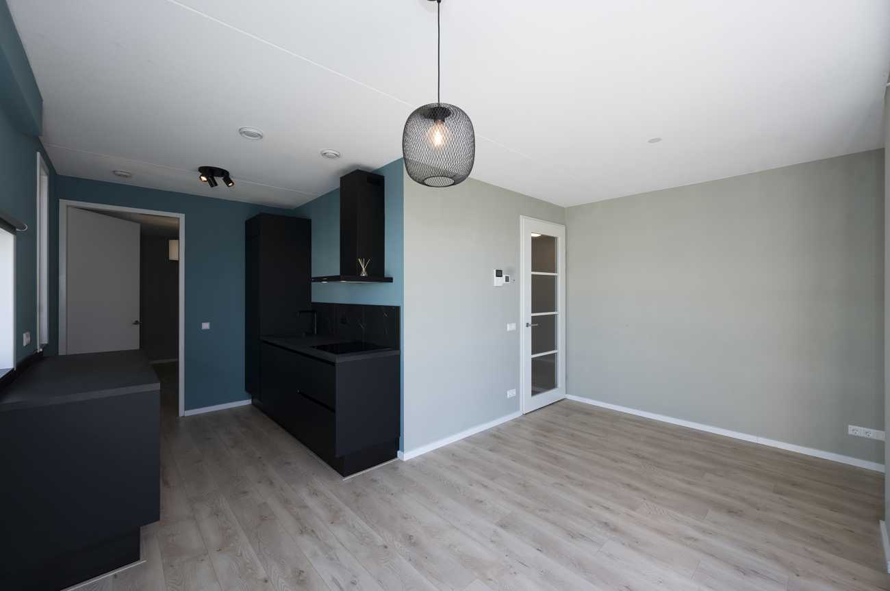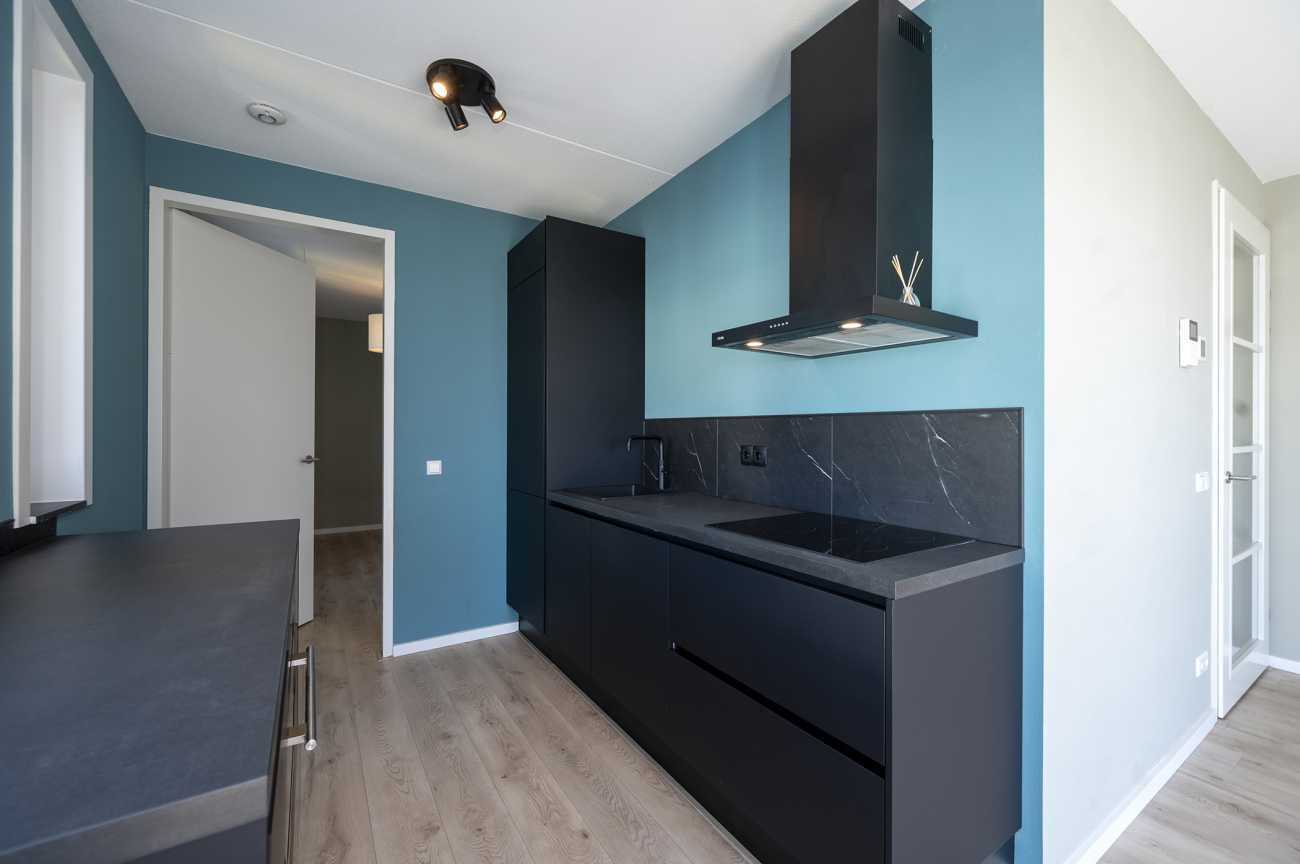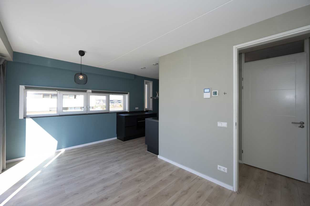 De woonkamer zit op de hoek van het gebouw en heeft openslaande deuren naar het balkon met glazen balustrade. De ligging hiervan is op het westen: heerlijk in de avondzon! Aan de zijde van de winkels loopt de woonkamer over in de open keuken. Hier zit een breed raam en er is een hoog raam in de keuken. Deze zeer complete keuken is voorzien van een combioven, koelkast, vriezer, vaatwasser, Quooker en een inductie kookplaat. Daarnaast is er veel werk- en opbergruimte door het extra werkblad aan de kant van de ramen. Via de keuken kom je bij de ruime hoofdslaapkamer.