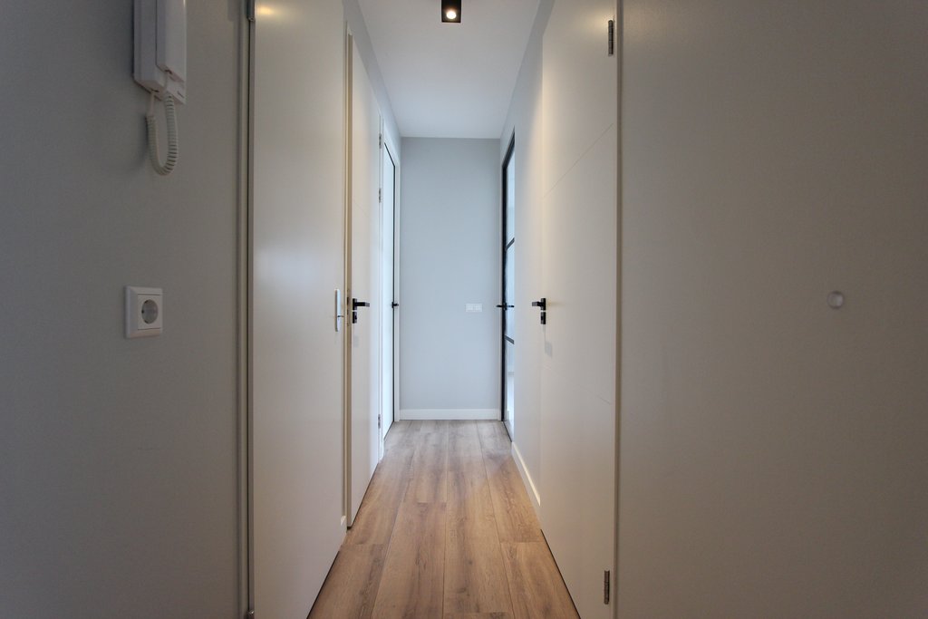 Bij binnenkomst in de centrale hal heeft u direct toegang tot 2 slaapkamer, een moderne badkamer en de woonkamer met open keuken. De openslaande deuren in de woonkamer zorgen voor veel licht en bieden toegang tot het balkon met fraai uitzicht. De openslaande deuren kunnen tevens op kiepstand gezet worden waardoor u lang kunt genieten van het mooie weer en de frisse lucht. De open keuken is voorzien van een combi oven/magnetron, vaatwasser, koel/vries combinatie en inductiekookplaat met afzuigkap.