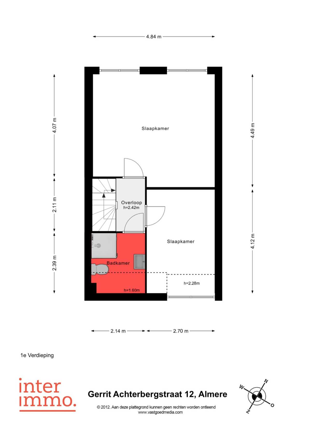 Via de vaste trap bereikt u de overloop op de eerste verdieping. Vanuit hier heeft u toegang tot twee slaapkamers en de badkamer. De grootste slaapkamer bevindt zich aan de achterzijde van de woning en strekt zich uit over de gehele breedte. Deze kamer is voorzien van luxe shutters die niet alleen een stijlvolle uitstraling geven, maar ook zorgen voor optimale lichtregulering en privacy. Deze slaapkamer kan mogelijk gesplitst worden in twee aparte slaapkamers. De tweede slaapkamer is aan de voorzijde gelegen en beschikt over een dakkapel, wat de kamer extra ruimte en lichtinval geeft. Deze kamer is uitstekend geschikt als kinderkamer, werkkamer of logeerkamer. De badkamer is volledig betegeld in lichte kleurstelling tot aan het plafond en is voorzien van een douchecabine, een wastafelmeubel met spiegel en een tweede toilet.