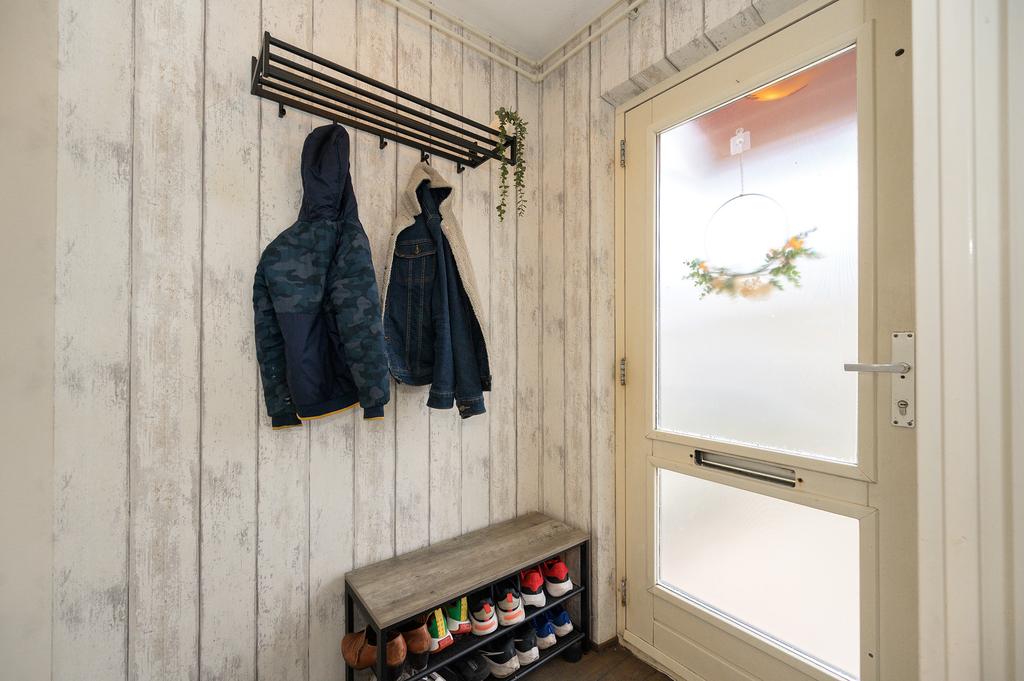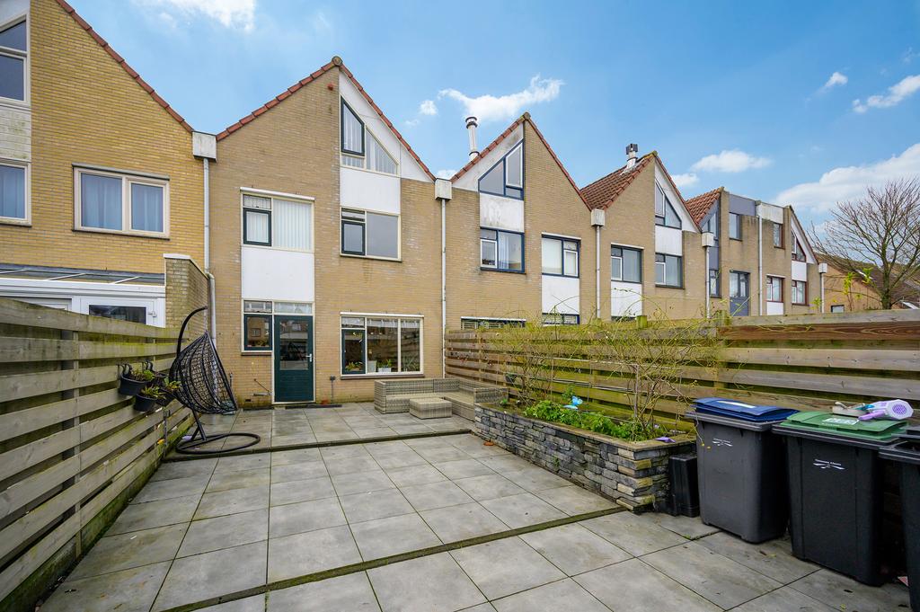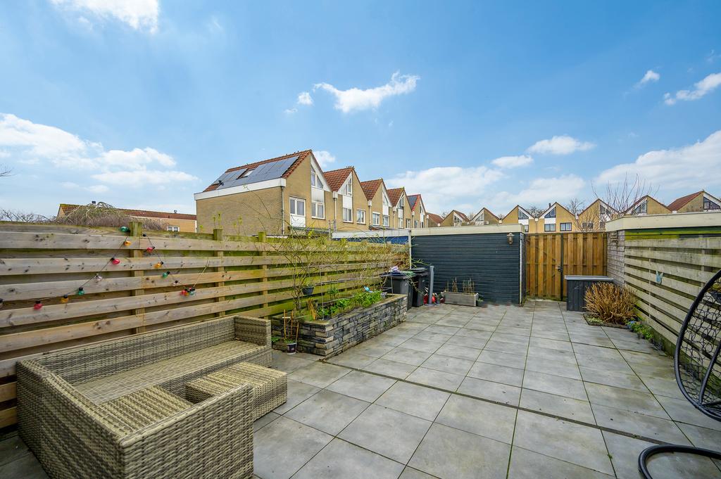 De tuin is eenvoudig maar praktisch aangelegd met een mooie stenen bestrating, die zorgt voor een nette en onderhoudsvriendelijke uitstraling. Ook beschikt de achtertuin over een houten berging en een achterom met een speelveldje voor de kinderen.
