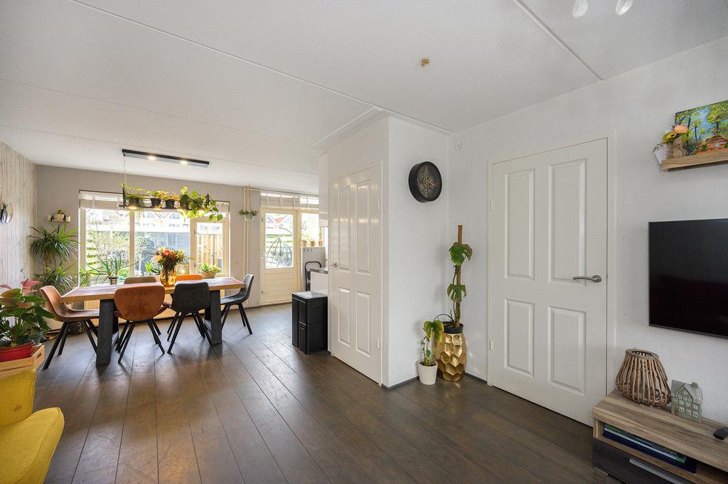 De woning heeft een entree/hal met een meterkast, een toiletruimte met een fonteintje en de trapopgang. Vanuit de hal komt u in de ruime woonkamer, welke is voorzien van een mooie lamelparketvloer en veel lichtinval. Aan de achterzijde van de woning bevindt zich de keuken, die in een L-vorm is opgesteld. Deze moderne inbouwkeuken is uitgerust met een combi-oven, koelkast, vriezer, inductiekookplaat, afzuigkap en een vaatwasser. Vanuit de keuken heeft u toegang tot de ruime achtertuin.