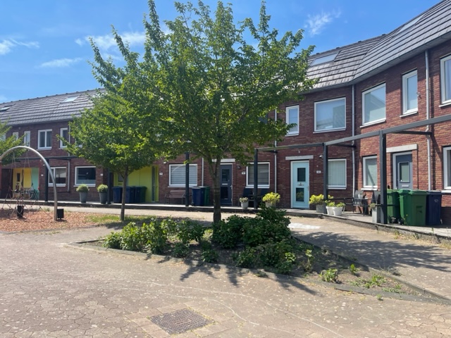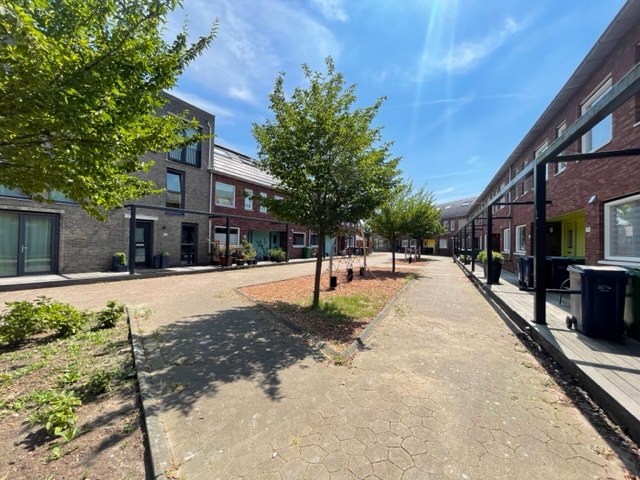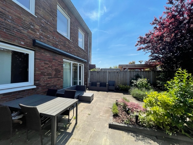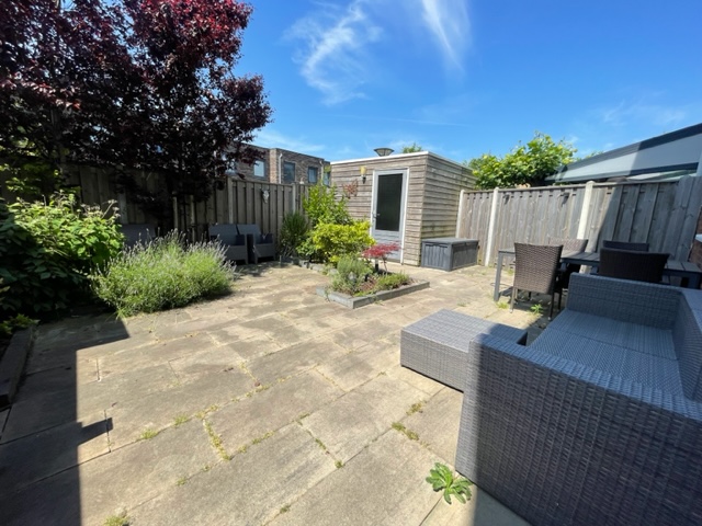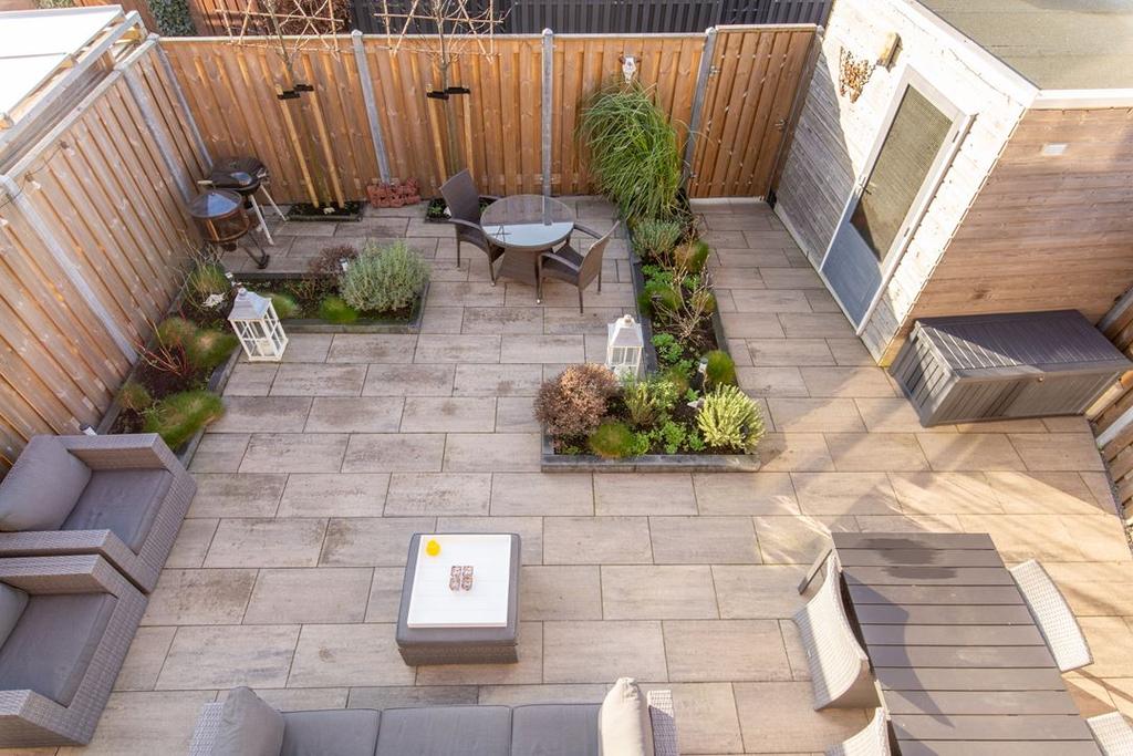 Fraai aangelegde achtertuin met sierbestrating, elektrisch zonnescherm en een houten berging. Achter de woning ligt een gemeenschappelijk binnenterrein. Het onderhoud van het terrein wordt door een VvE geregeld.