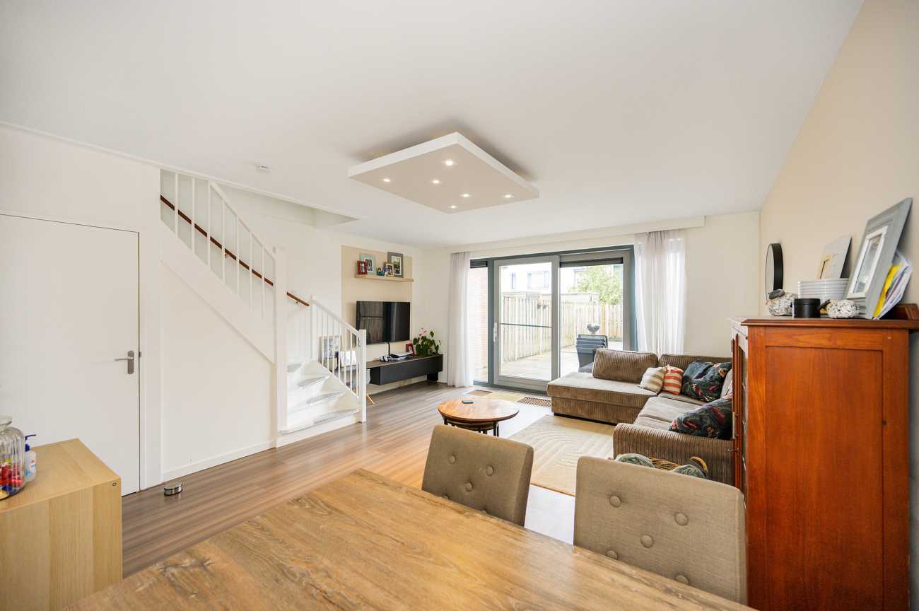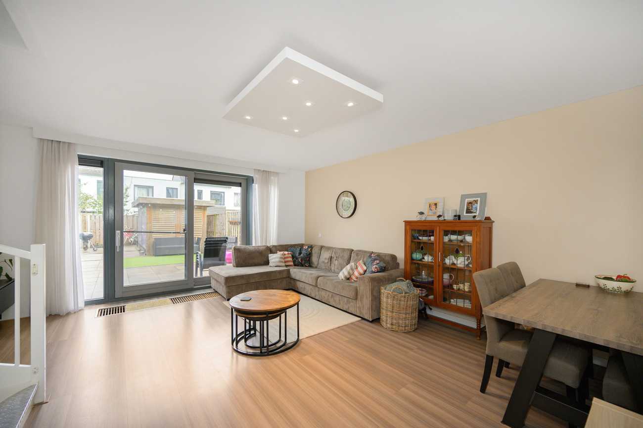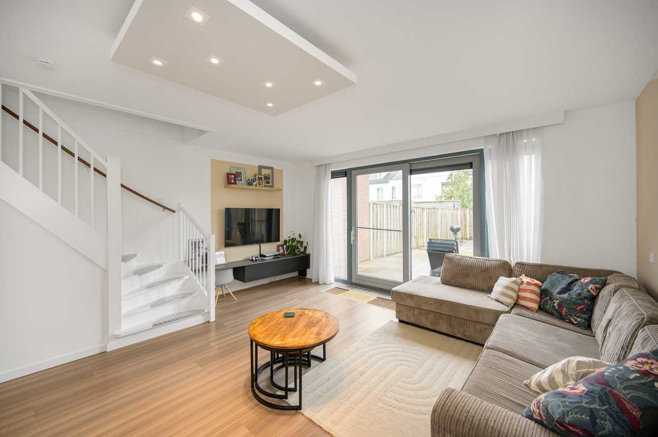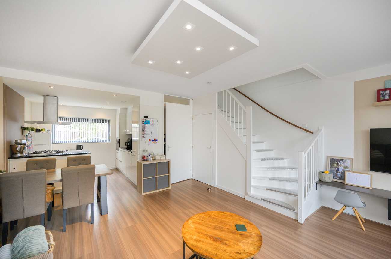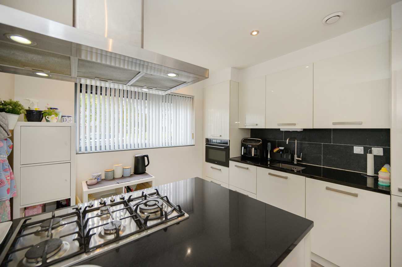 Via de mooi bestrate voortuin bereikt u de entree van de woning. De hal biedt toegang tot het moderne toilet, de meterkast en de tuingerichte woonkamer. Aan de voorzijde bevindt zich de open, hoogglans witte keuken met een royaal kookschiereiland. De keuken is volledig uitgerust met diverse inbouwapparatuur, waaronder een vaatwasser, gaskookplaat, afzuigkap, koel-vriescombinatie en combi-oven. Het granieten werkblad en de extra kasten in het eiland zorgen voor optimale bergruimte. De tuingerichte woonkamer straalt door de hoge raampartijen en de schuifpui een verrassend lichte en ruimtelijke sfeer uit. Vanuit de woonkamer is tevens de trap naar de eerste verdieping bereikbaar, met praktische trappenkast. De gehele benedenverdieping is afgewerkt met een fraaie laminaatvloer en keurig afgewerkte wanden, wat bijdraagt aan een verzorgde en uitnodigende uitstraling.