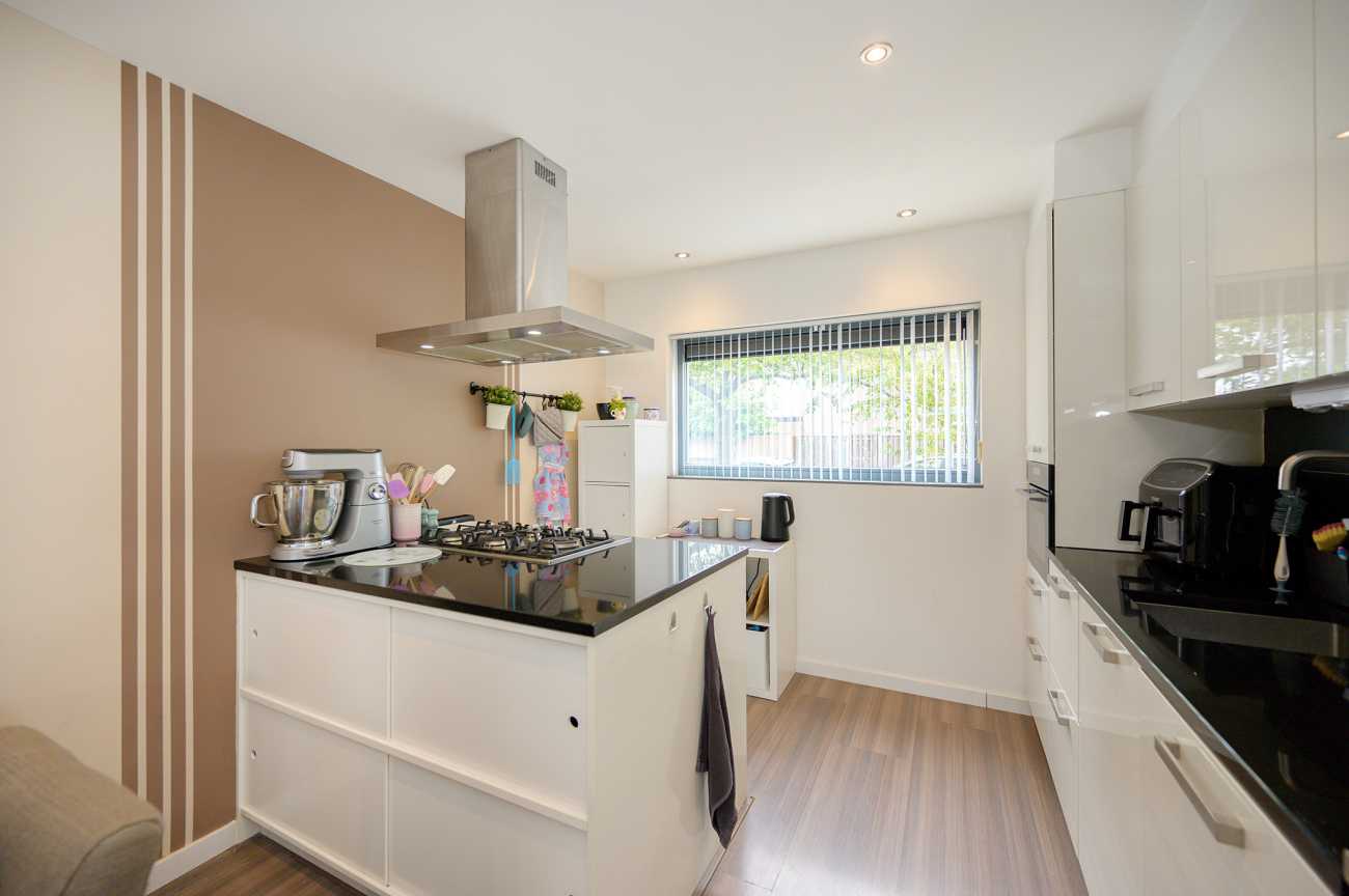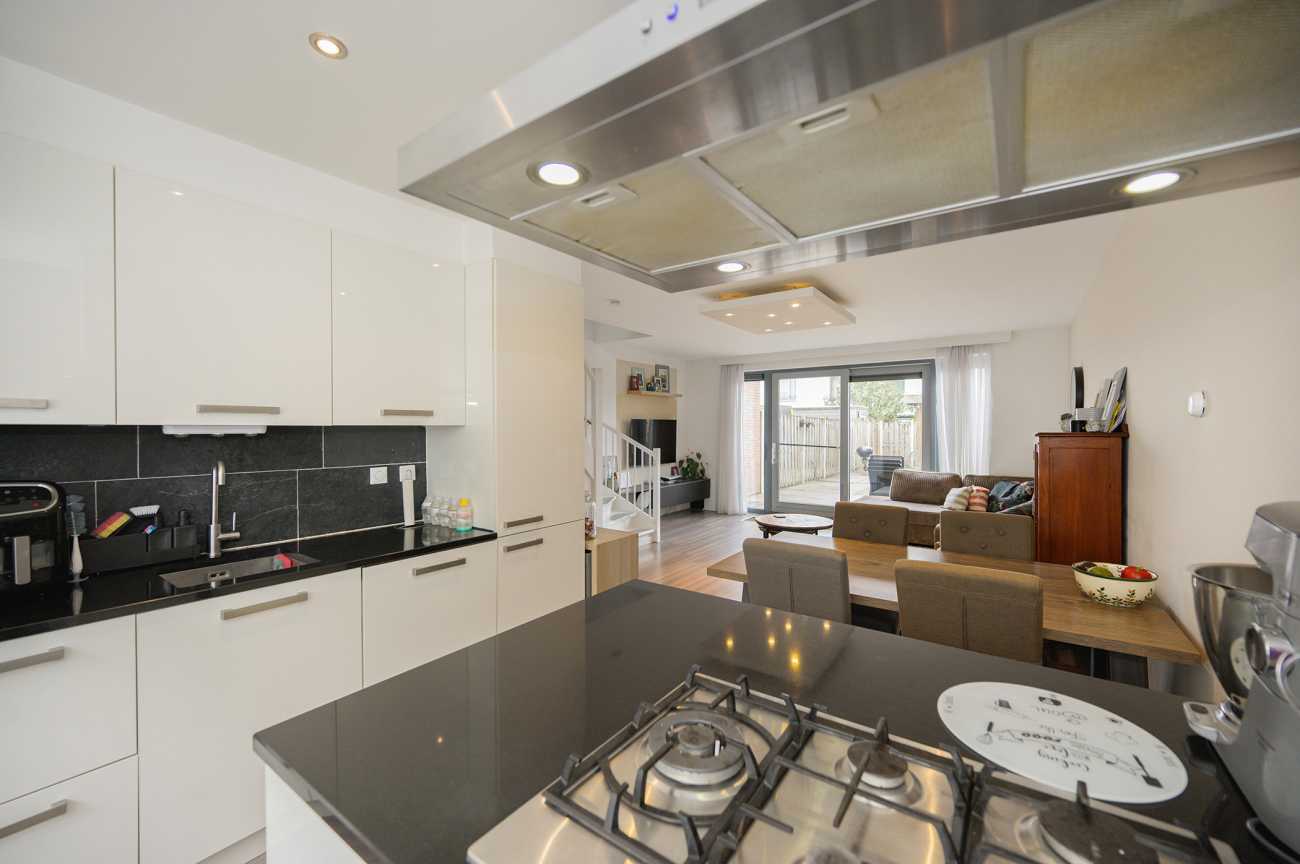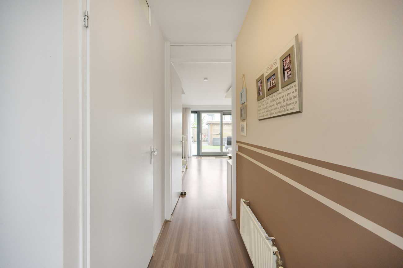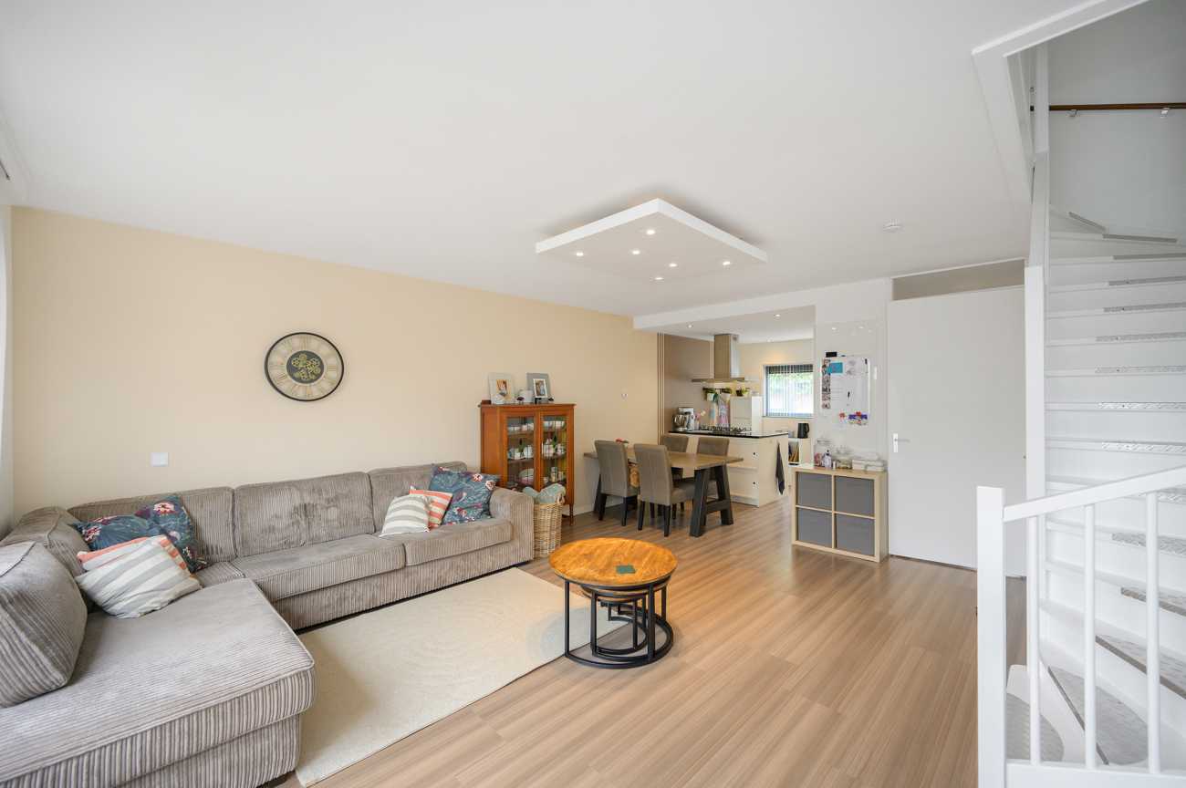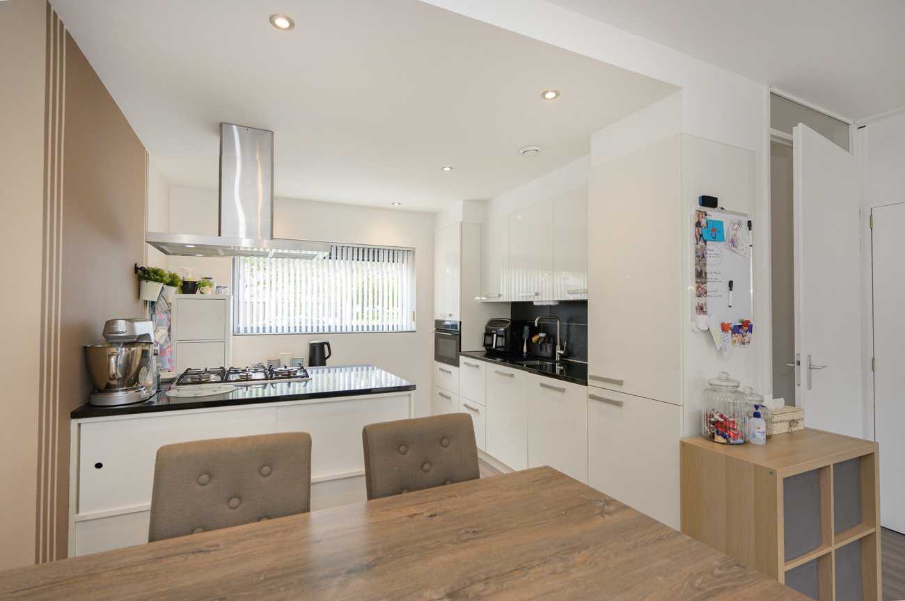 Via de mooi bestrate voortuin bereikt u de entree van de woning. De hal biedt toegang tot het moderne toilet, de meterkast en de tuingerichte woonkamer. Aan de voorzijde bevindt zich de open, hoogglans witte keuken met een royaal kookschiereiland. De keuken is volledig uitgerust met diverse inbouwapparatuur, waaronder een vaatwasser, gaskookplaat, afzuigkap, koel-vriescombinatie en combi-oven. Het granieten werkblad en de extra kasten in het eiland zorgen voor optimale bergruimte. De tuingerichte woonkamer straalt door de hoge raampartijen en de schuifpui een verrassend lichte en ruimtelijke sfeer uit. Vanuit de woonkamer is tevens de trap naar de eerste verdieping bereikbaar, met praktische trappenkast. De gehele benedenverdieping is afgewerkt met een fraaie laminaatvloer en keurig afgewerkte wanden, wat bijdraagt aan een verzorgde en uitnodigende uitstraling.