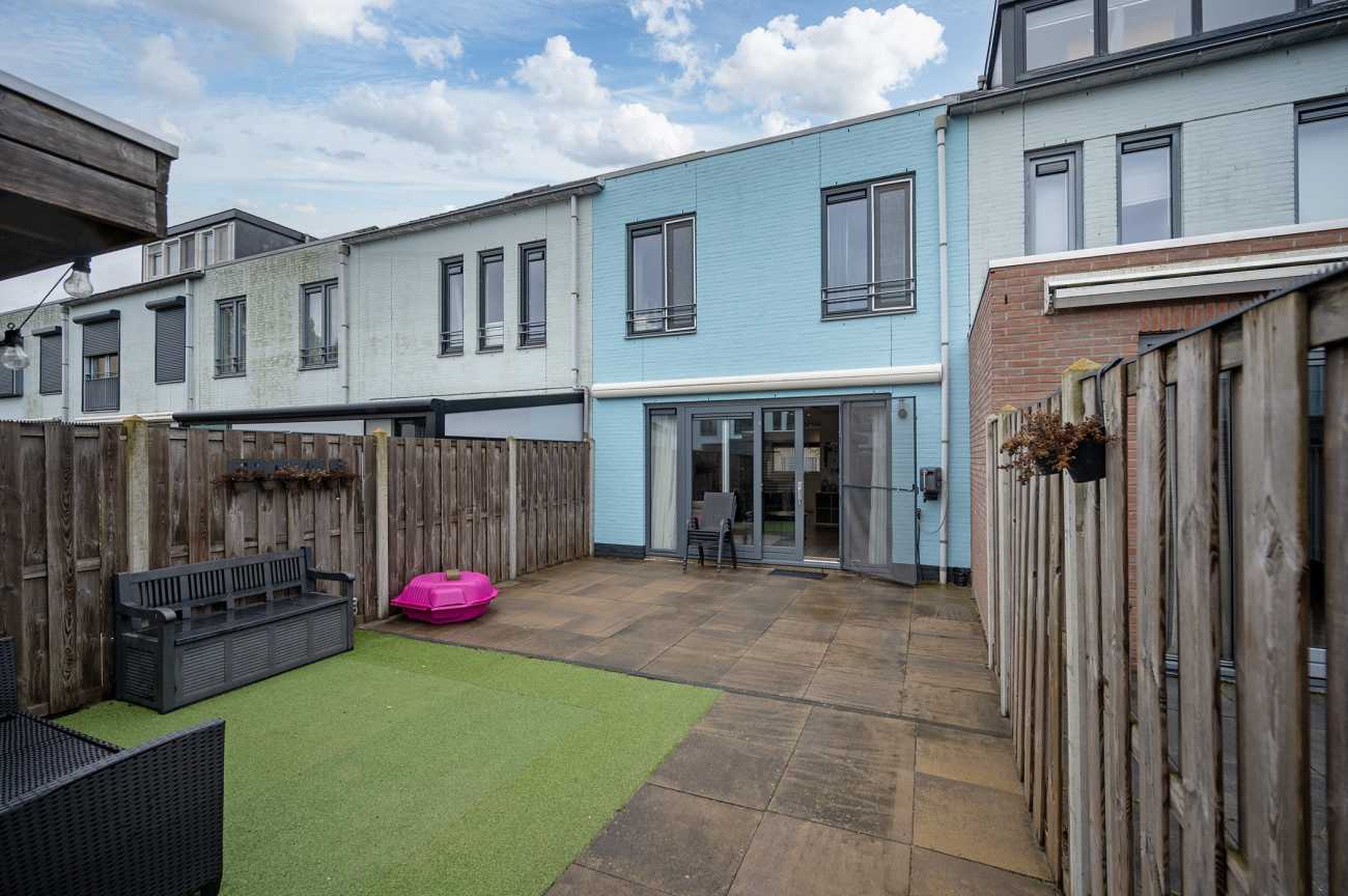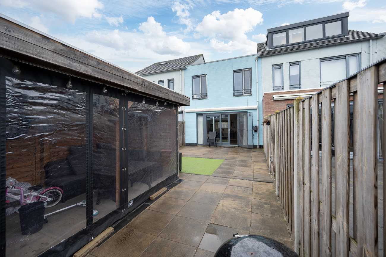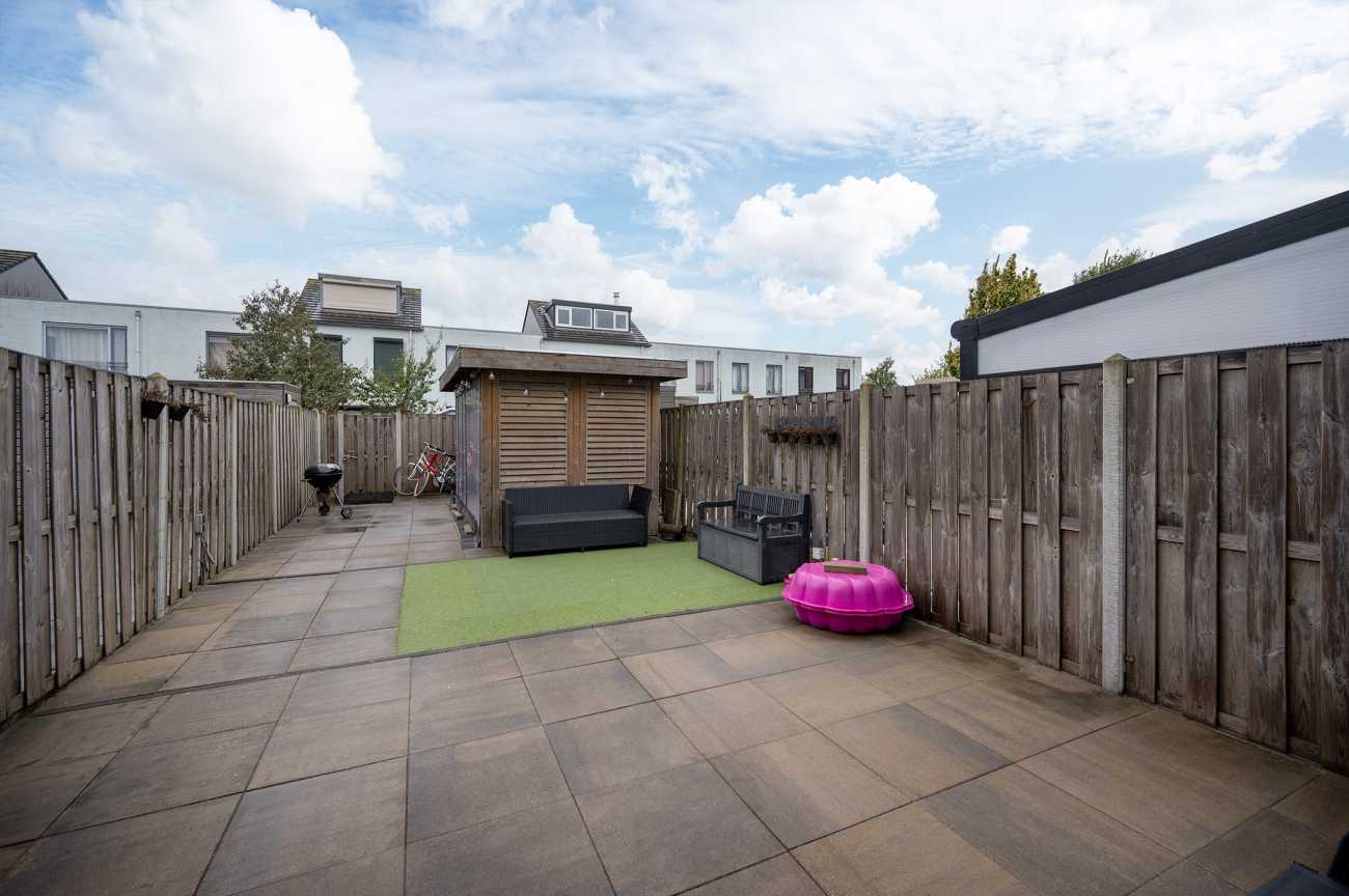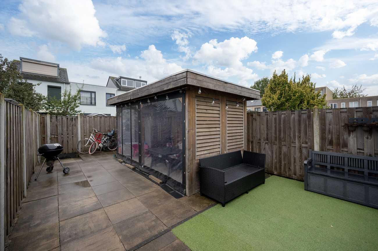 De achtertuin, gelegen op het zonnige zuidwesten, beschikt over een houten berging, een achterom en elektrische zonwering. Achterin de tuin is een overkapping/tuinhuis aanwezig, een ideale plek om in het voorjaar en de zomer van het buitenleven te genieten.