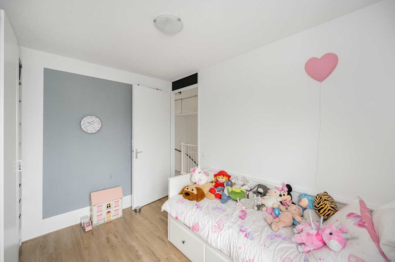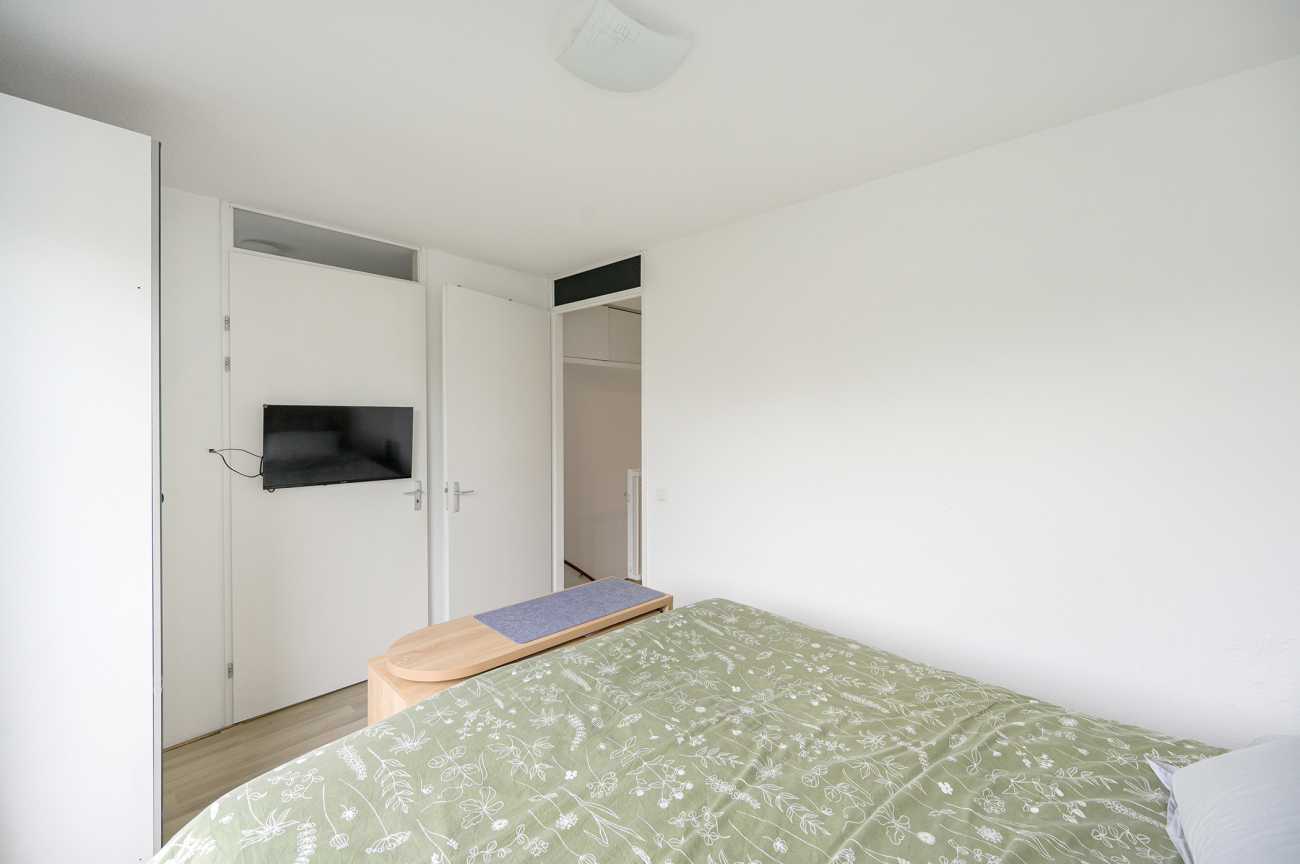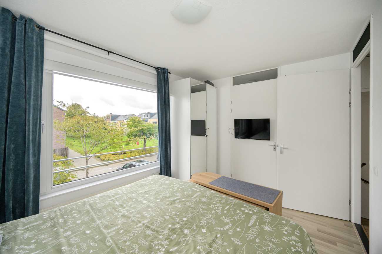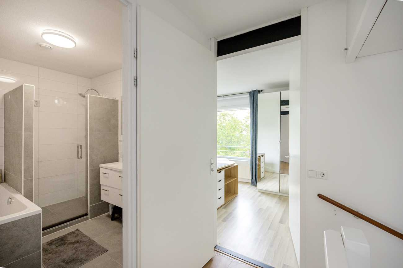 De overloop biedt toegang tot drie goed bemeten slaapkamers en de grote badkamer. Twee slaapkamers bevinden zich aan de achterzijde en zijn ideaal in te richten als werk- of kinderkamer. De masterbedroom, gelegen aan de voorzijde, biedt toegang tot de technische ruimte, waarin de opstelplaats van de wasmachine, droger, mechanische ventilatie en cv-ketel is gesitueerd. De badkamer is ruim van opzet en volledig betegeld. Deze beschikt over een inloopdouche, een breed wastafelmeubel, een vrijhangend closet en een groot diep ligbad. Voor extra bergruimte zijn in het trappengat van de overloop schuifkasten geplaatst, wat zorgt voor een praktische en overzichtelijke indeling.