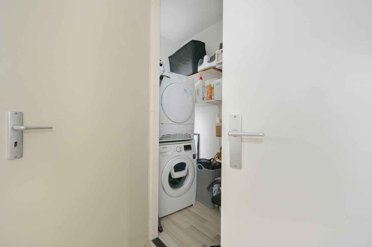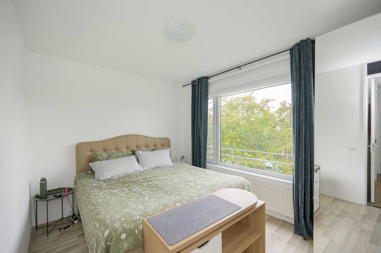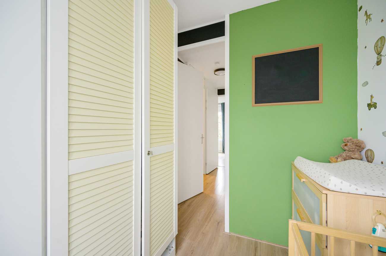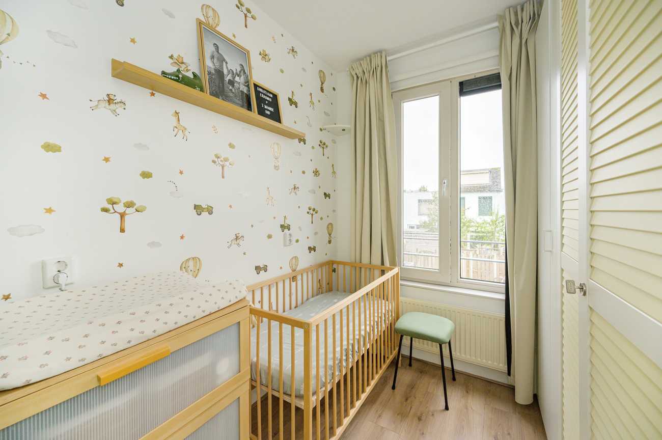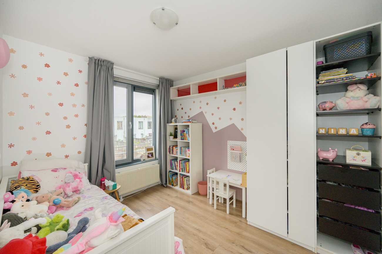De overloop biedt toegang tot drie goed bemeten slaapkamers en de grote badkamer. Twee slaapkamers bevinden zich aan de achterzijde en zijn ideaal in te richten als werk- of kinderkamer. De masterbedroom, gelegen aan de voorzijde, biedt toegang tot de technische ruimte, waarin de opstelplaats van de wasmachine, droger, mechanische ventilatie en cv-ketel is gesitueerd. De badkamer is ruim van opzet en volledig betegeld. Deze beschikt over een inloopdouche, een breed wastafelmeubel, een vrijhangend closet en een groot diep ligbad. Voor extra bergruimte zijn in het trappengat van de overloop schuifkasten geplaatst, wat zorgt voor een praktische en overzichtelijke indeling.
