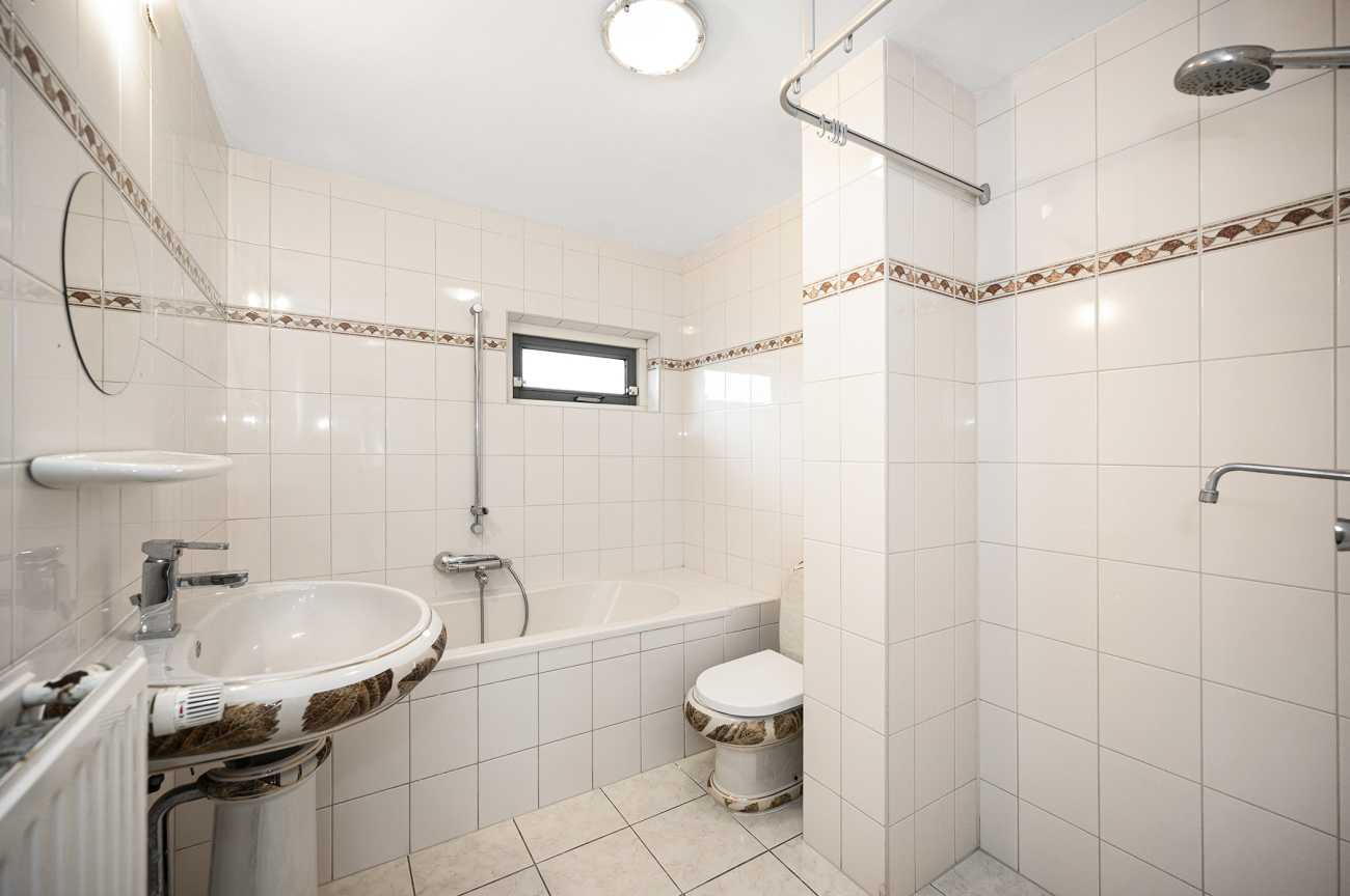 De overloop geeft toegang tot twee ruime en goed bemeten slaapkamers en de badkamer. De badkamer beschikt over een ligbad, separate douche, toilet en wastafel, waardoor deze ruimte van alle gemakken is voorzien. De gehele verdieping is afgewerkt met een nette laminaatvloer, wat zorgt voor een verzorgde en uniforme uitstraling.