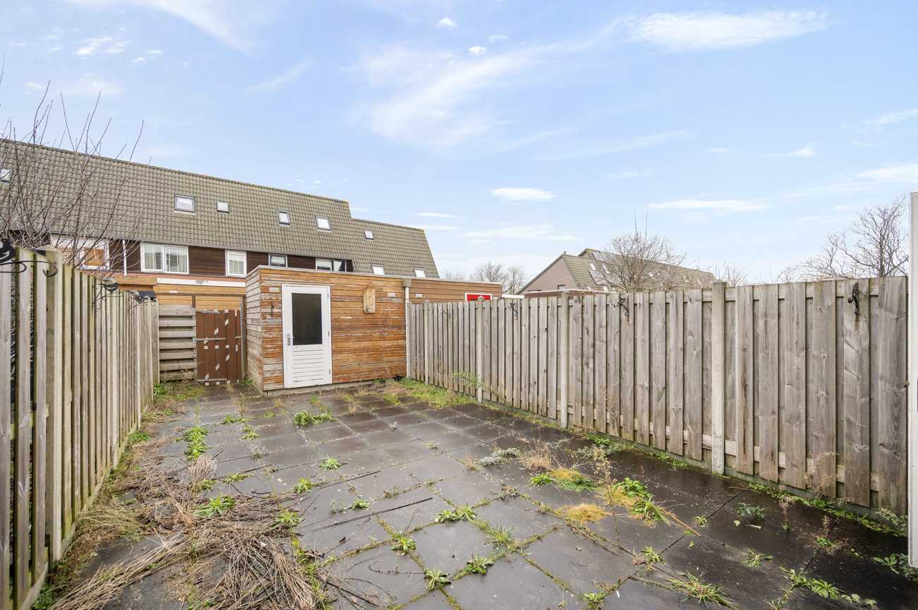 De achtertuin is volledig bestraat en gunstig gelegen op het noordwesten. Hierdoor kunt u op zomerse dagen niet alleen overdag, maar ook in de avonduren nog heerlijk van de zon genieten. In de tuin bevindt zich een houten berging met elektra, ideaal voor fietsen en opslag, en er is een praktische achterom aanwezig.