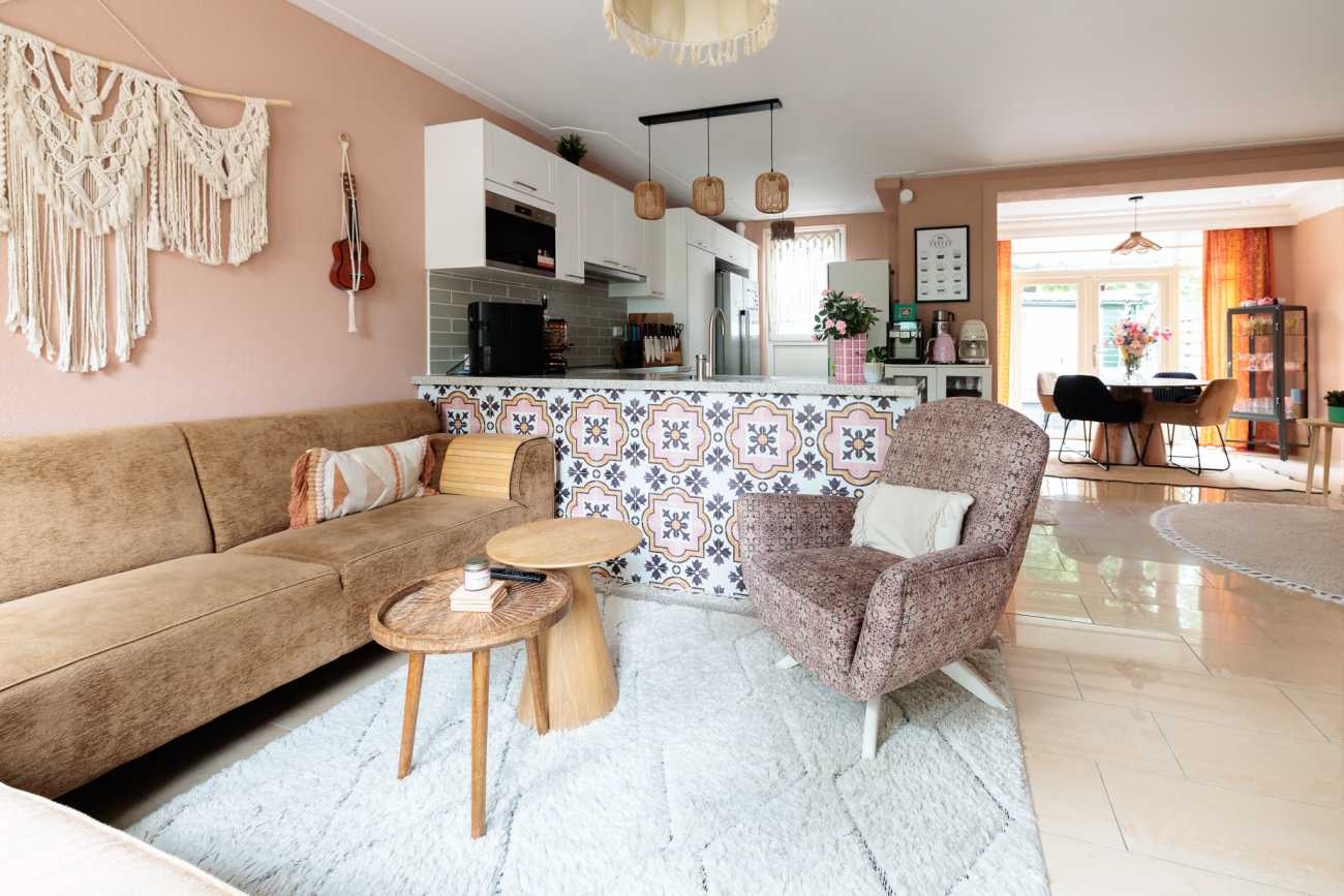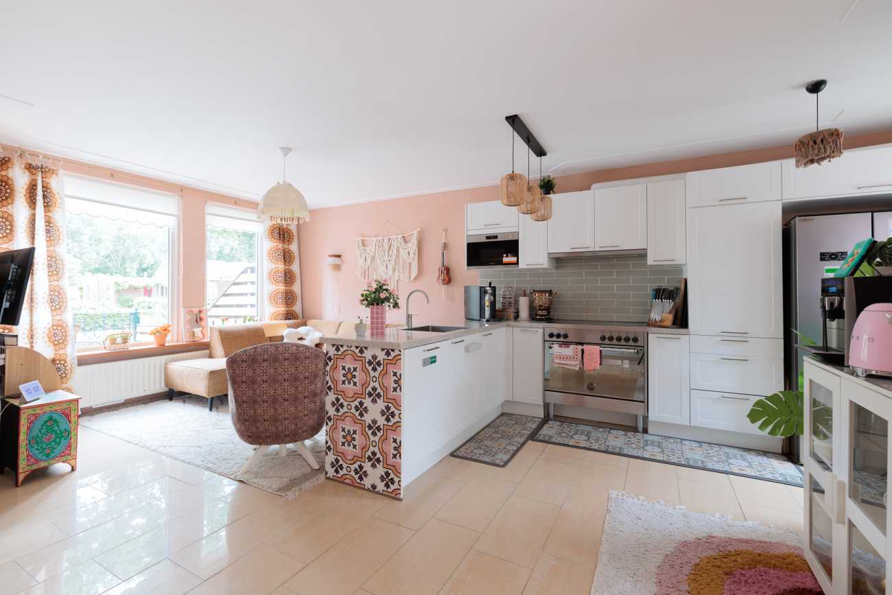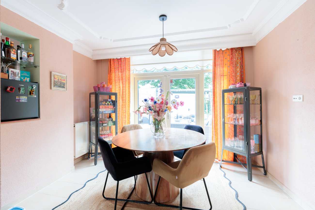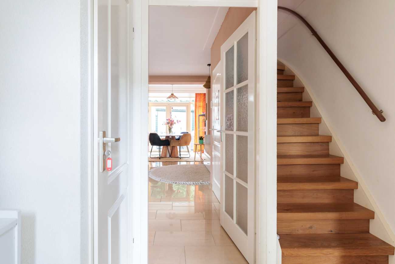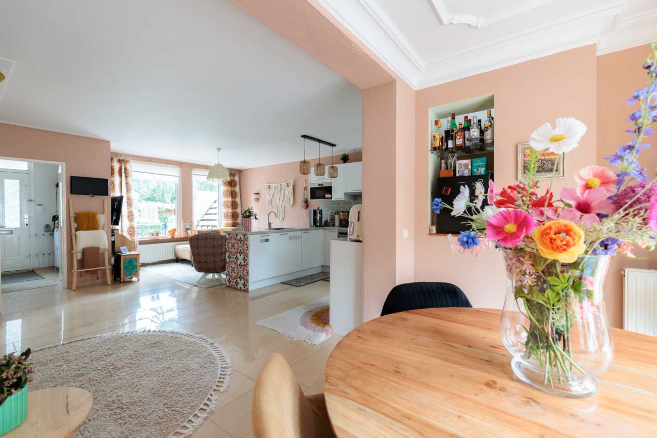 Bij binnenkomst treft u een ruime hal met de meterkast, een modern zwevend toilet met fonteintje, de trapopgang naar de eerste verdieping en toegang tot de woonkamer. De woonkamer is aan de achterzijde uitgebouwd en biedt hierdoor extra leefruimte. De sfeervolle zithoek en de apart ingerichte eethoek zorgen voor een warme, huiselijke ambiance.
