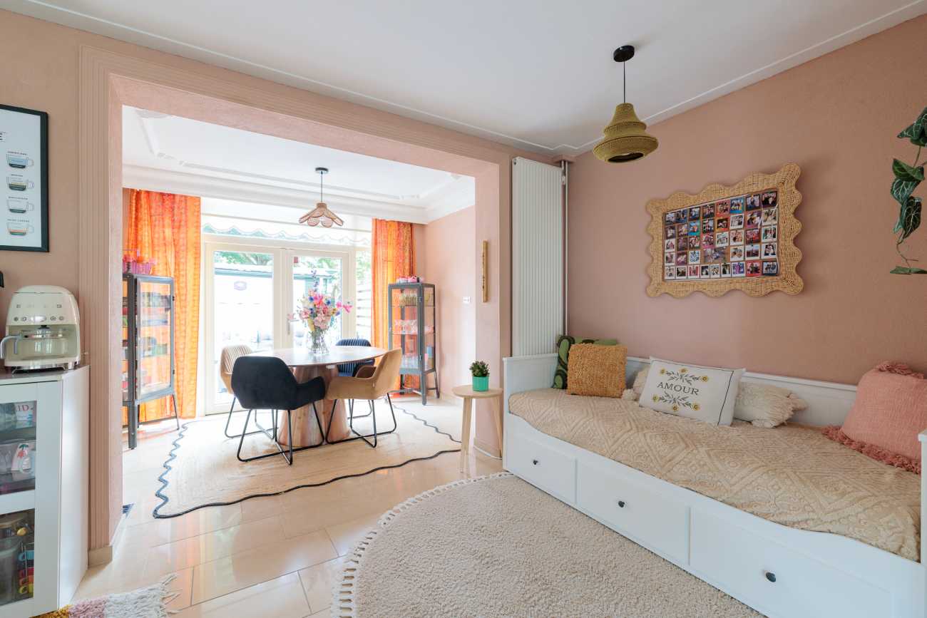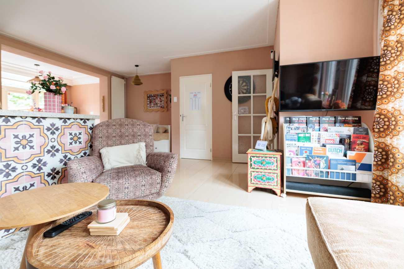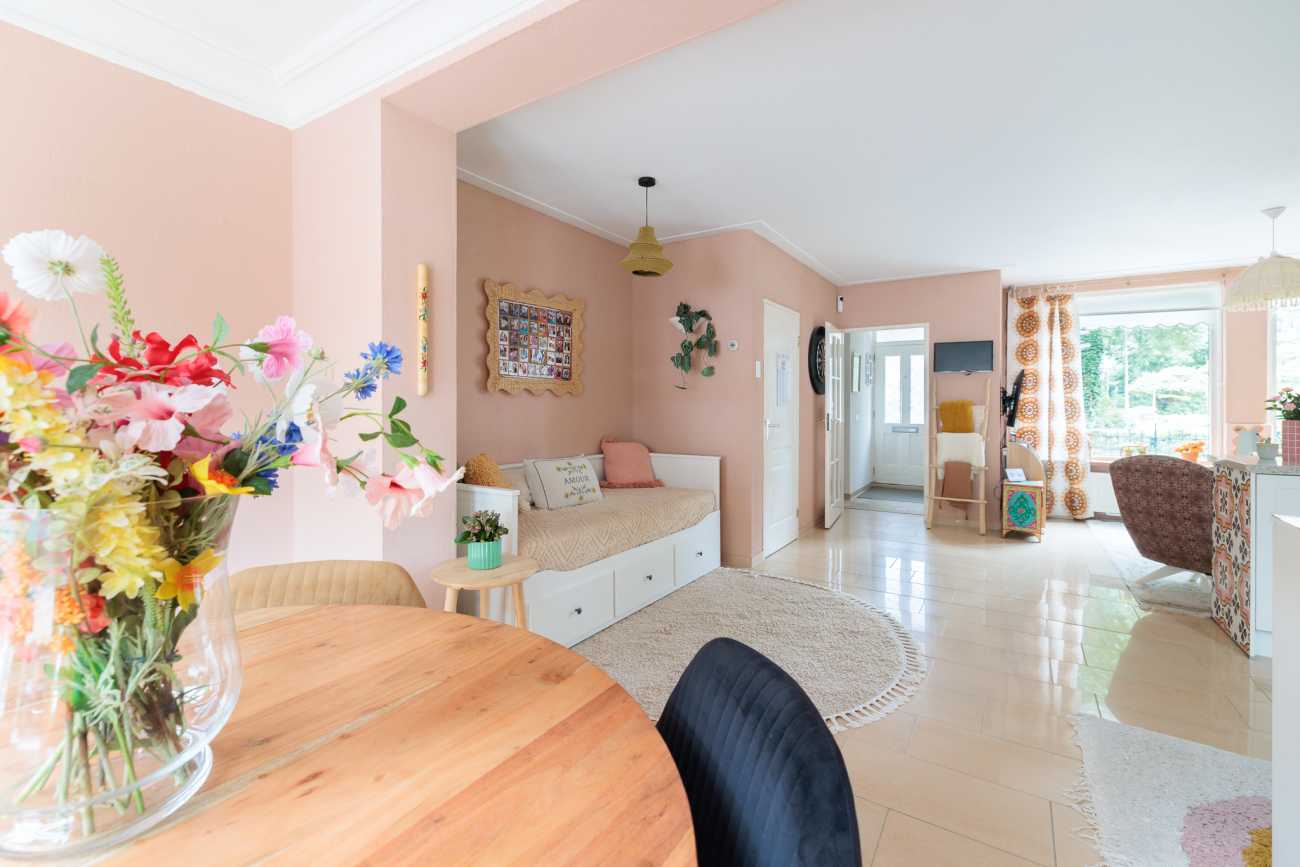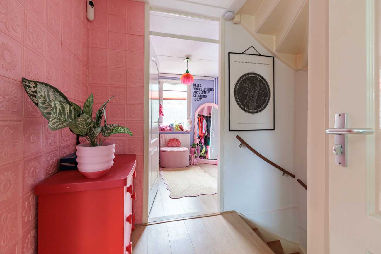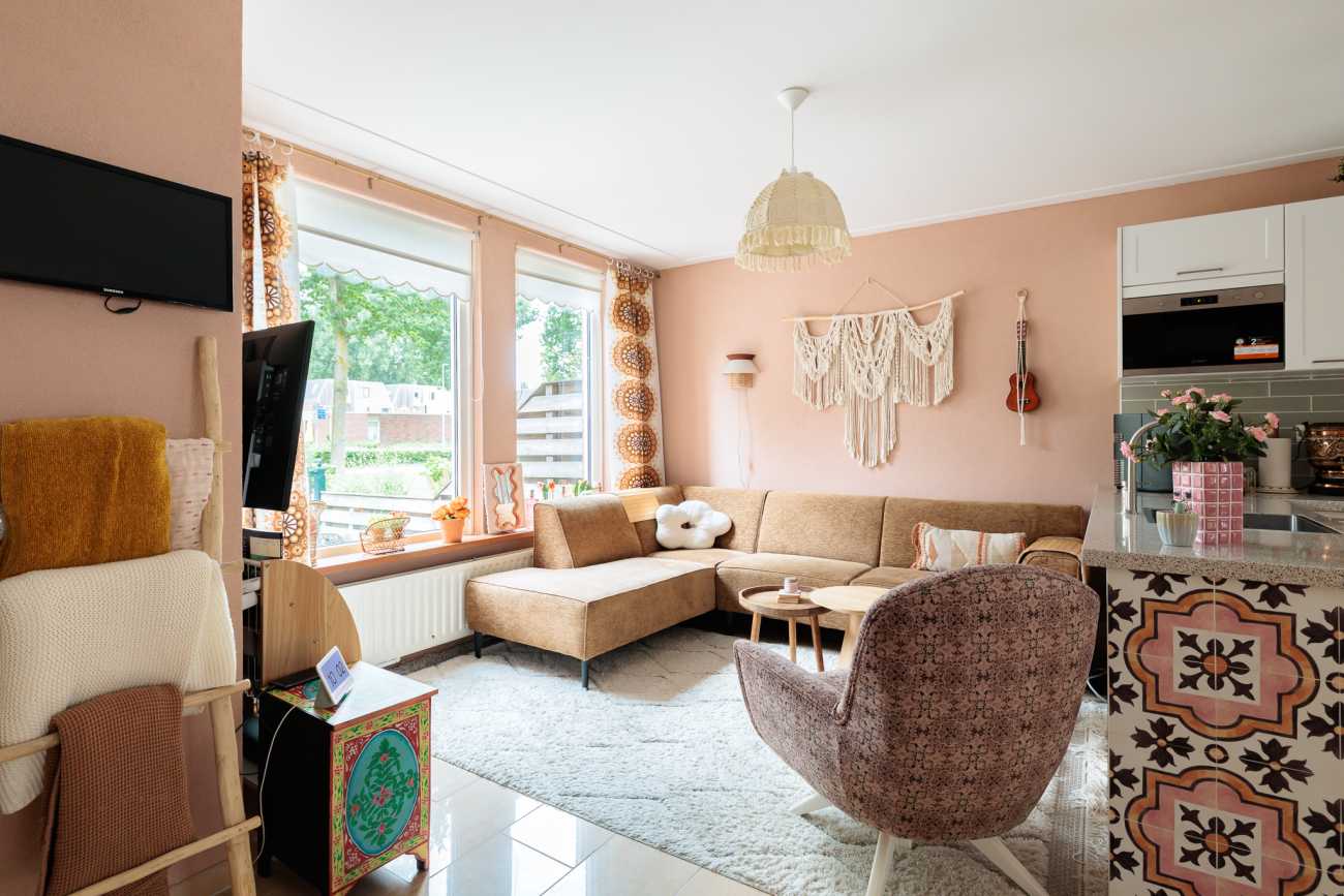 Bij binnenkomst treft u een ruime hal met de meterkast, een modern zwevend toilet met fonteintje, de trapopgang naar de eerste verdieping en toegang tot de woonkamer. De woonkamer is aan de achterzijde uitgebouwd en biedt hierdoor extra leefruimte. De sfeervolle zithoek en de apart ingerichte eethoek zorgen voor een warme, huiselijke ambiance.