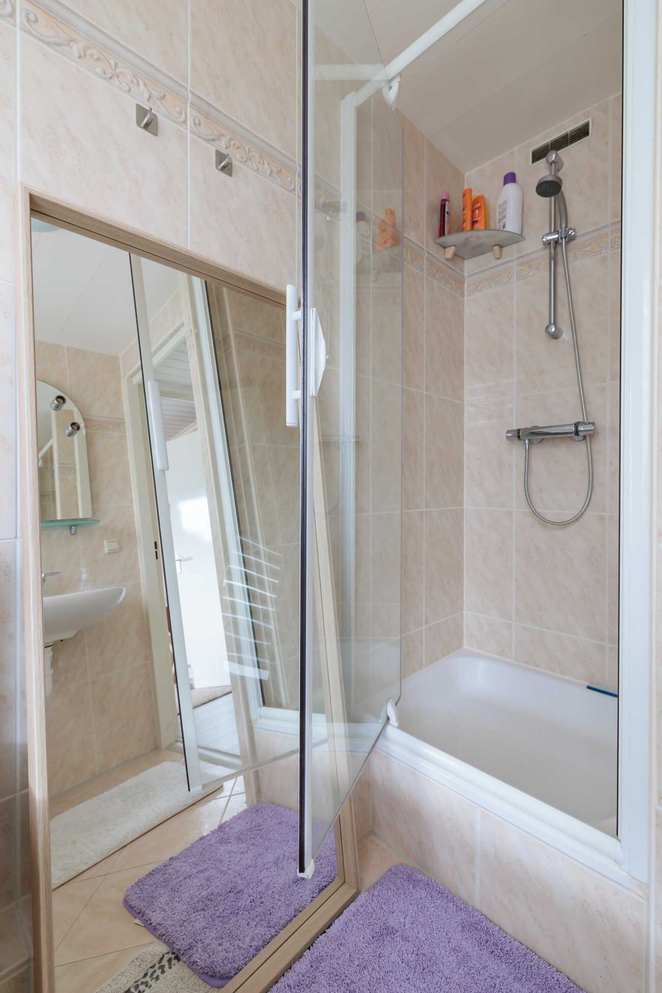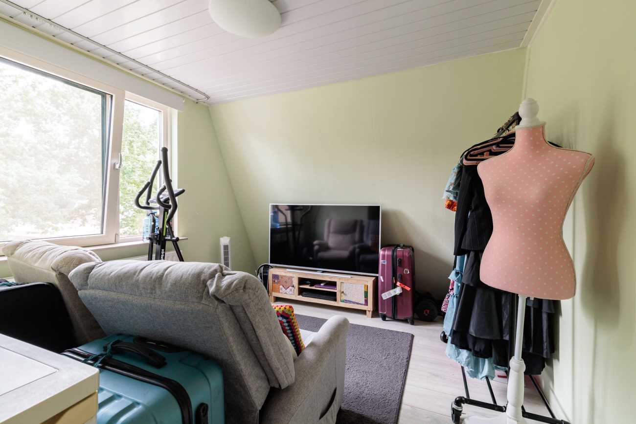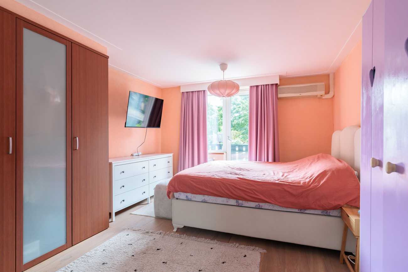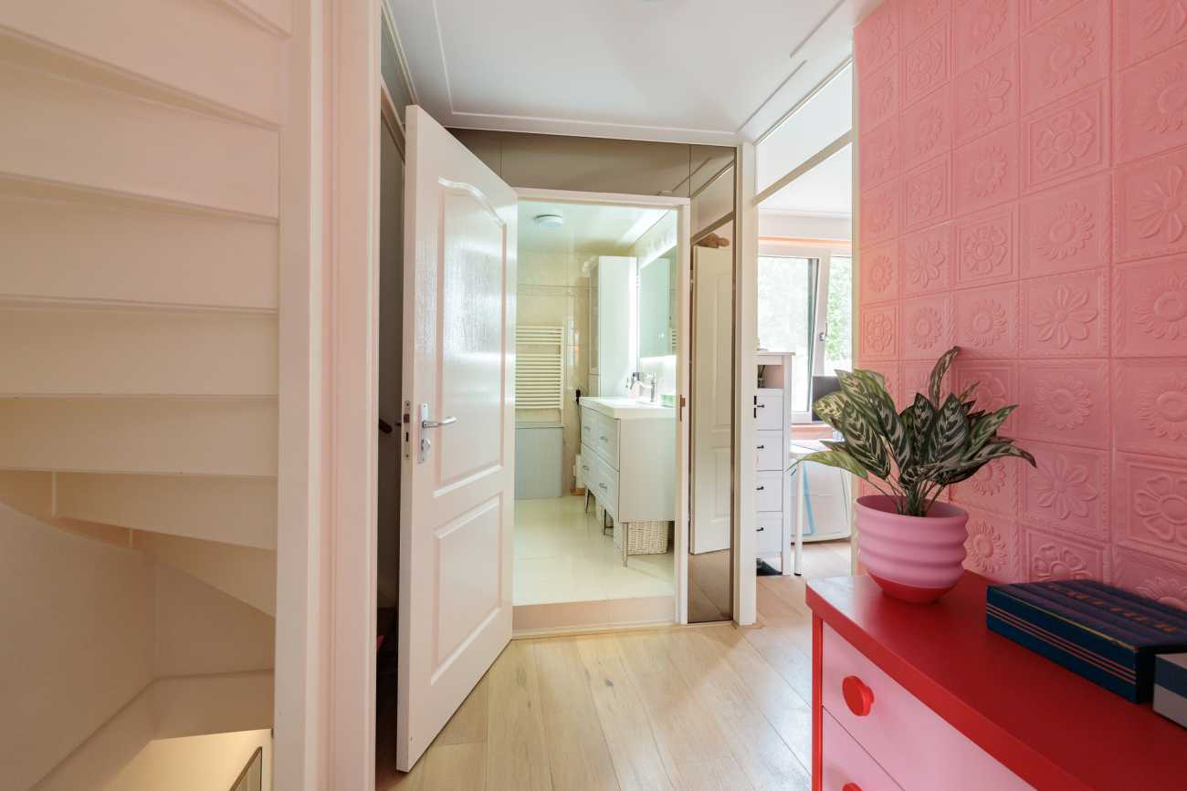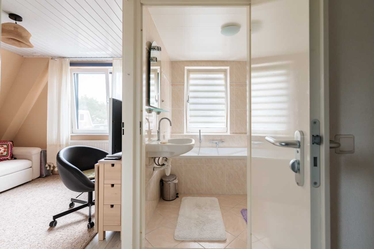 Via de overloop bereikt u twee slaapkamers en de eerste badkamer. De masterbedroom (ca. 19 m²) is zeer ruim en beschikt over een eigen balkon en airconditioning, ideaal voor warme zomerdagen. De tweede slaapkamer is praktisch van formaat en kan worden ingericht als slaapkamer, werk- of hobbyruimte. De badkamer is volledig betegeld en voorzien van een ruime douche, zwevend toilet, wastafelmeubel, designradiator en een raam voor natuurlijke ventilatie. Deze verdieping is afgewerkt met een nette laminaatvloer.