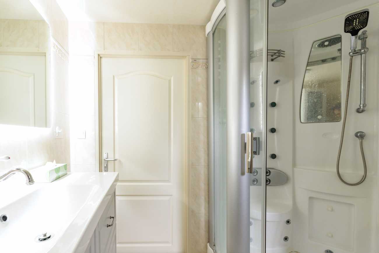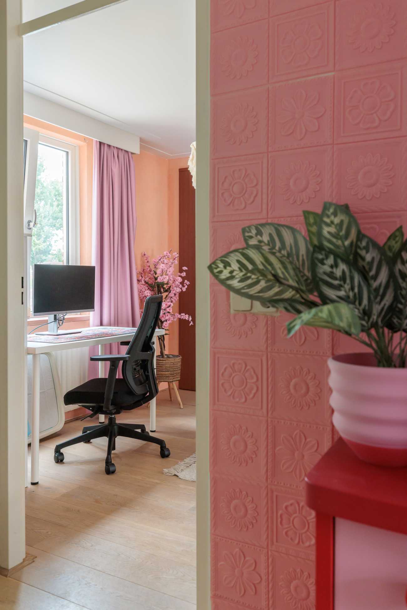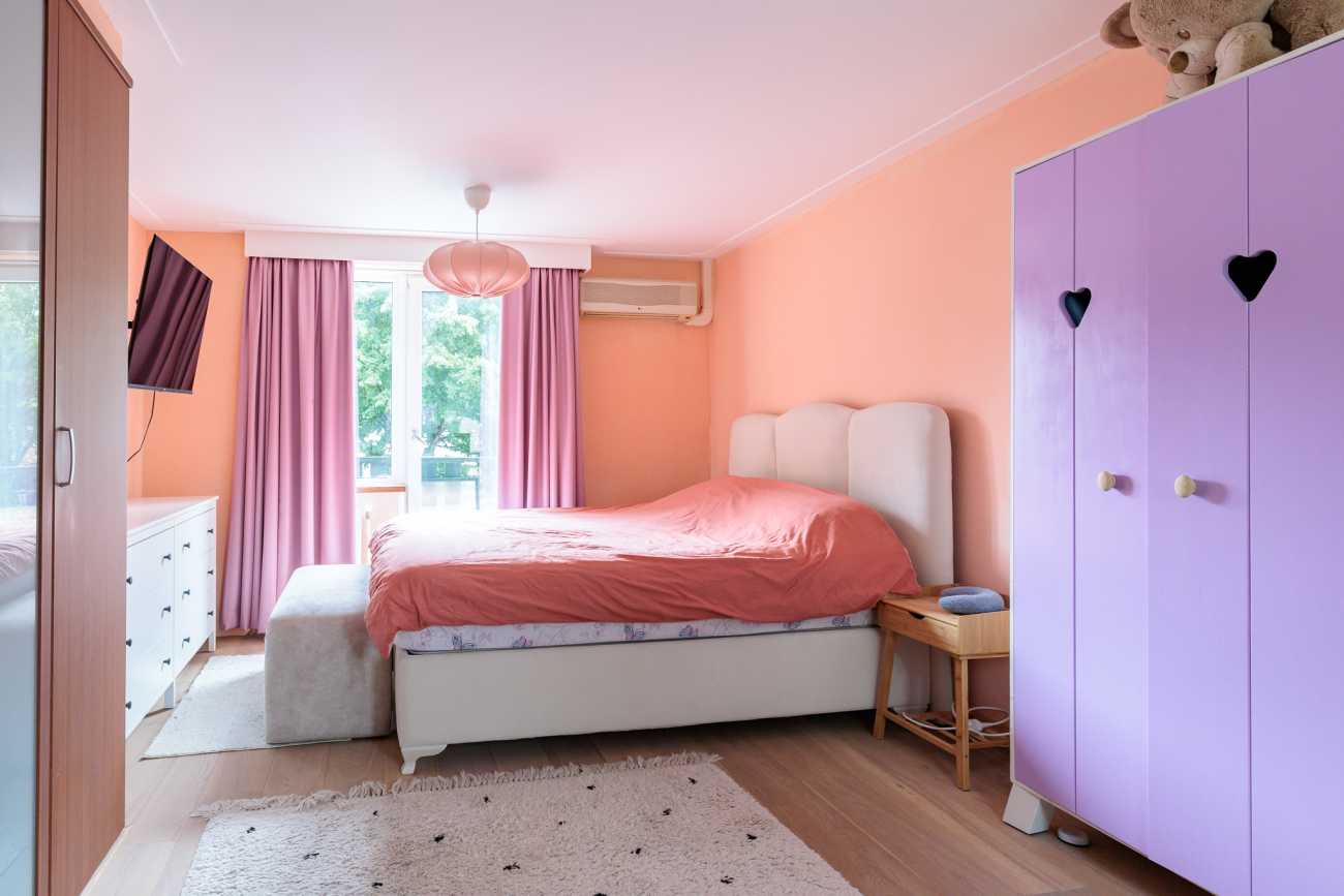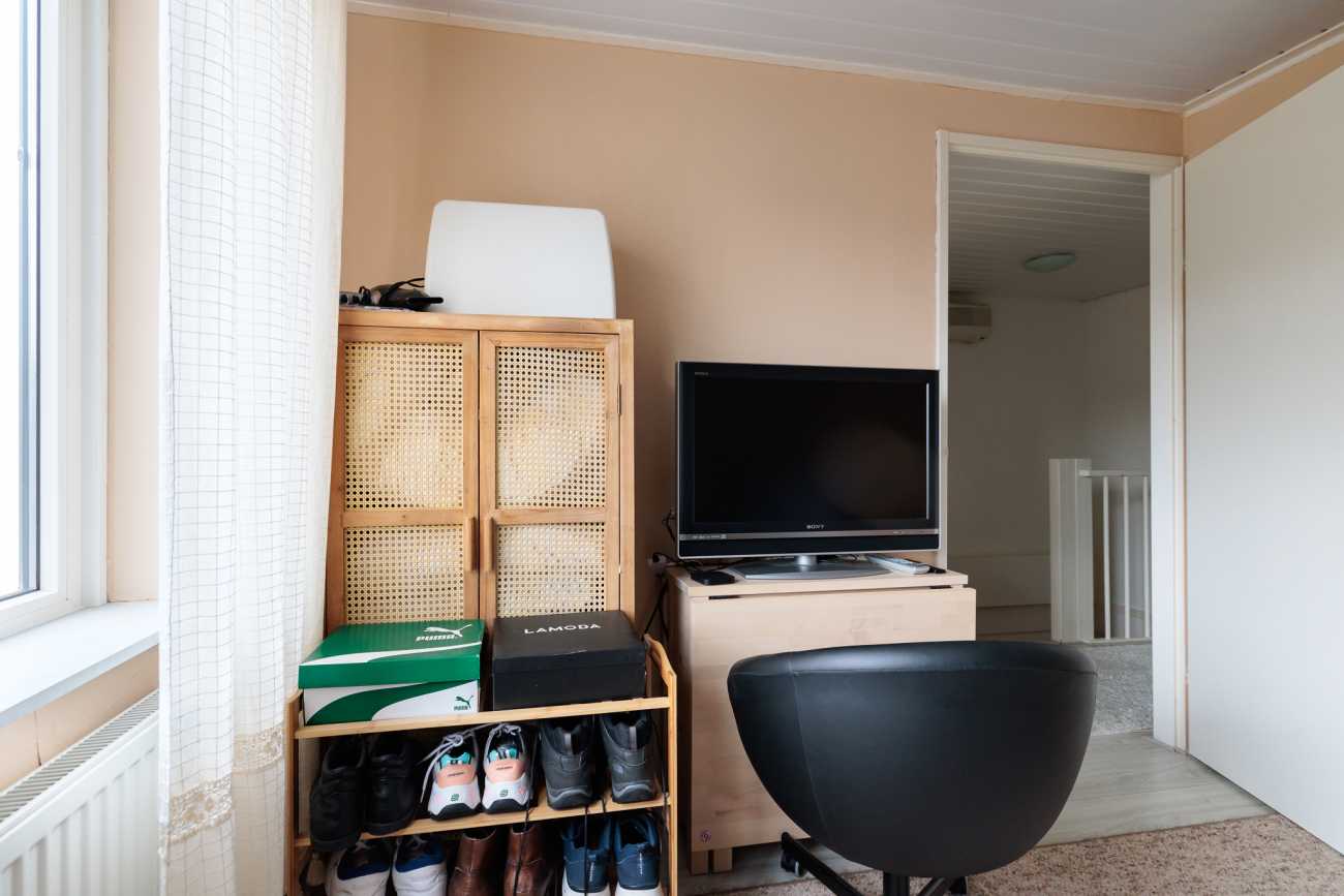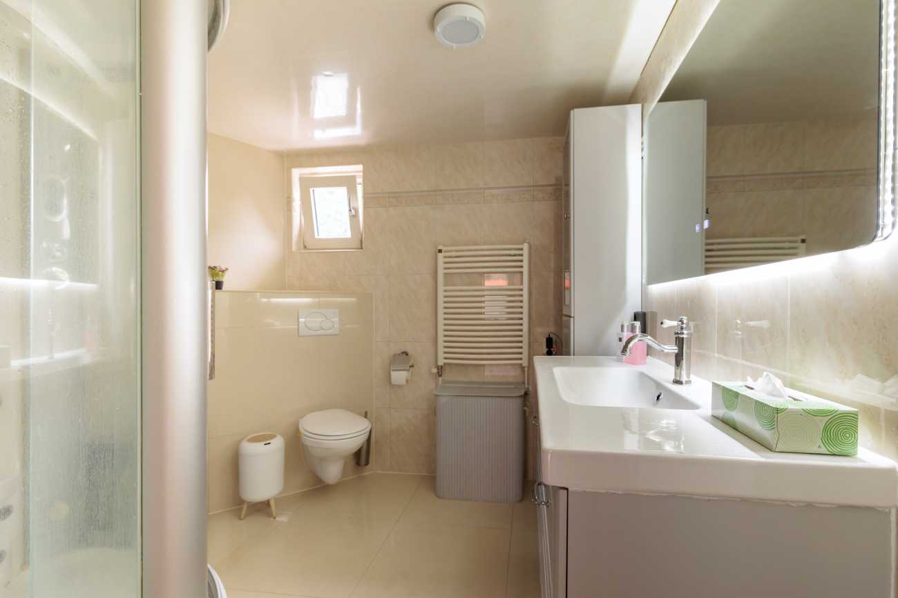 Via de overloop bereikt u twee slaapkamers en de eerste badkamer. De masterbedroom (ca. 19 m²) is zeer ruim en beschikt over een eigen balkon en airconditioning, ideaal voor warme zomerdagen. De tweede slaapkamer is praktisch van formaat en kan worden ingericht als slaapkamer, werk- of hobbyruimte. De badkamer is volledig betegeld en voorzien van een ruime douche, zwevend toilet, wastafelmeubel, designradiator en een raam voor natuurlijke ventilatie. Deze verdieping is afgewerkt met een nette laminaatvloer.