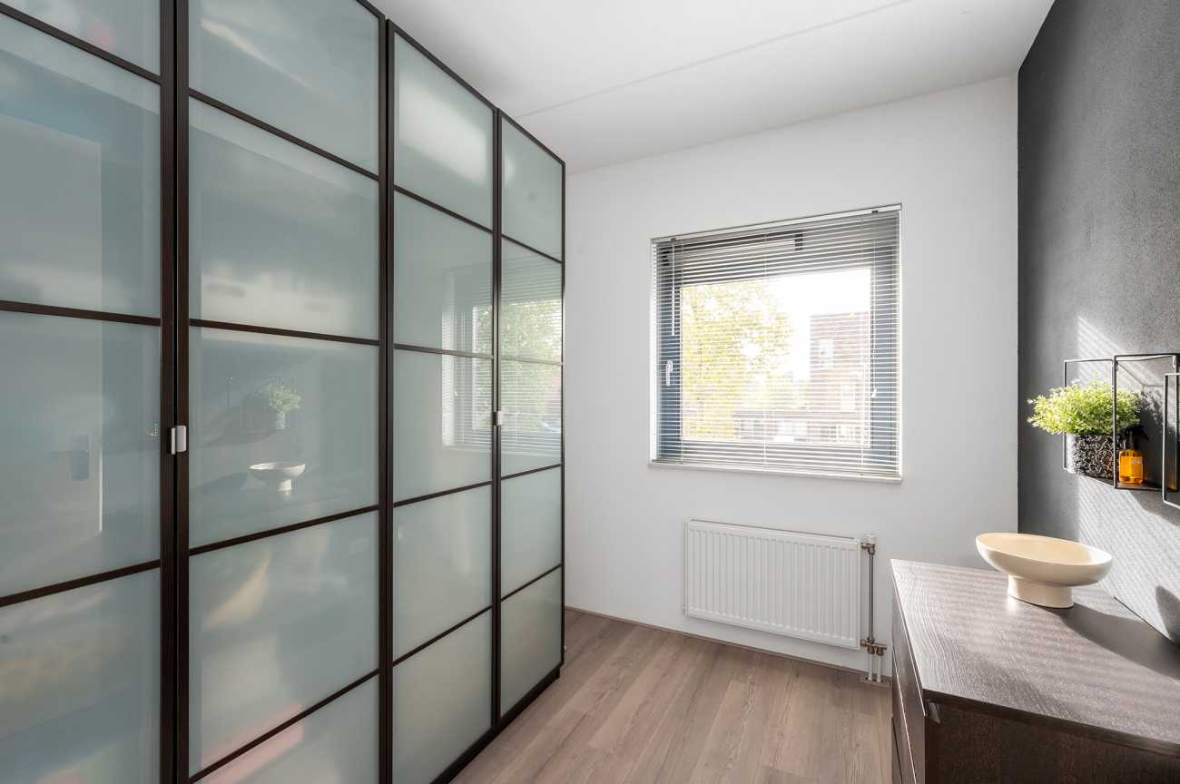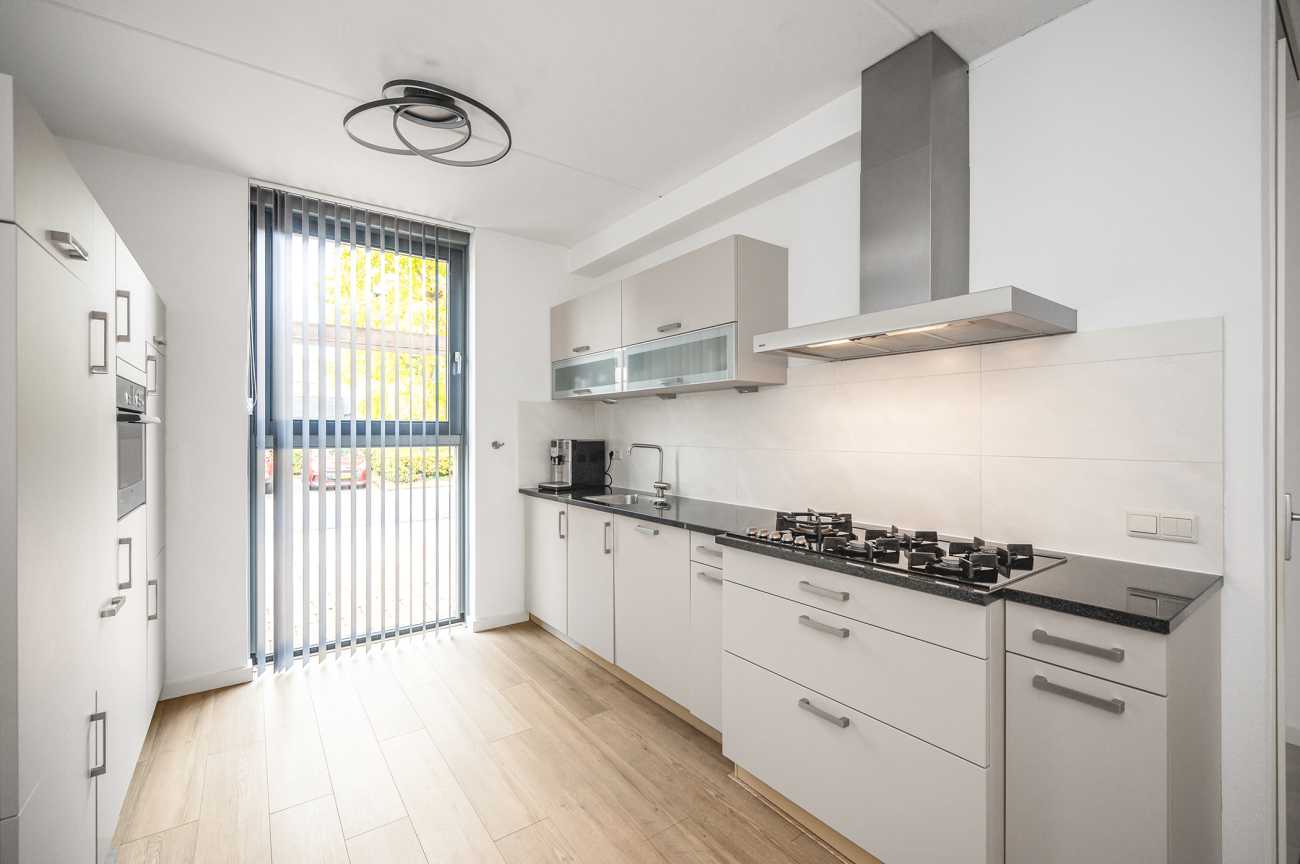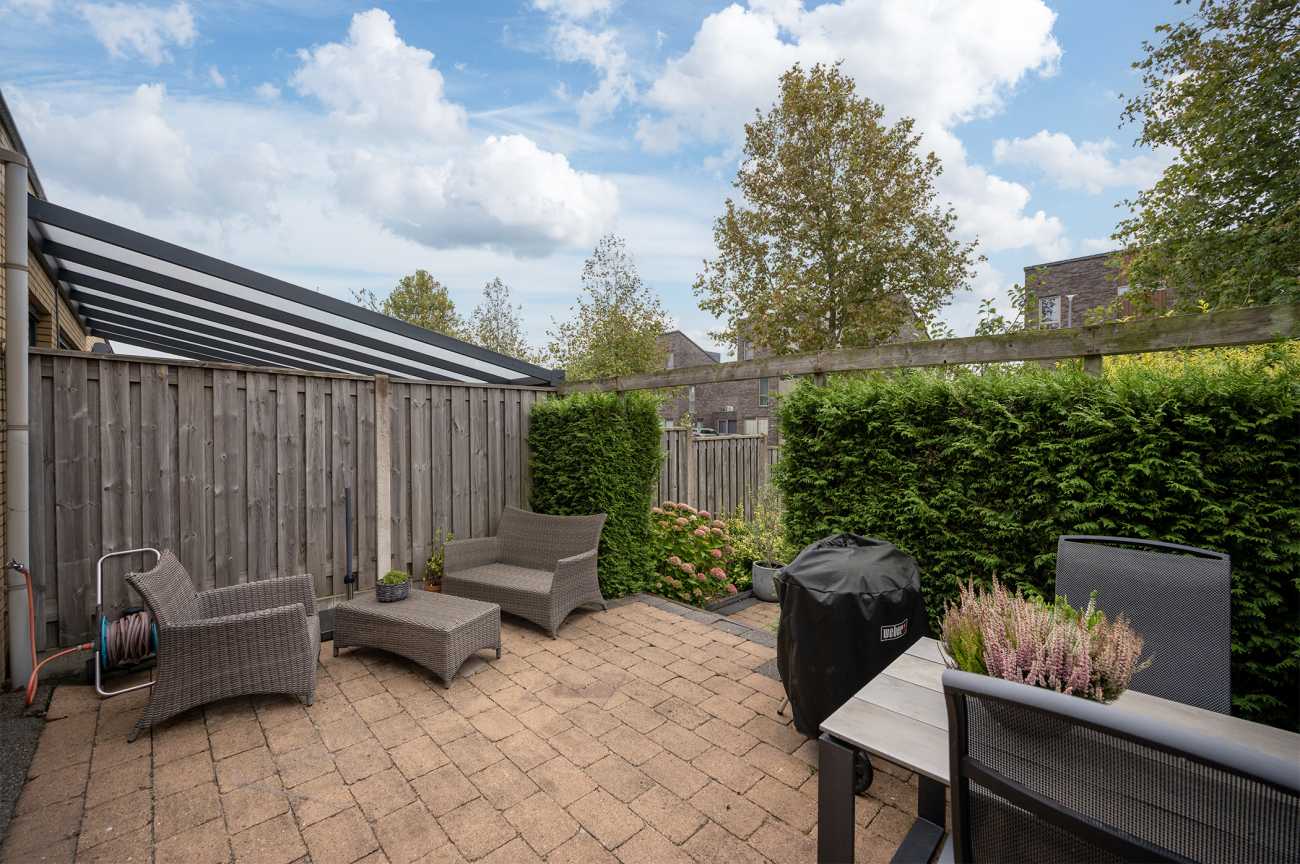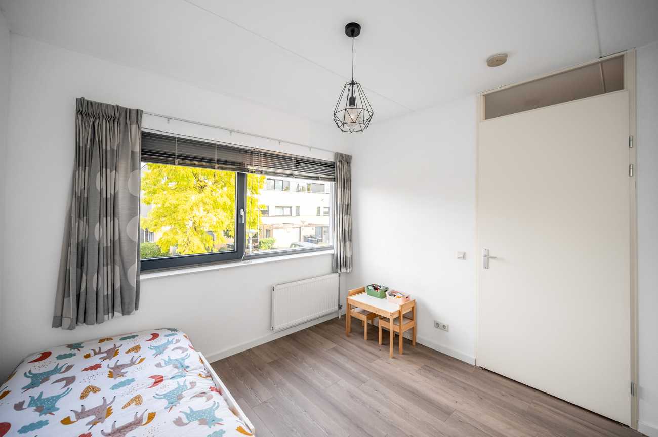 You can park on your own property in front of the house. From here, you can access the brick storage room, where you can easily store your bicycles and other belongings. The entrance leads into the hallway with access to the toilet, meter cupboard, stairs to the first floor, and access to the living room. The spacious and extended living/dining room is wonderfully bright and inviting, with large windows and double doors leading to the garden. The modern open-plan kitchen at the front of the house is equipped with various built-in appliances, including a refrigerator, freezer, combination microwave, dishwasher, and a 5-burner gas cooktop with a wok burner. There’s also ample cupboard space, making cooking in this kitchen a pleasure. The entire ground floor has modern laminate flooring. The spacious under-stairs cupboard provides ample storage space, keeping everything nice and tidy.