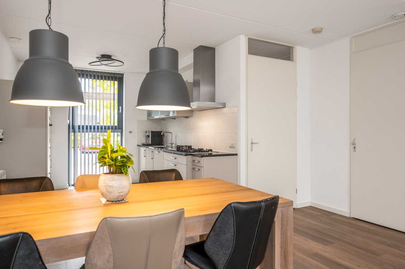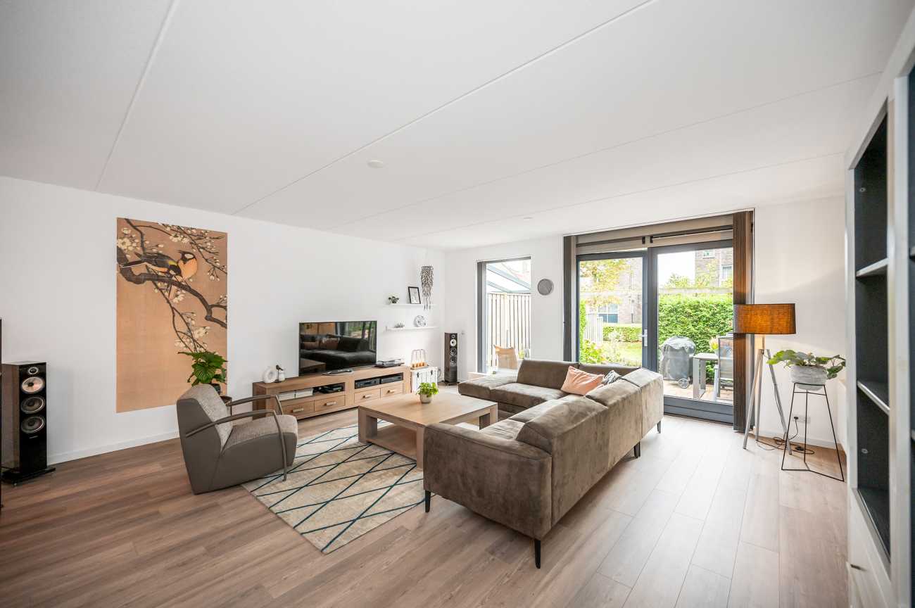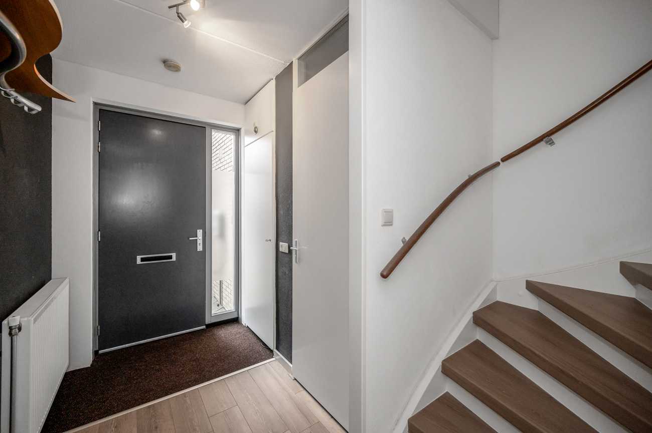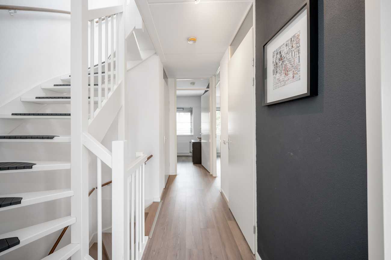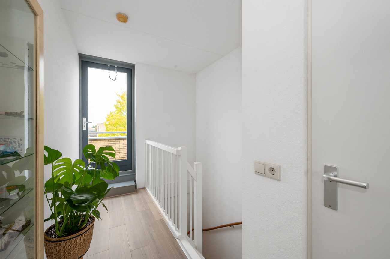 You can park on your own property in front of the house. From here, you can access the brick storage room, where you can easily store your bicycles and other belongings. The entrance leads into the hallway with access to the toilet, meter cupboard, stairs to the first floor, and access to the living room. The spacious and extended living/dining room is wonderfully bright and inviting, with large windows and double doors leading to the garden. The modern open-plan kitchen at the front of the house is equipped with various built-in appliances, including a refrigerator, freezer, combination microwave, dishwasher, and a 5-burner gas cooktop with a wok burner. There’s also ample cupboard space, making cooking in this kitchen a pleasure. The entire ground floor has modern laminate flooring. The spacious under-stairs cupboard provides ample storage space, keeping everything nice and tidy.