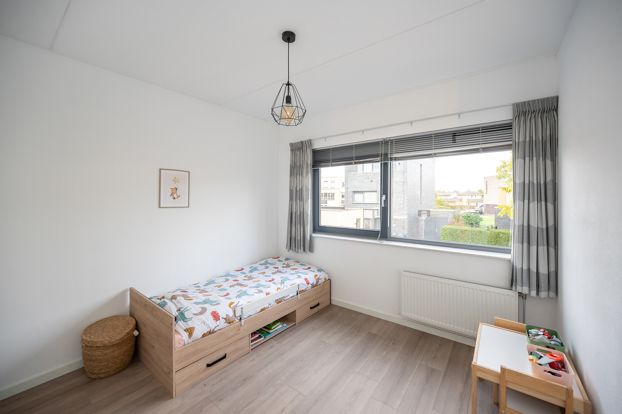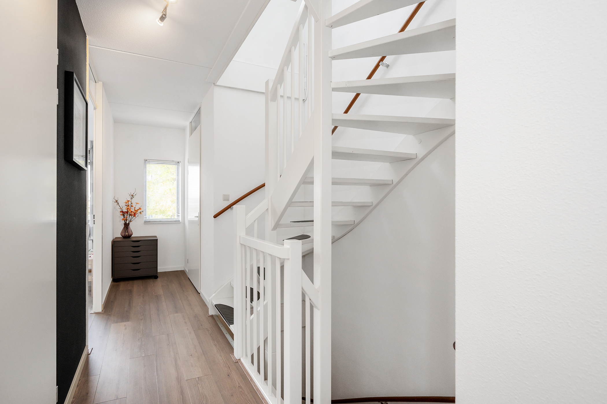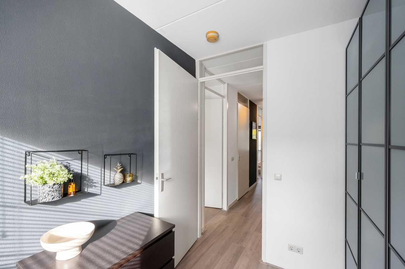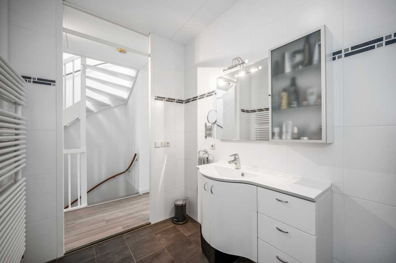 You can park on your own property in front of the house. From here, you can access the brick storage room, where you can easily store your bicycles and other belongings. The entrance leads into the hallway with access to the toilet, meter cupboard, stairs to the first floor, and access to the living room. The spacious and extended living/dining room is wonderfully bright and inviting, with large windows and double doors leading to the garden. The modern open-plan kitchen at the front of the house is equipped with various built-in appliances, including a refrigerator, freezer, combination microwave, dishwasher, and a 5-burner gas cooktop with a wok burner. There’s also ample cupboard space, making cooking in this kitchen a pleasure. The entire ground floor has modern laminate flooring. The spacious under-stairs cupboard provides ample storage space, keeping everything nice and tidy.