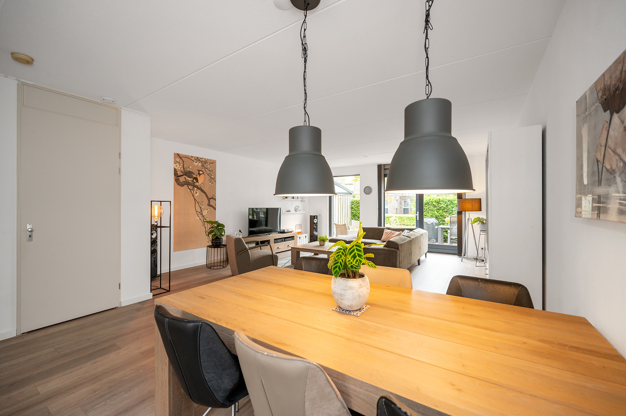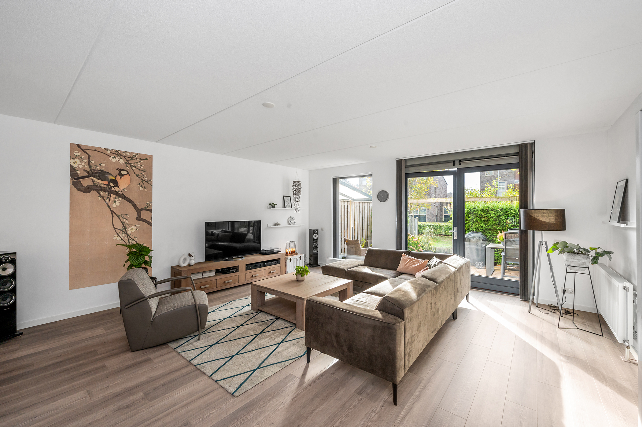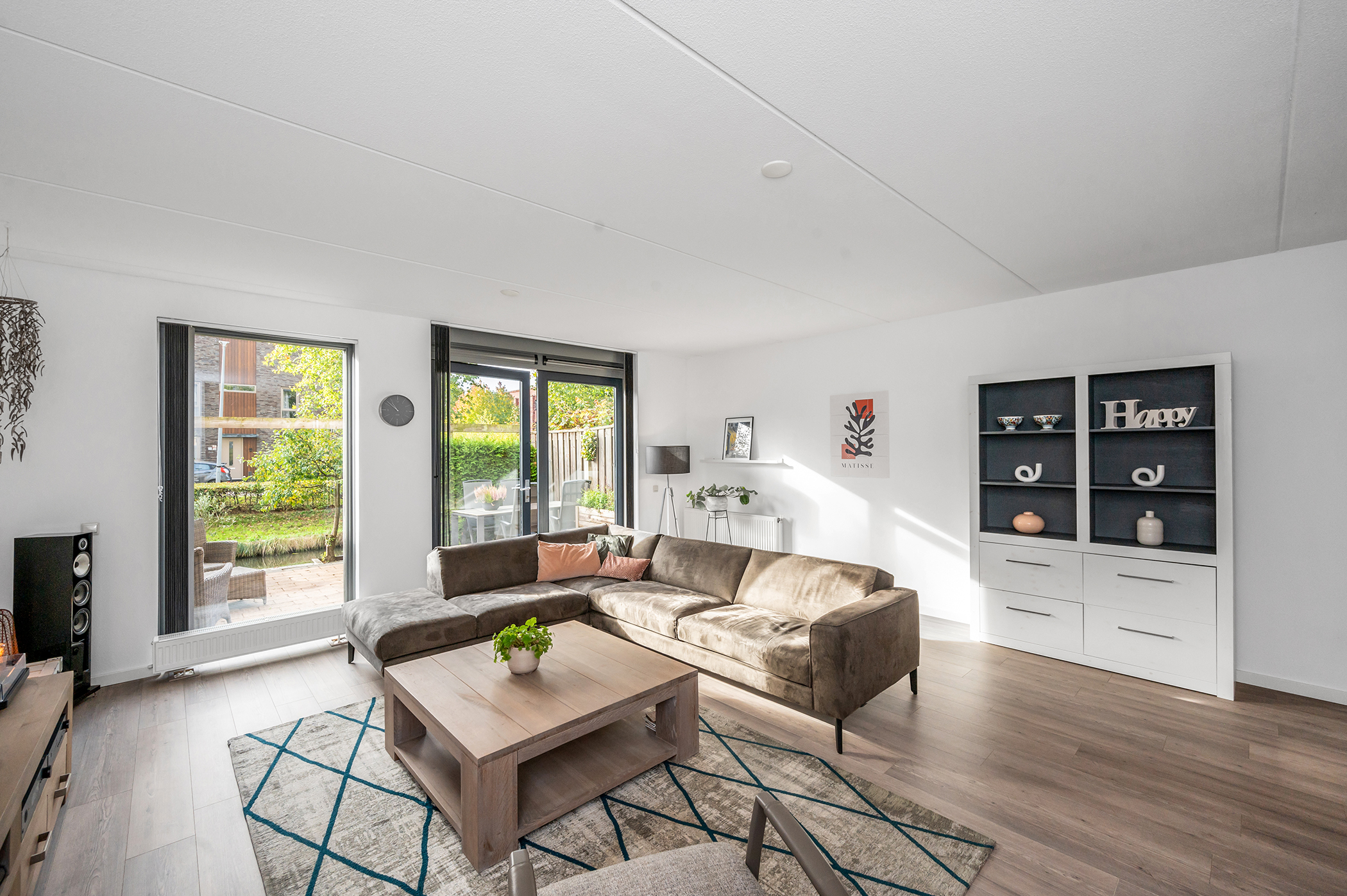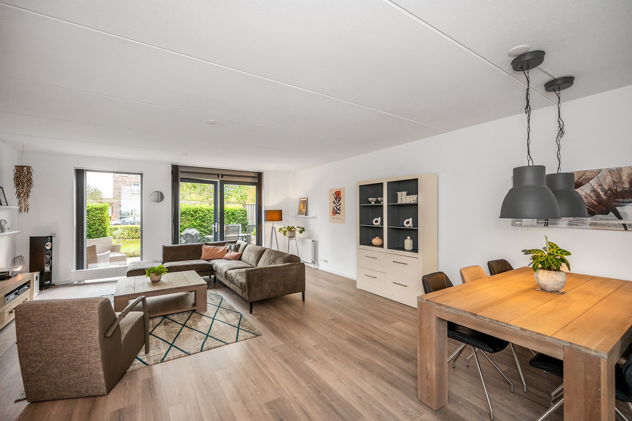 You can park on your own property in front of the house. From here, you can access the brick storage room, where you can easily store your bicycles and other belongings. The entrance leads into the hallway with access to the toilet, meter cupboard, stairs to the first floor, and access to the living room. The spacious and extended living/dining room is wonderfully bright and inviting, with large windows and double doors leading to the garden. The modern open-plan kitchen at the front of the house is equipped with various built-in appliances, including a refrigerator, freezer, combination microwave, dishwasher, and a 5-burner gas cooktop with a wok burner. There’s also ample cupboard space, making cooking in this kitchen a pleasure. The entire ground floor has modern laminate flooring. The spacious under-stairs cupboard provides ample storage space, keeping everything nice and tidy.