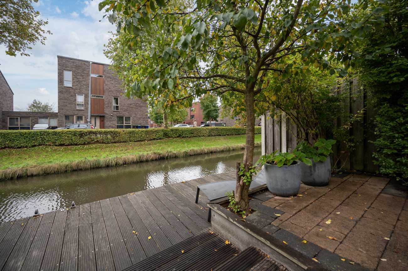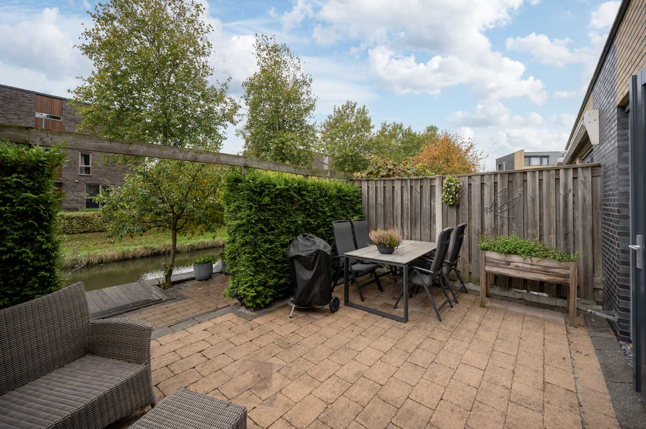 De achtertuin op het zuiden gelegen is een heerlijke plek om te genieten en biedt u veel zonuren. De tuin is fraai aangelegd met sierbestrating en een vlonder met aanlegsteiger. Er zijn meerdere terrassen, waardoor u hier ook beschut en met voldoende privacy kunt ontspannen. Niet te vergeten is de fantastische ligging aan het vaarwater; dit is de perfecte plek voor lange zomeravonden of een boottochtje vanuit uw eigen tuin!